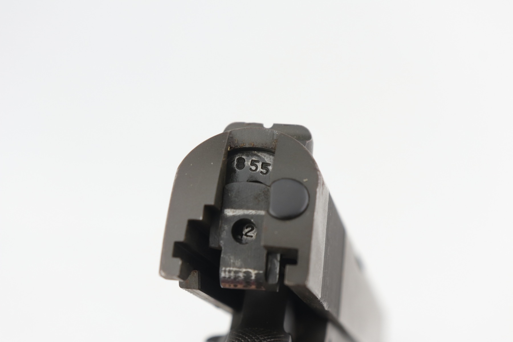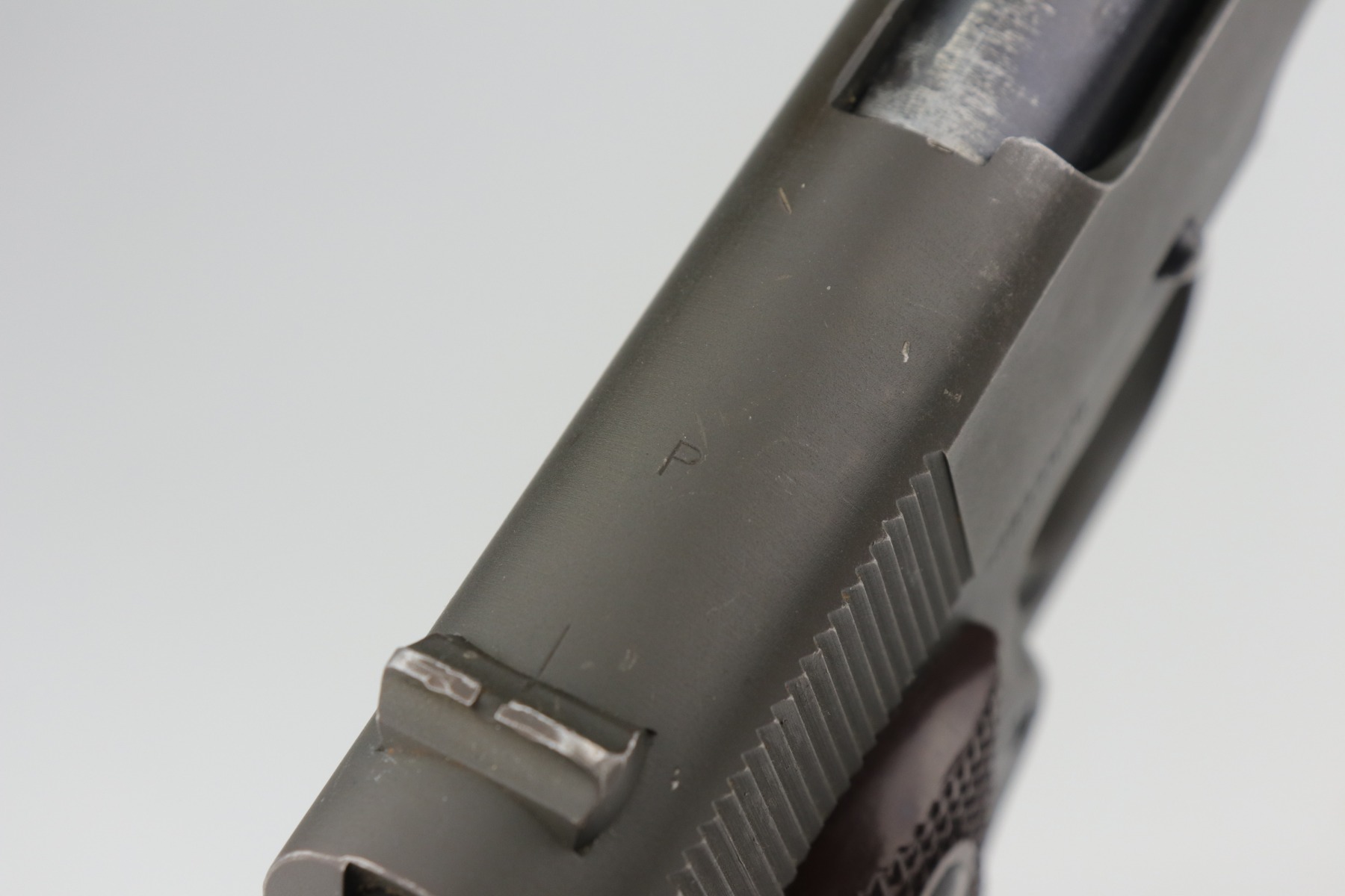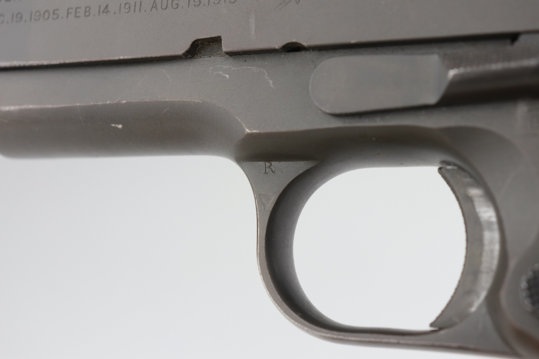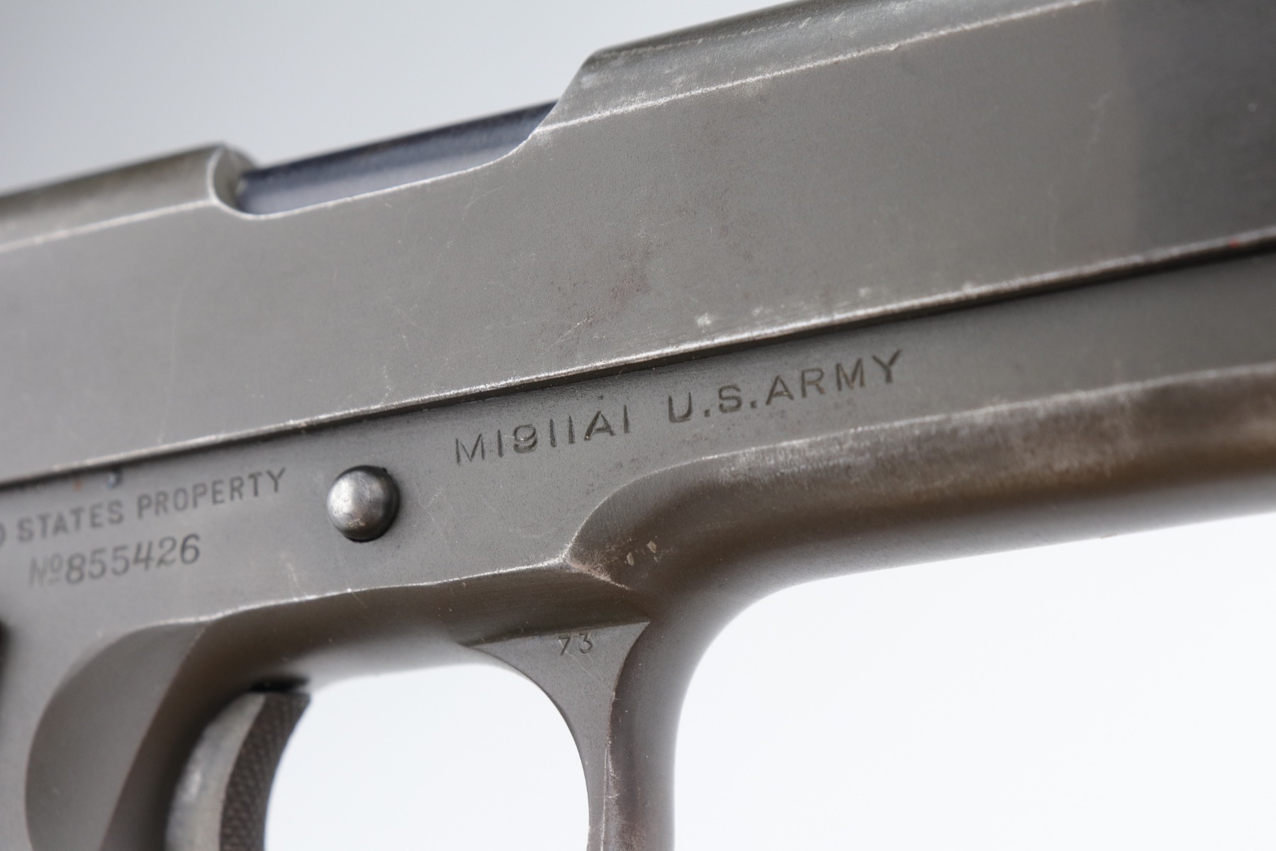 12/30/22 – This is a very nice example of a Colt 1911A1 issued to the US military in 1942. It is all correct and has a “United States Property” marking and a military cross canon cartouche. It has a Colt .45 barrel with a large “G” under the lug. The slide is numbered and matches the frame. It has retained about 90% of its parkerized finish. There is minor wear around the muzzle, high edges, underside of the frame, and front strap. There is some spotty wear on the top of the slide. There is patina on the front strap. It comes with excellent grips and a proper magazine. The bore is excellent -shiny with strong rifling.