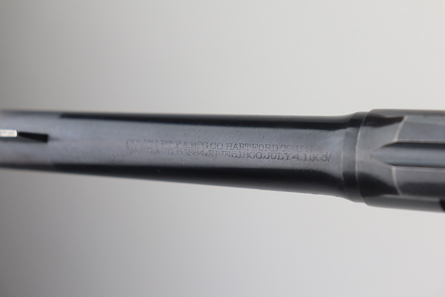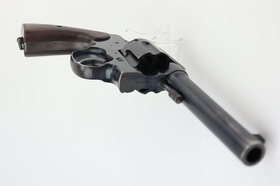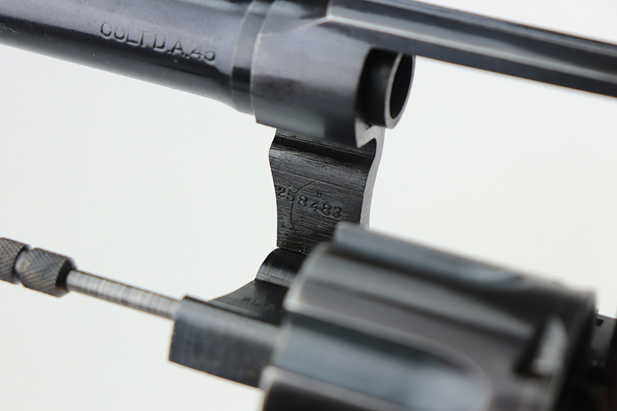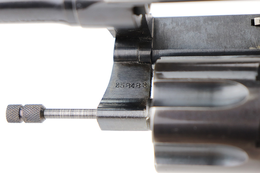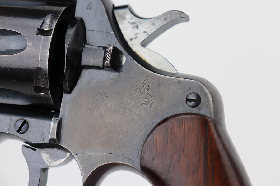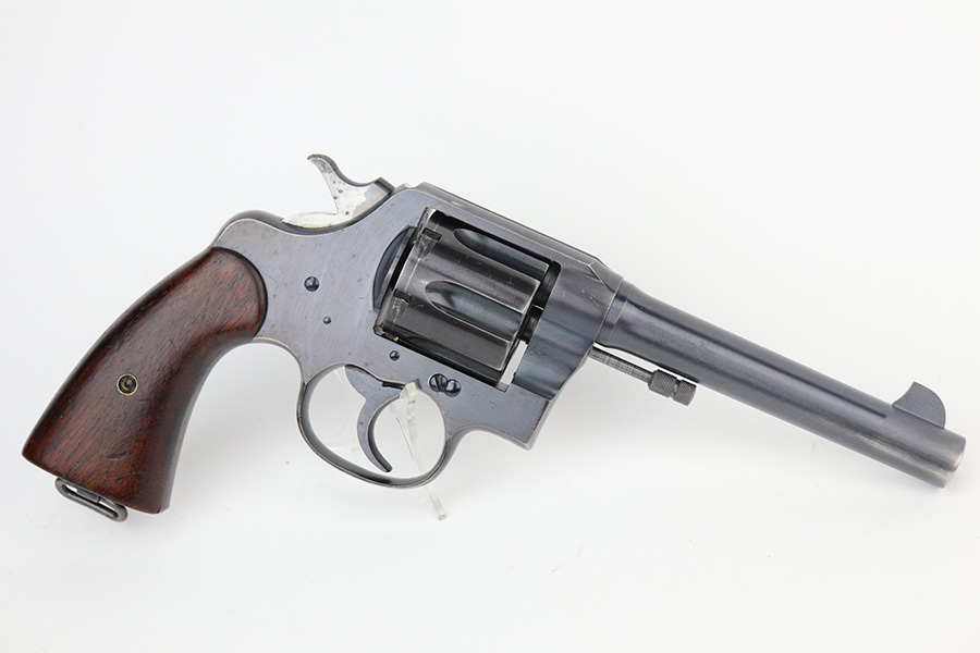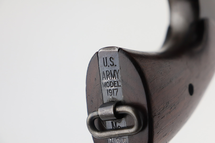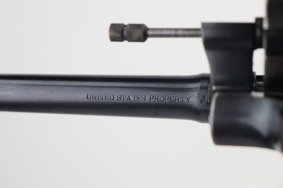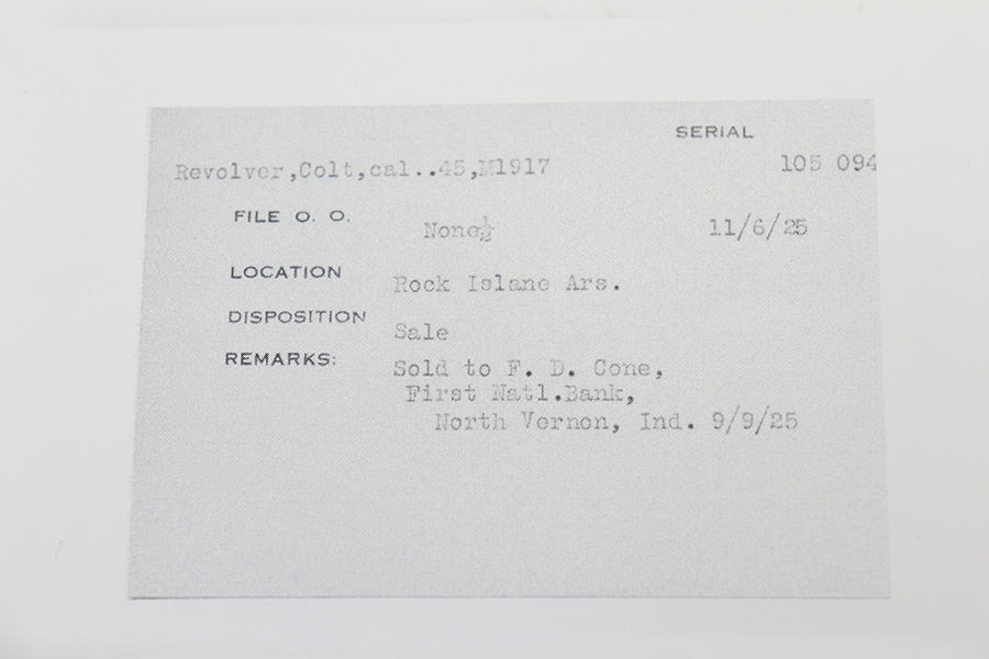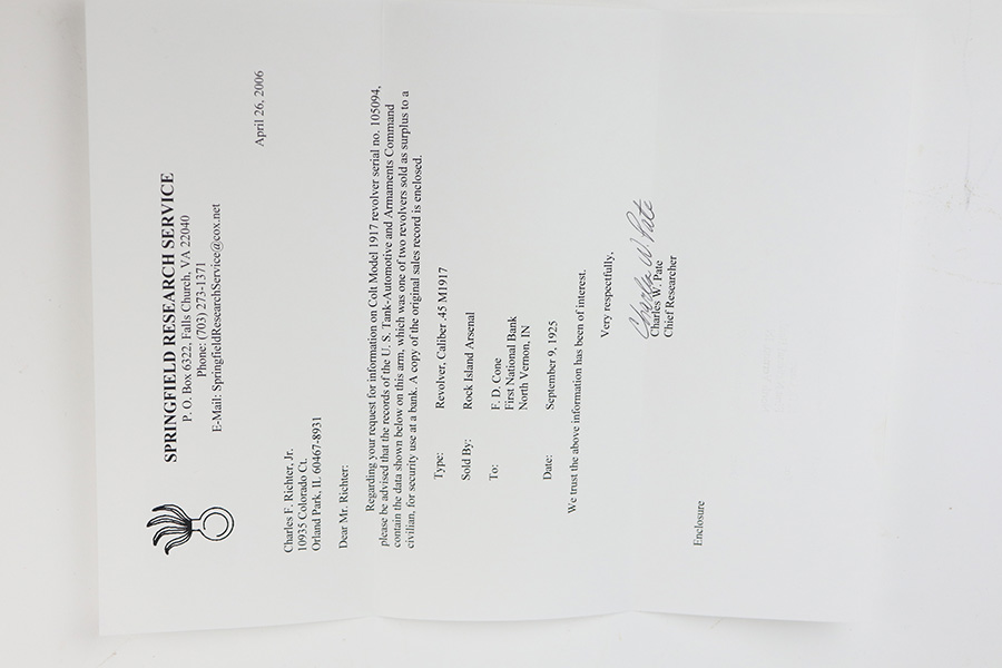 6/18/21 – This is a nice, honest example of a Colt M1917 revolver that was issued to US Army at the end of WWI. All original with most of the wear on the left side of frame and also the grip frame. Grips are hand numbered and matching to the revolver. Smooth mechanics. Excellent bore. United States Property marked barrel with Springfield S/20 inspectors mark on frame. Comes with a letter from the Springfield Research Service which shows the gun was later sold as surplus to a civilian for security use at a bank in Indiana.