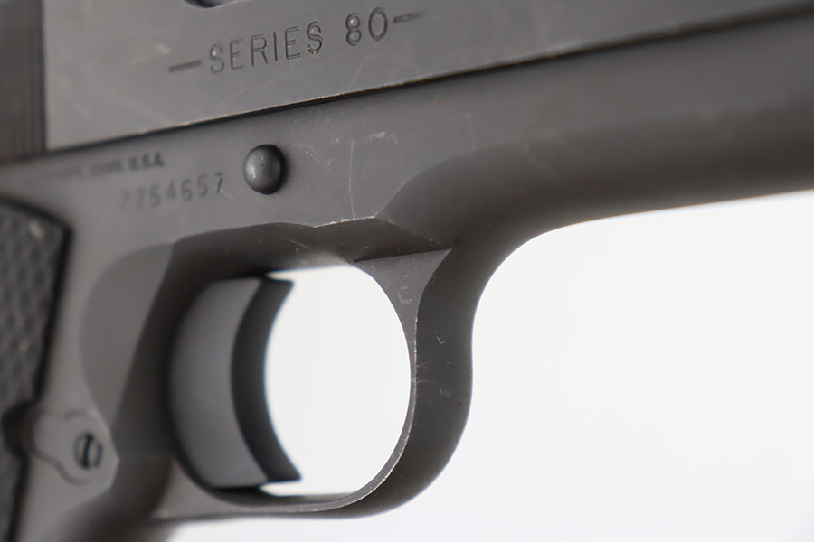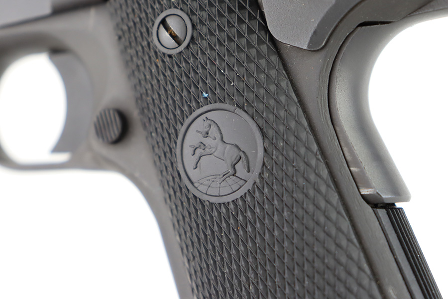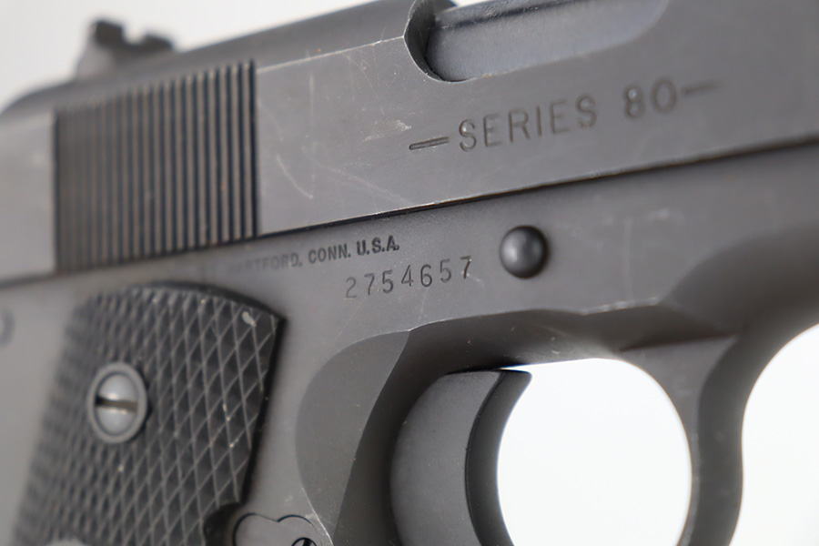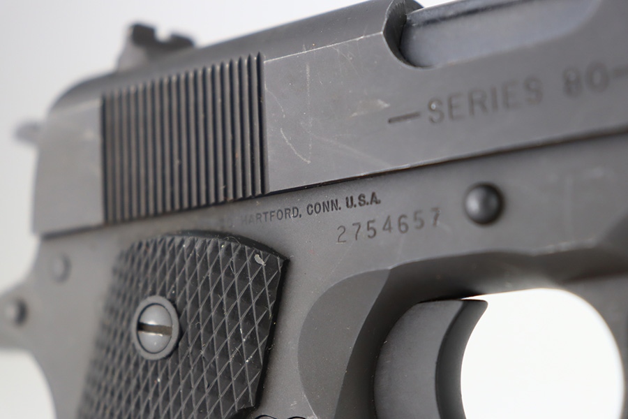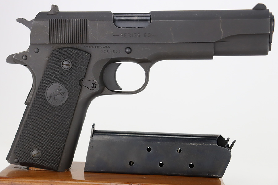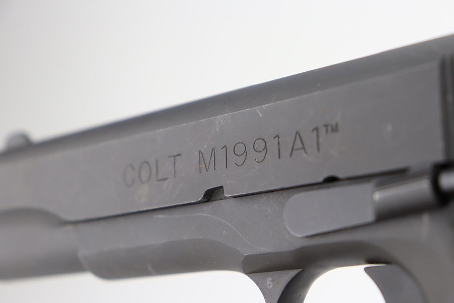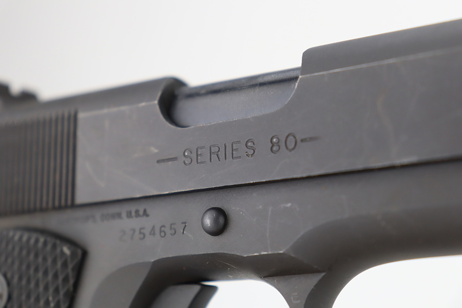 12/13/23 – This is a Colt Model 1991A1 from the 1990’s, chambered in .45 ACP. It has retained nearly all of its matte black finish, but there are very light surface scuffs throughout. Fitted with black rubber grips. Comes with one proper magazine. Near-mint bore.