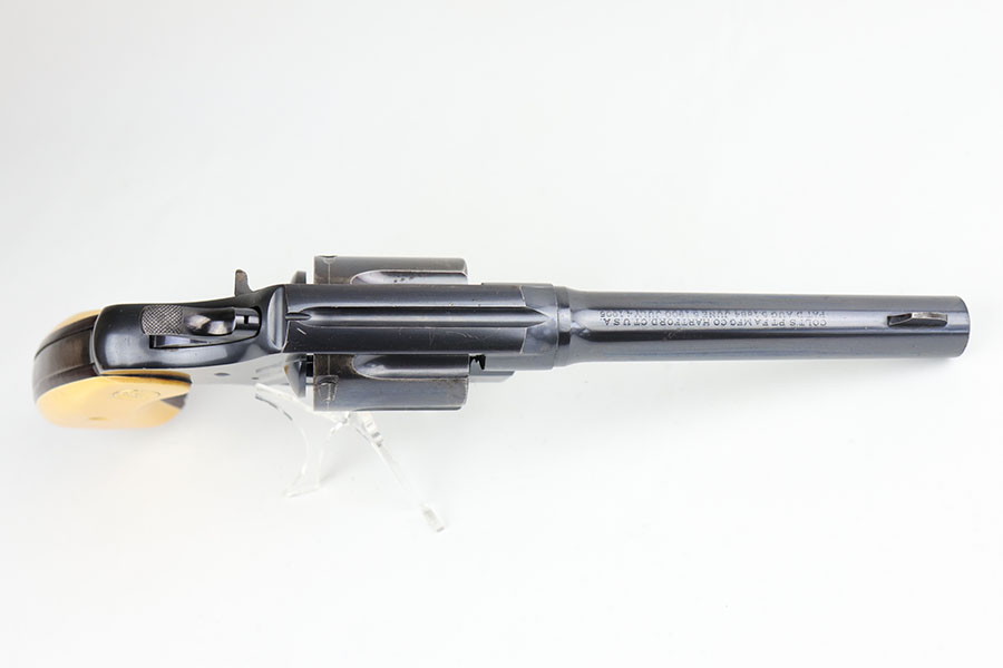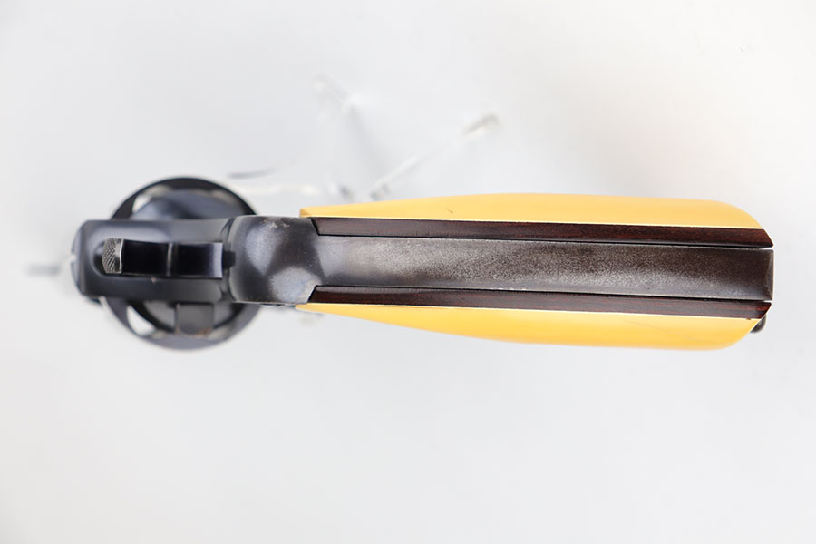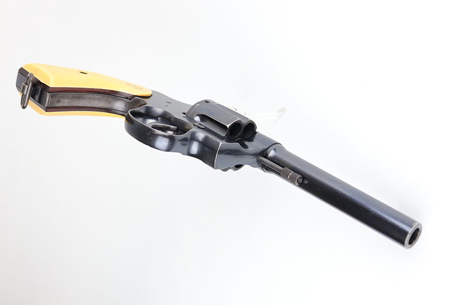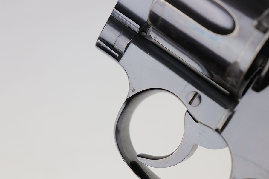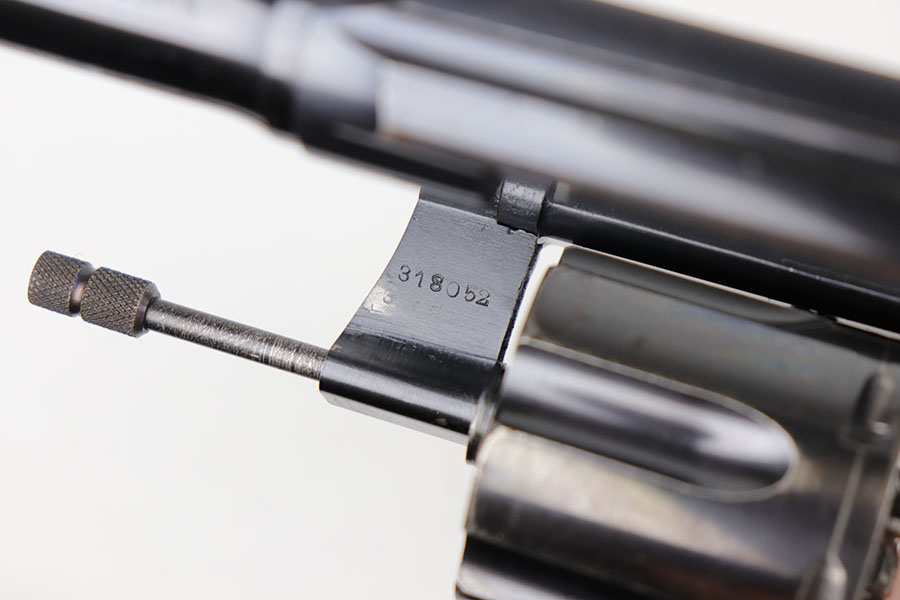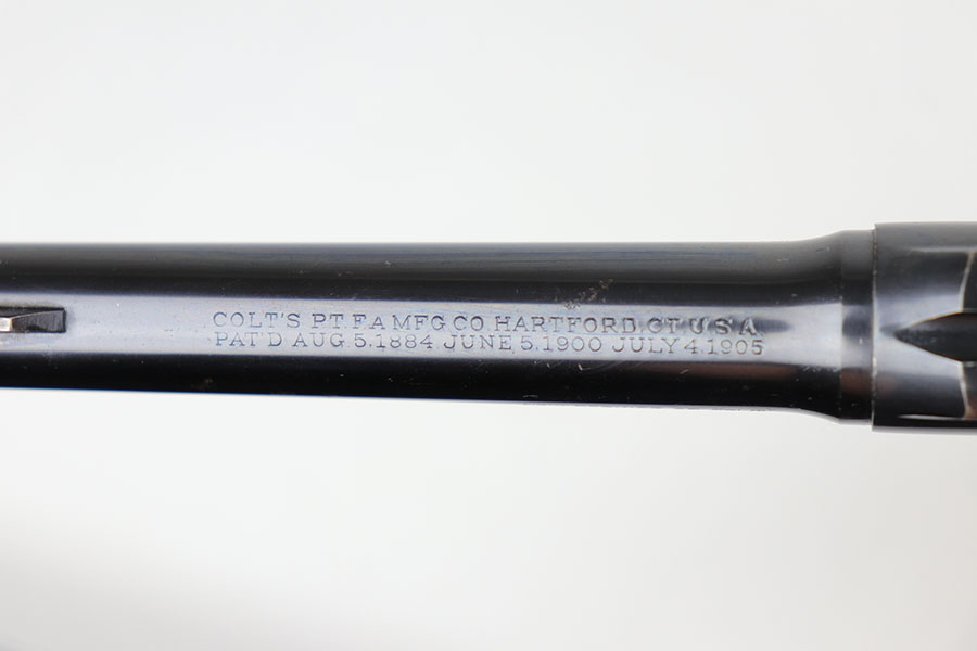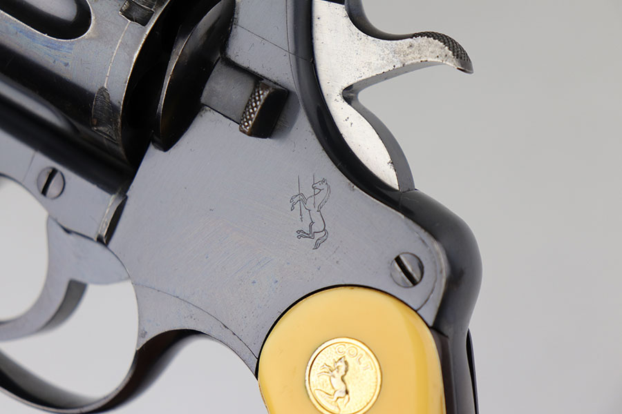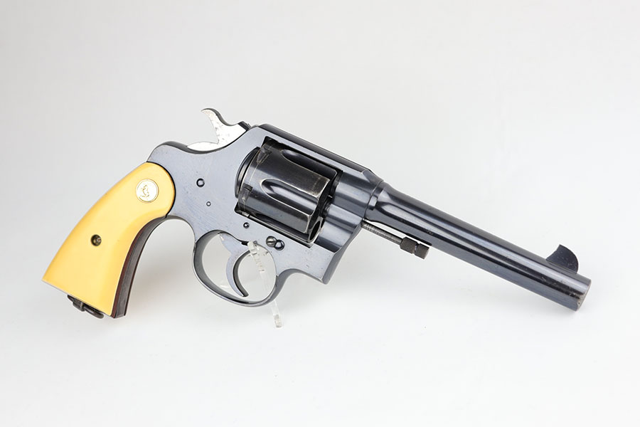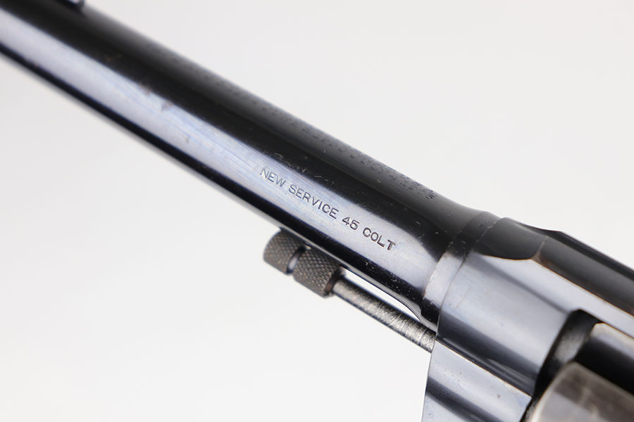6/23/20 – This is a nice example of a commercial Colt New Service revolver that was made in 1923. It’s got a 5.5 inch barrel with mint bore and mechanics. The beautiful Colt polished blue rates at about 90+% with some thinning/patina on the cylinder and muzzle, but most of the finish loss on the grip frame. Has a set of faux ivory grips with Colt medallion, and the left panel does have a crack in the lower corner.