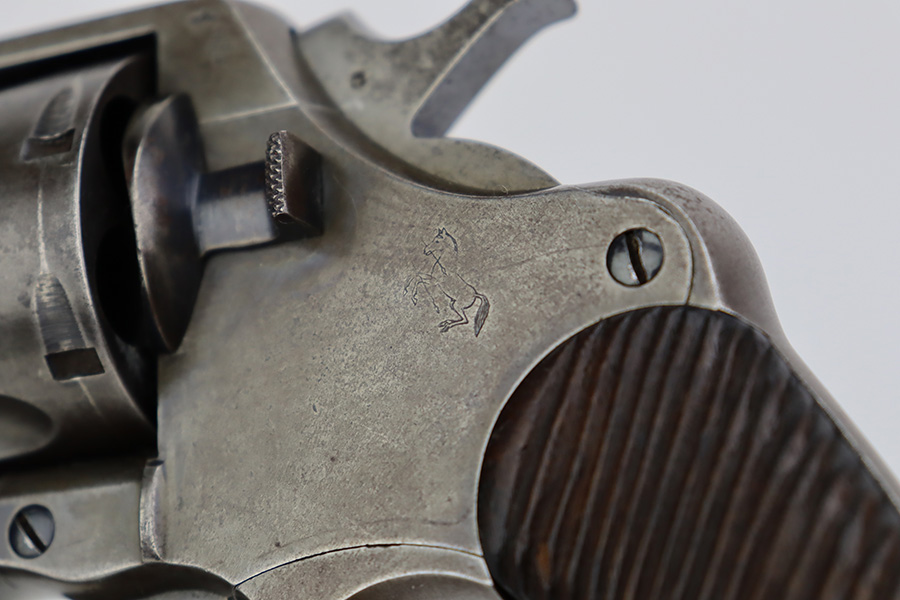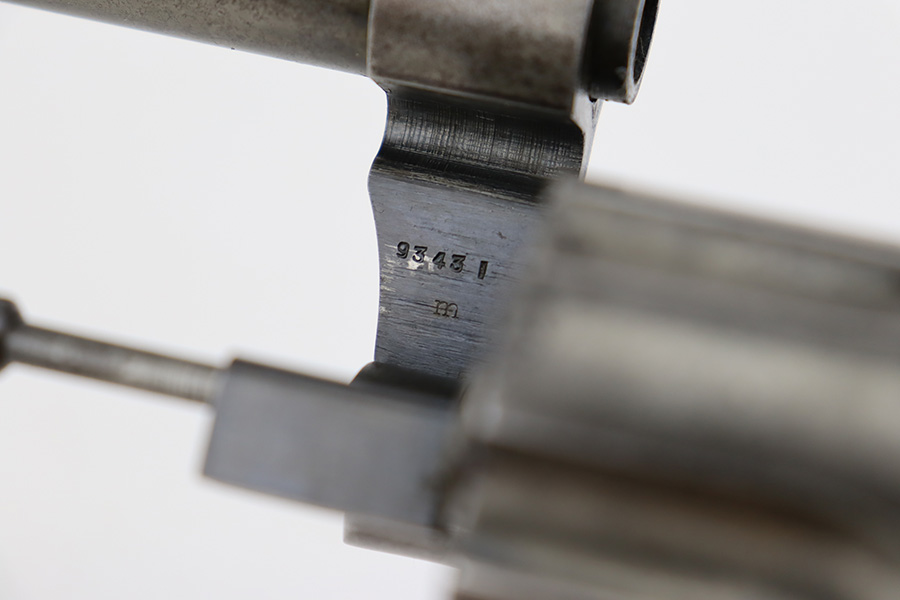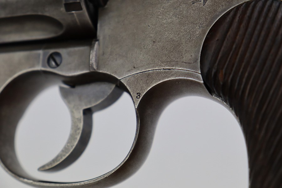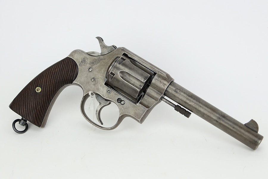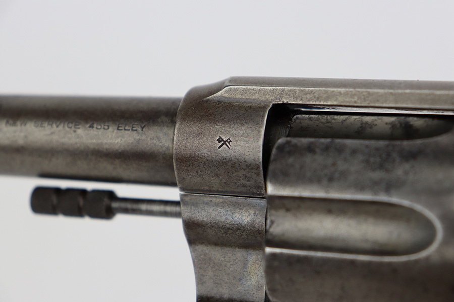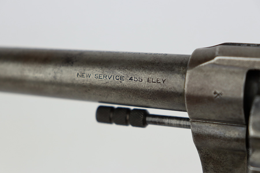 7/11/23 – This is a Colt New Service revolver from 1915 still chambered for the British .455 Eley cartridge. These revolvers were acquired by the British War Department during World War I, and they were popular with British officers. This one is all matching and has the proper British proofs throughout. It has lost virtually all of its finish with spotty oxidation and pin-pricking throughout. Fitted with carved wood grips. The bore is shiny with strong rifling for the most part, but there are some areas of rather heavy pitting. The cylinder is tight, and the action is smooth.