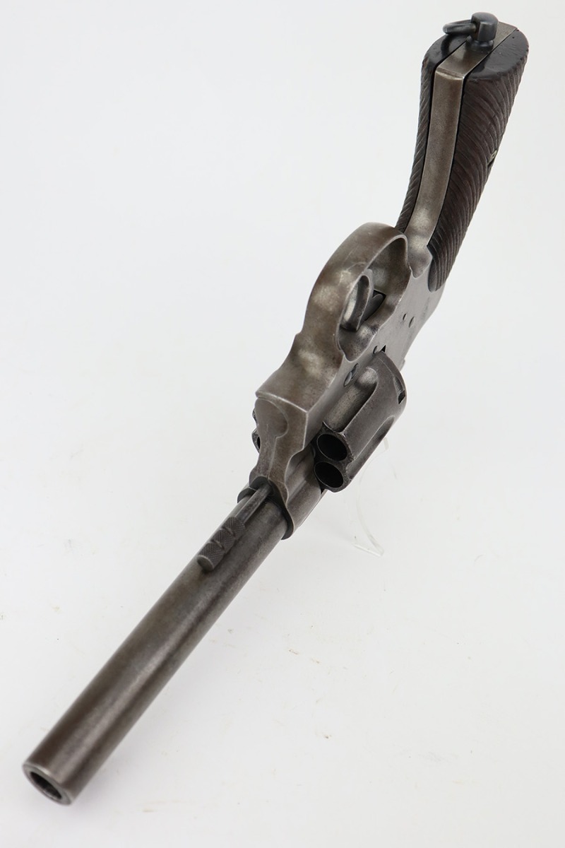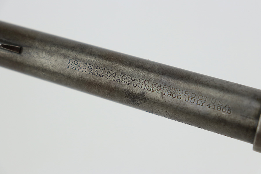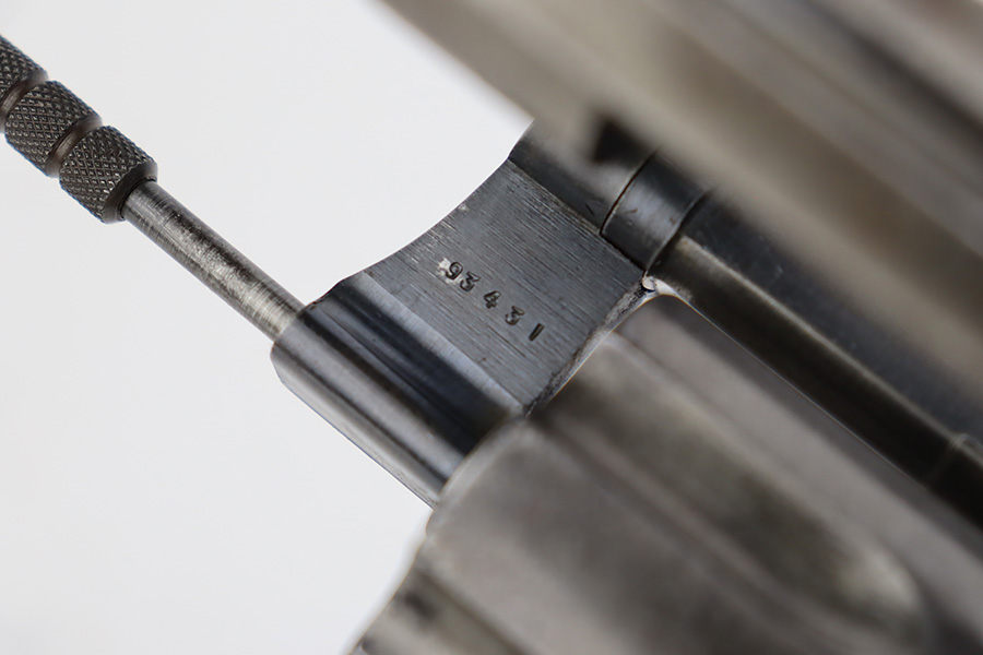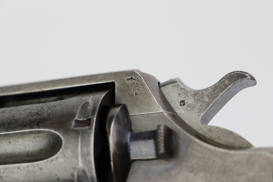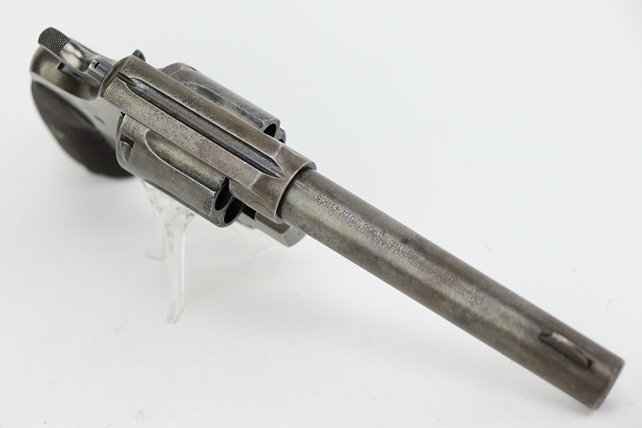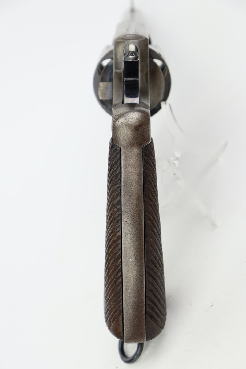 7/11/23 – This is a Colt New Service revolver from 1915 still chambered for the British .455 Eley cartridge. These revolvers were acquired by the British War Department during World War I, and they were popular with British officers. This one is all matching and has the proper British proofs throughout. It has lost virtually all of its finish with spotty oxidation and pin-pricking throughout. Fitted with carved wood grips. The bore is shiny with strong rifling for the most part, but there are some areas of rather heavy pitting. The cylinder is tight, and the action is smooth.