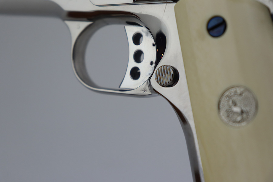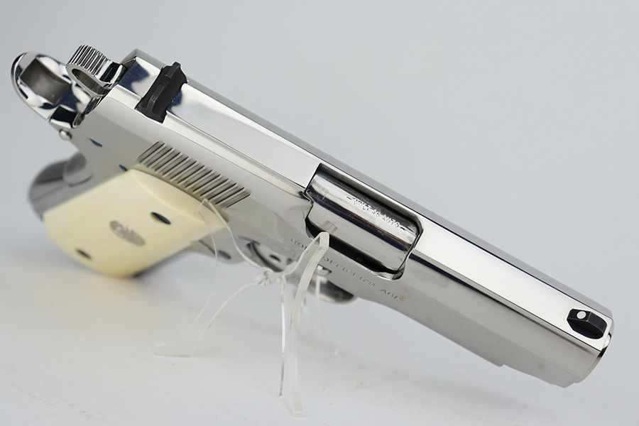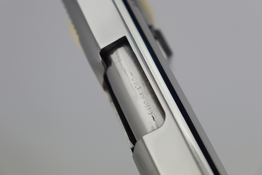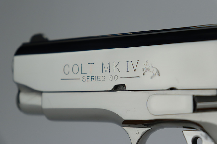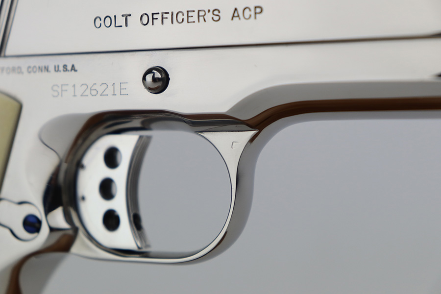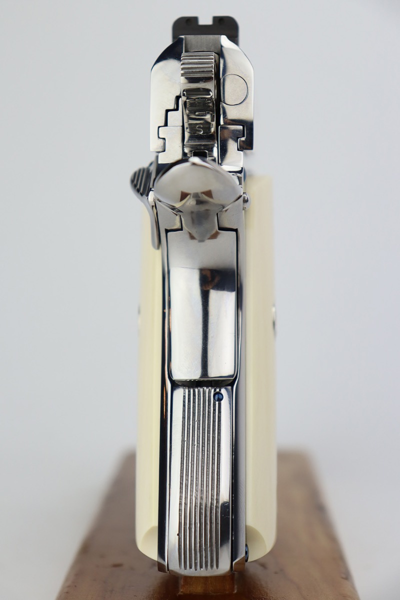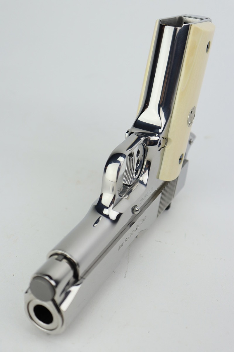 8/18/23 – This is a near-mint example of a nickeled Colt Officer’s ACP MK IV Series 80, manufactured in 1995 and chambered in .45 ACP. The gun is almost mint with almost no sign of wear or use, there are just a few tiny surface scratches here and there. Some of the small parts and screws are fire-blued. Fitted with beautiful faux ivory grips. The bore is like-new.