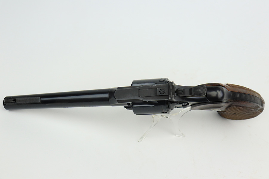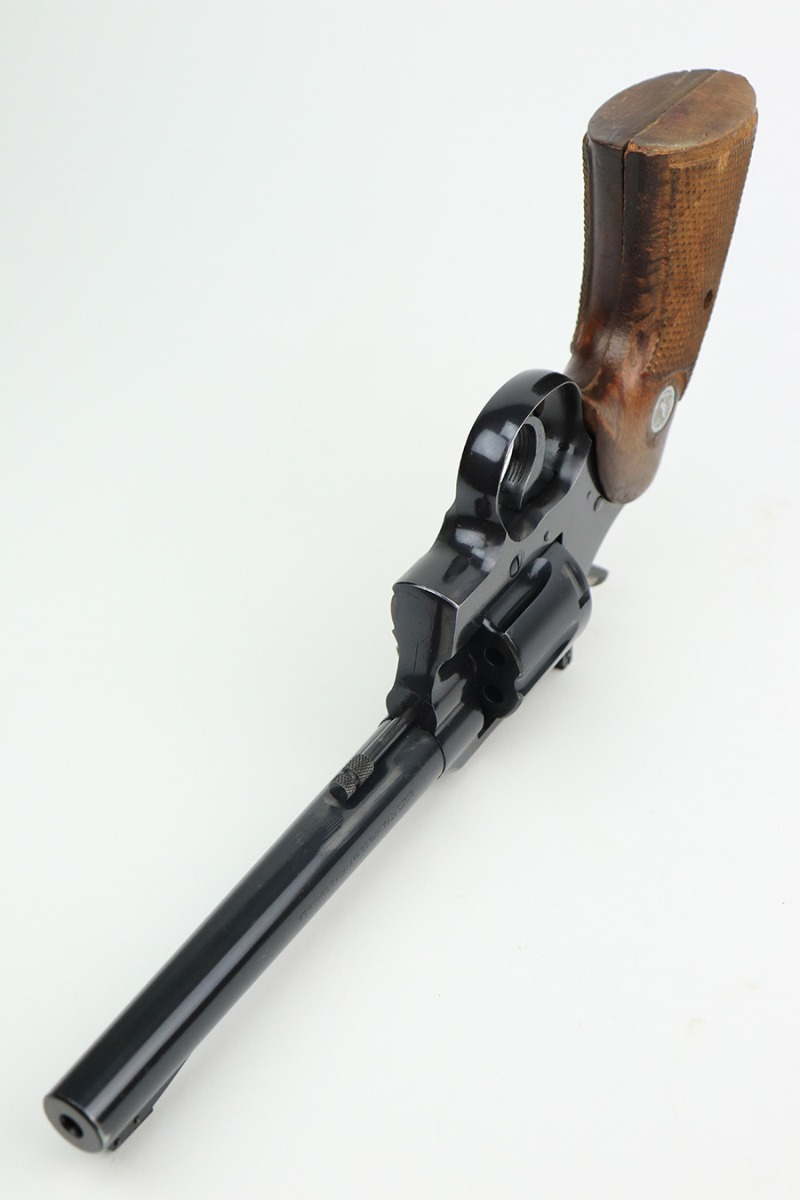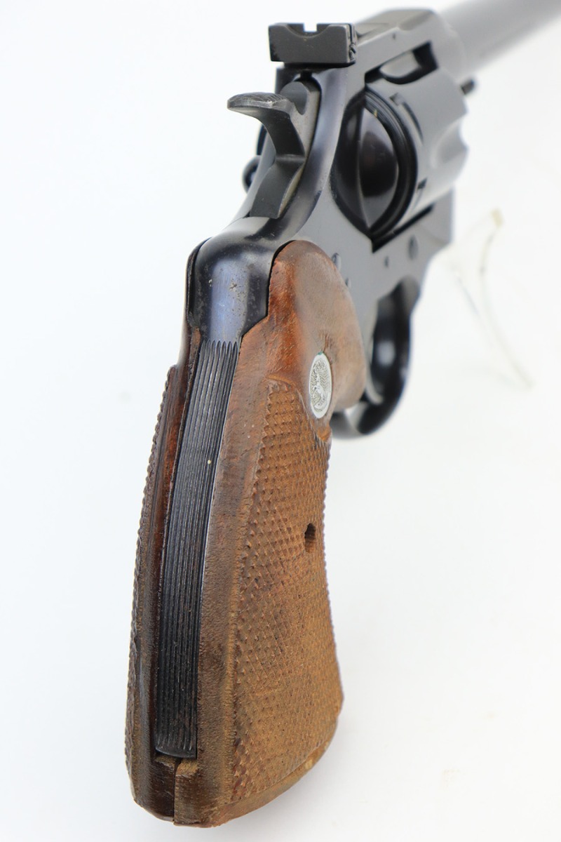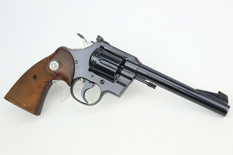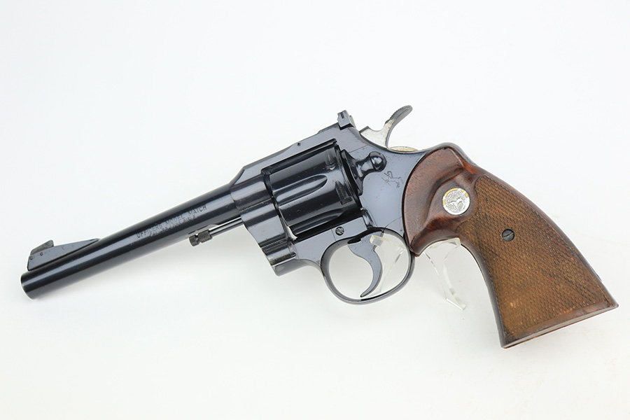 5/23/22 – This is a near-mint example of a Colt Officers Model Match Revolver, manufactured in 1961. It is all matching, has a 6 inch barrel, and is chambered in .22 LR. It has retained nearly all of its original high polish Colt bluing with just a hint of wear around the muzzle and a few tiny dots of discoloration on the right side of the frame. Barely even a roll mark on the cylinder. Comes with excellent wood grips. Mint bore. The bore is mint. Cylinder is tight and the action is smooth.