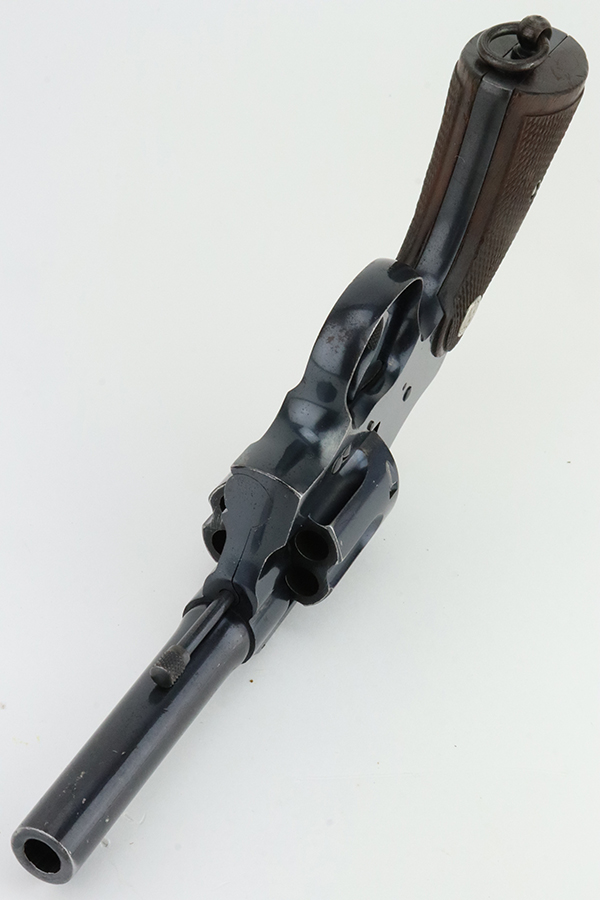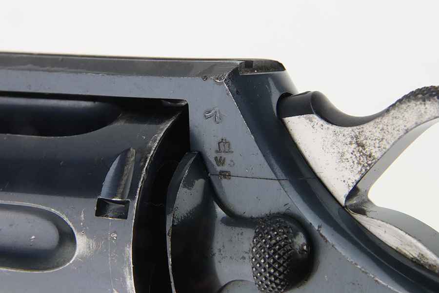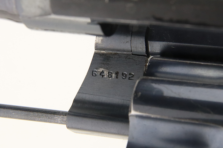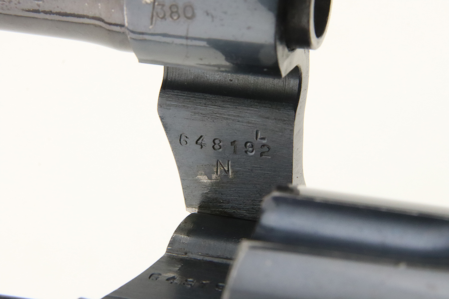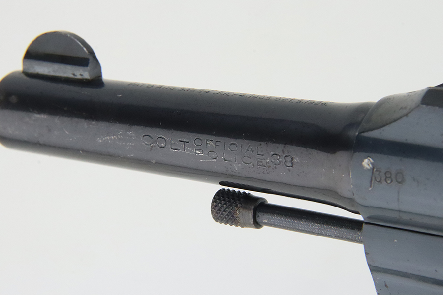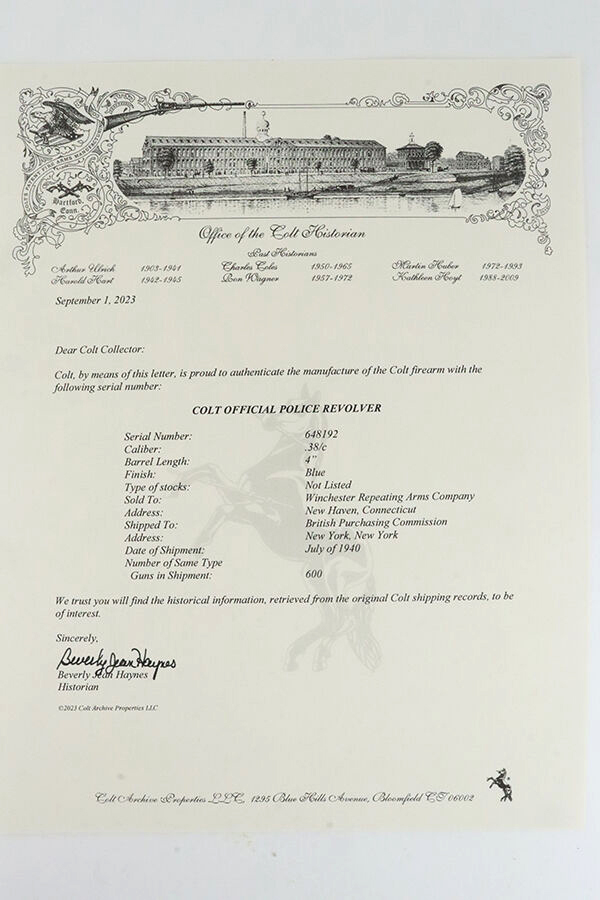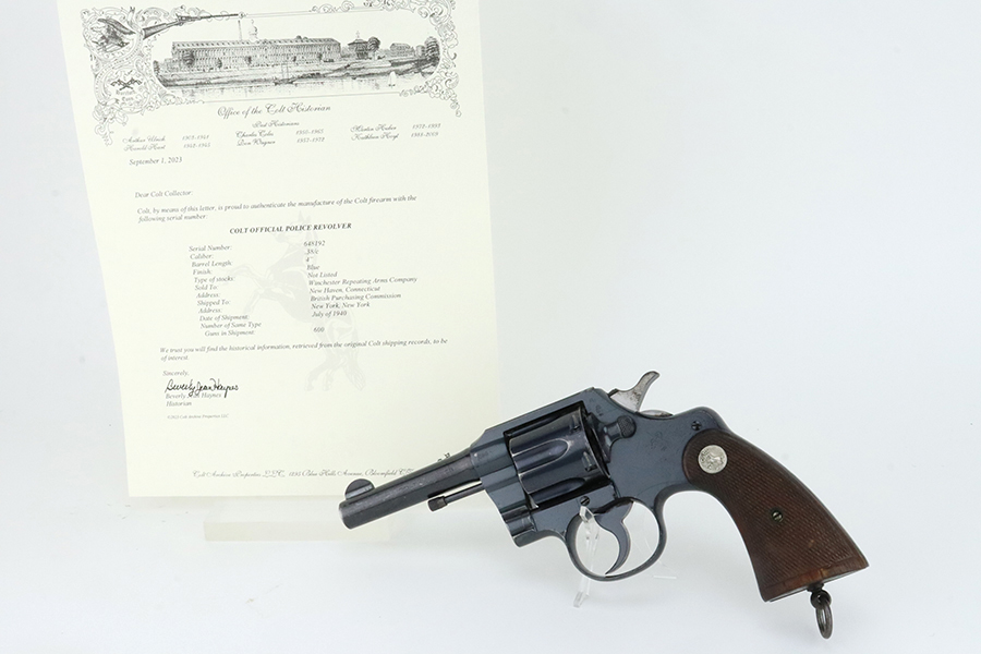 2/28/24 – This is an excellent example of a Colt Official Police Revolver from 1940. It is matching but has British proofs. According to the included Colt Factory Letter, it was shipped to the British Purchasing Commission in July of 1940, along with 600 other guns. It’s original high polish finish rates about 96% with minor muzzle wear, some high edge wear on the cylinder, light freckling on the frame, and some tiny scratches and handling marks throughout. Fitted with nice period-correct wood grips. Mint bore.