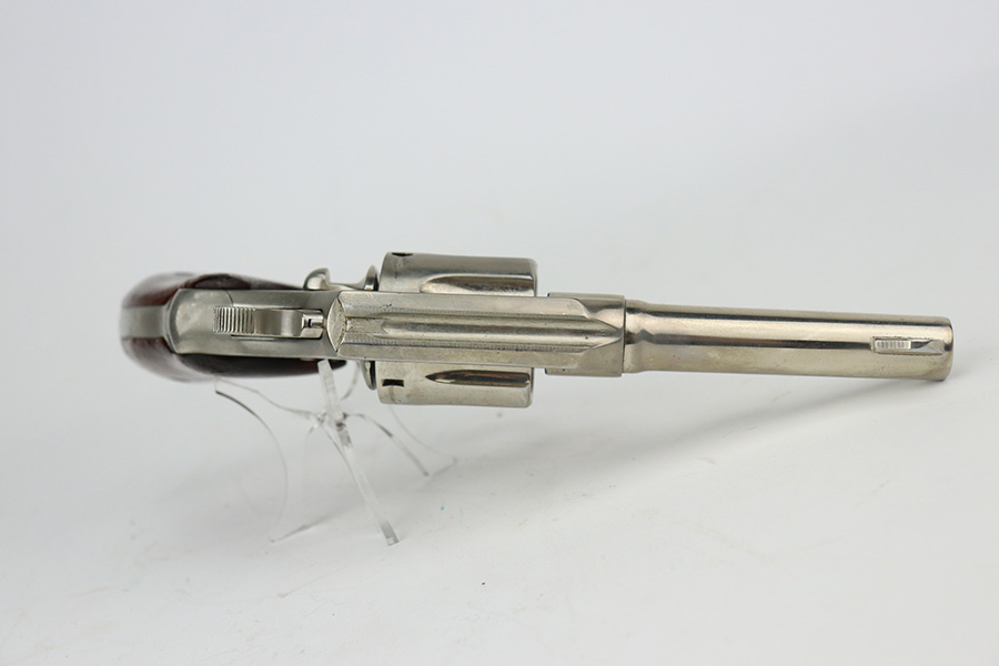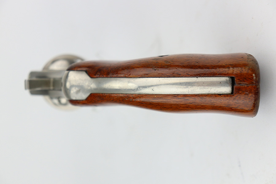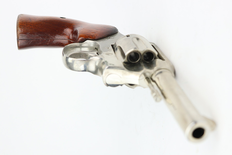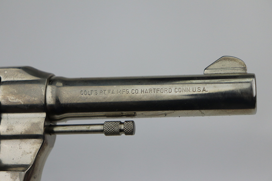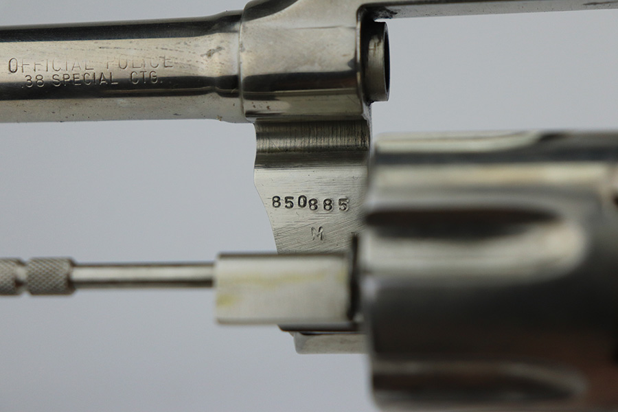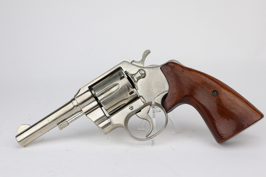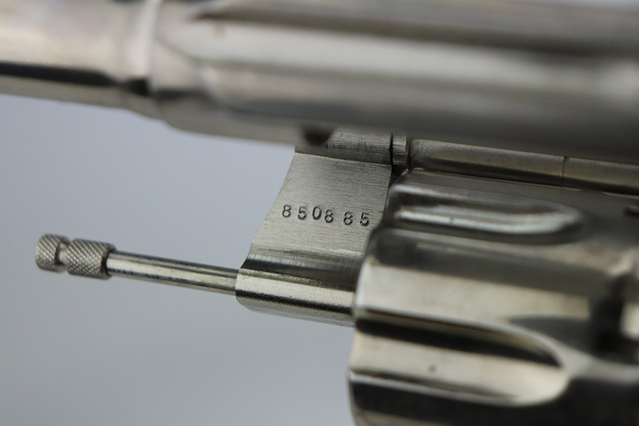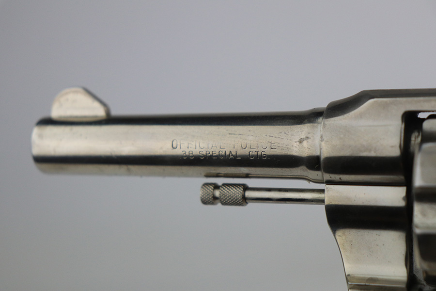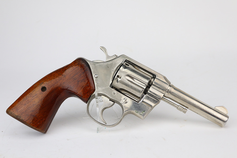 6/29/21 – This is a nice example of a Colt Official Police Revolver manufactured in 1956. The gun is all matching and comes with a police belt, complete with all of the pouches, a pair of handcuffs, and the original key. The gun has been nickel-plated. While it has retained virtually all of its nickel-plating, there is spotty dulling throughout, most noticeable on the cylinder, back strap, and right side of the frame. Light roll mark on the cylinder. Small handling marks throughout. The cylinder is tight and the action is smooth. Comes with nice aftermarket wood grip. The bore is excellent – shiny with strong rifling.
