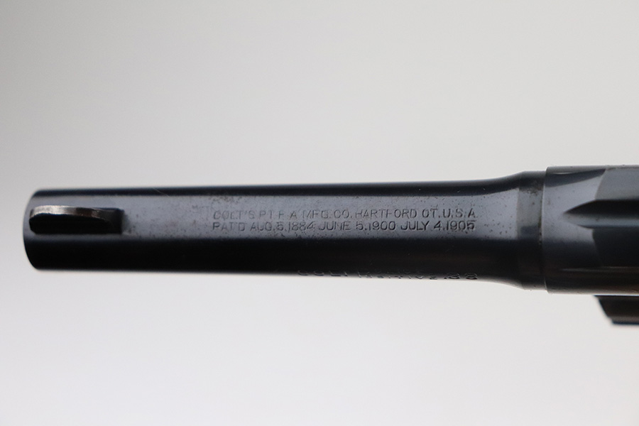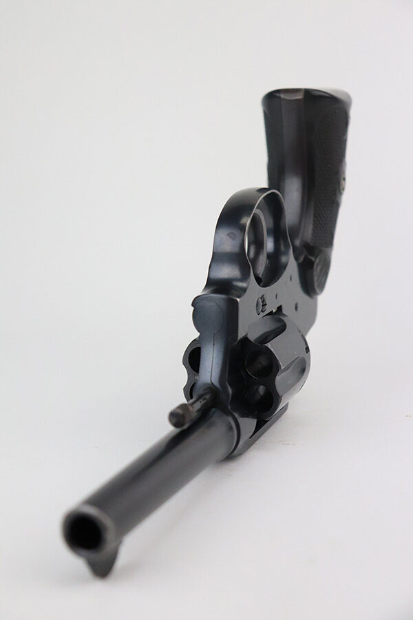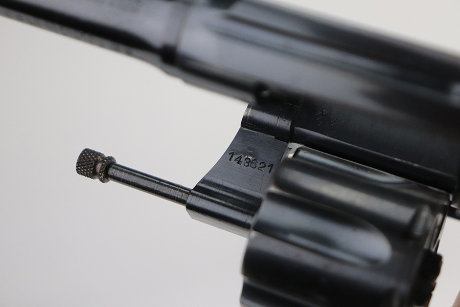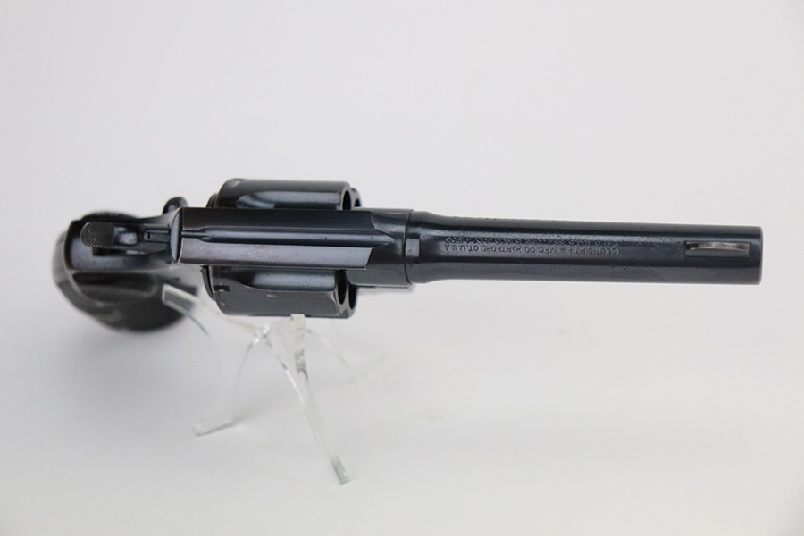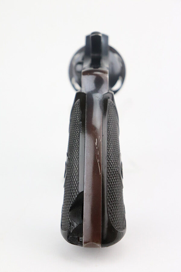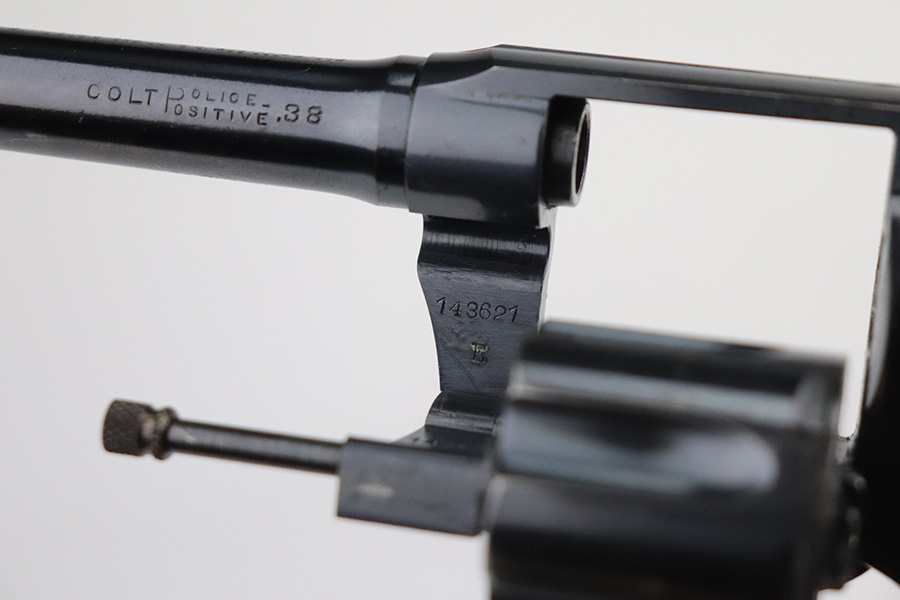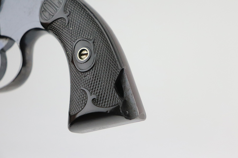 7/8/21 – This is a very nice example of a Colt Police Positive Revolver manufactured in 1922. It is chambered in .38 S&W, not .38 special, which makes it slightly rarer. It is matching and has retained about 97% of its original finish. There is minor muzzle wear, wear on the high edges of the cylinder, and a light roll mark on the cylinder. Dark brown patina and scratchy wear on the straps. There are tiny dots of oxidation throughout. Comes with nice black hard rubber grips – significant chip in the left panel. Minty bore. The cylinder is tight and the action is smooth.