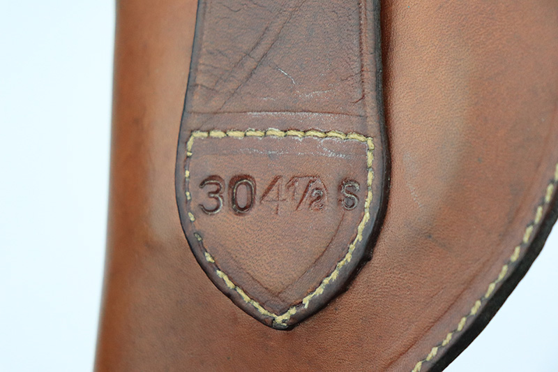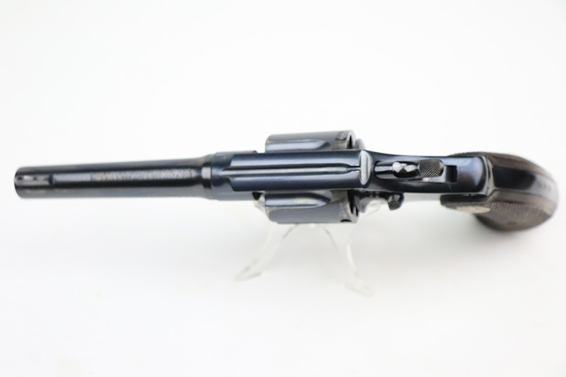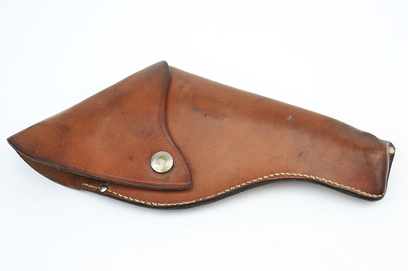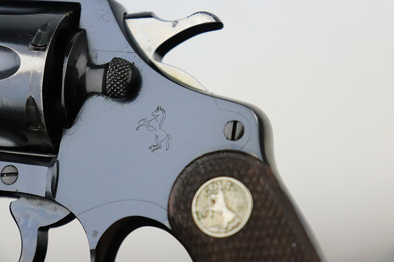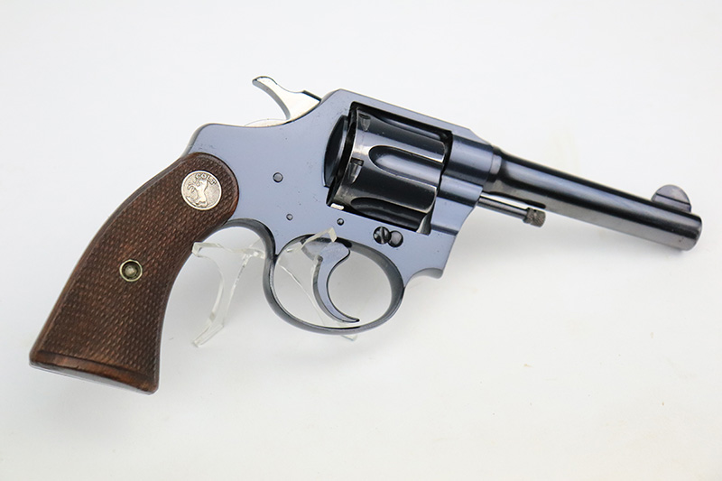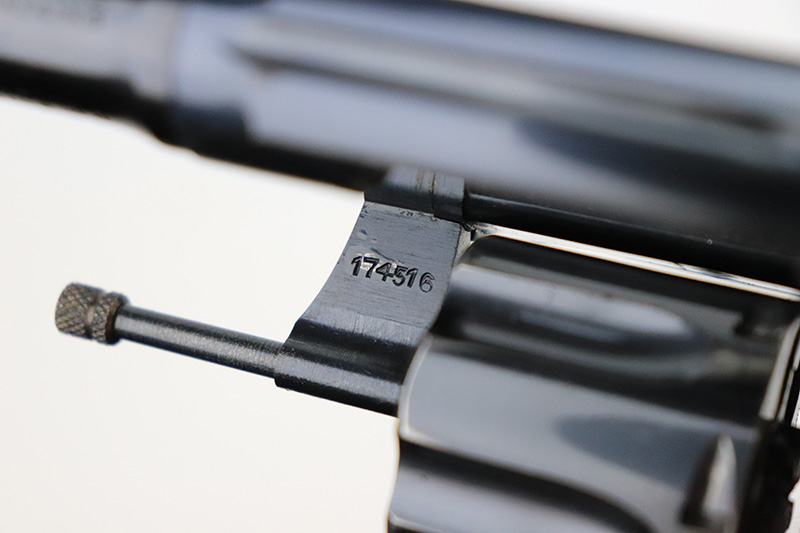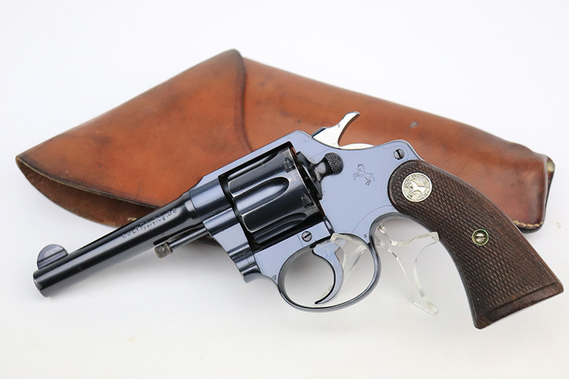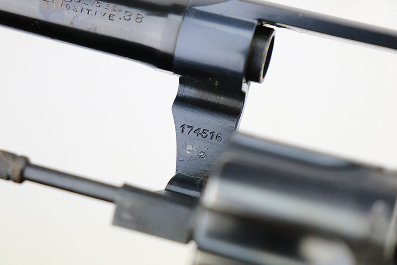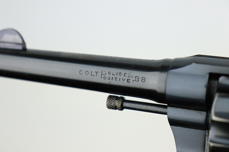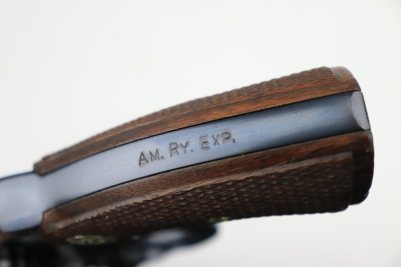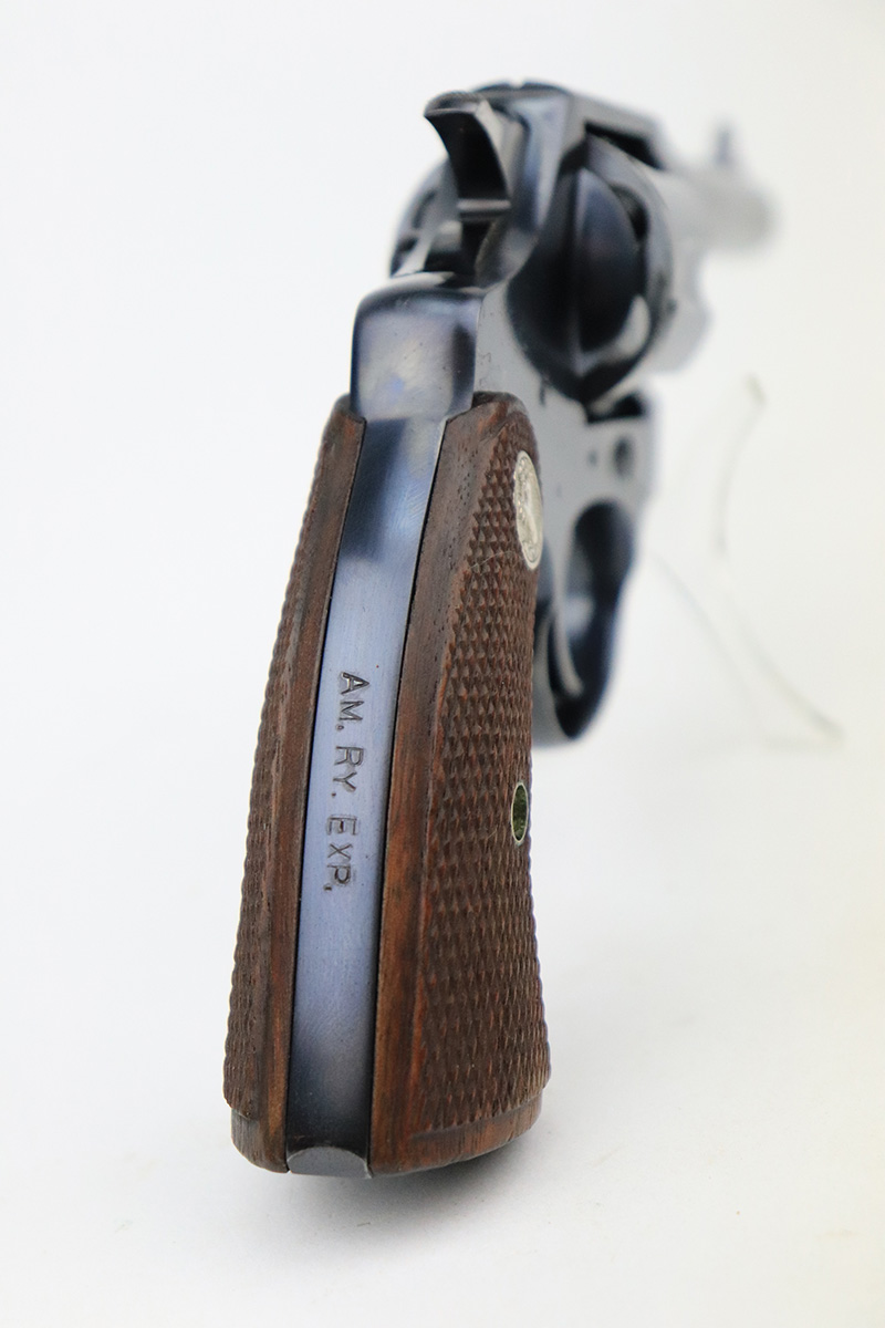 9/26/22 – This is a minty example of a Colt Police Positive Revolver issued to the Railway Express Agency in 1926. It is all matching and has the proper “AM. RY. EXP.” Railway Express Agency marking on the back strap. The gun also comes with a minty tan leather holster with “Railway Express Agency” on the back and a number that does not match the gun. The gun itself has retained about 97-98% of its original high polish Colt bluing. Very minor wear around the muzzle and high edges of the cylinder. Very light roll mark on the cylinder as well. Very nice original Colt wood grips – some tiny dings and chips along the bottom edges. The bore is mint. The cylinder is tight, and the action is very smooth.