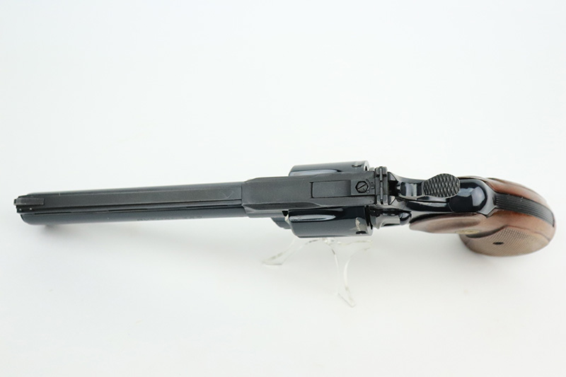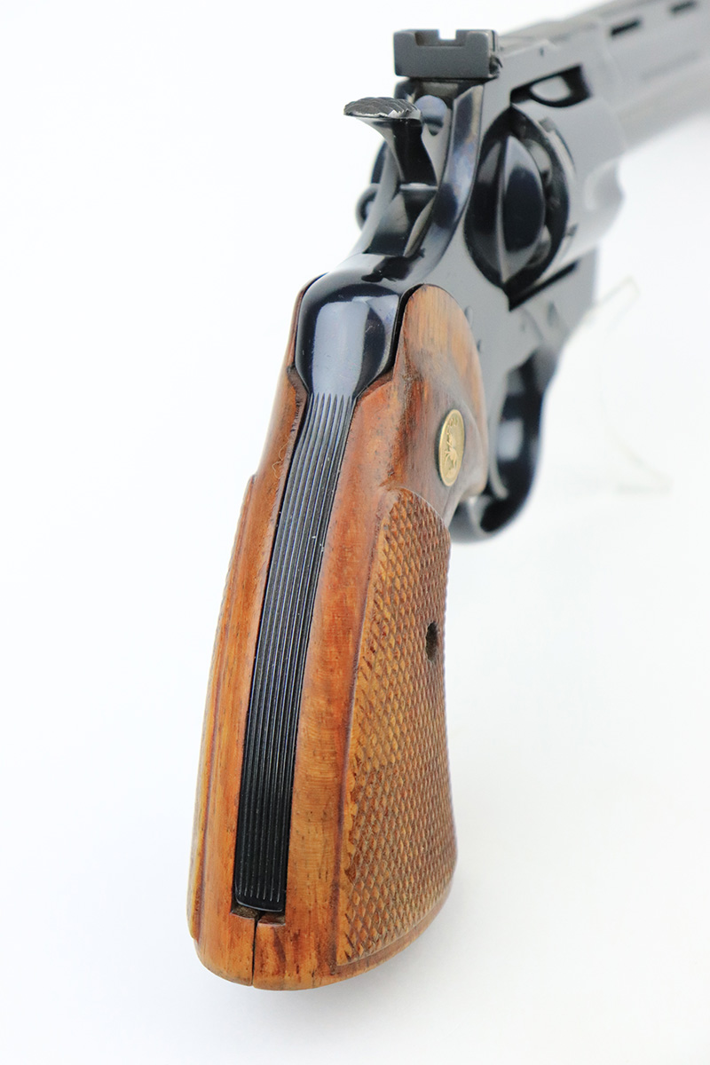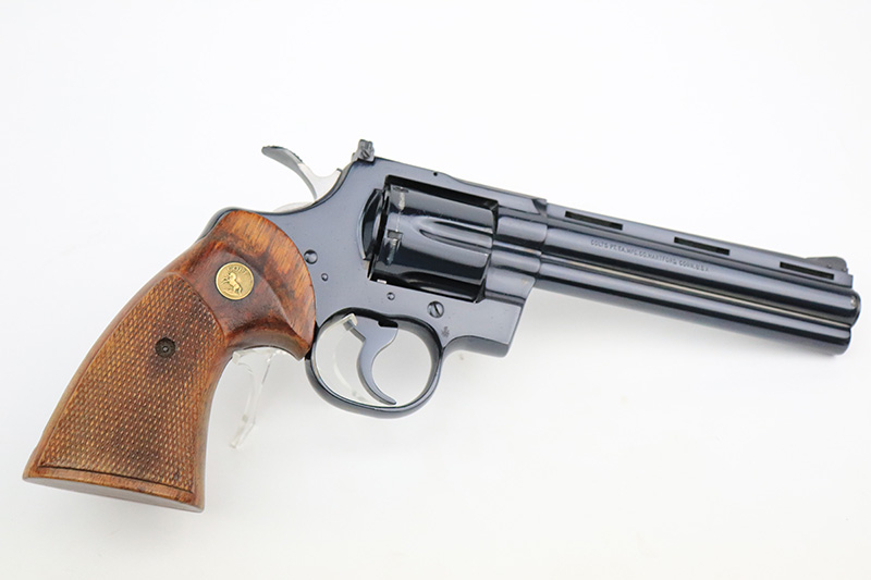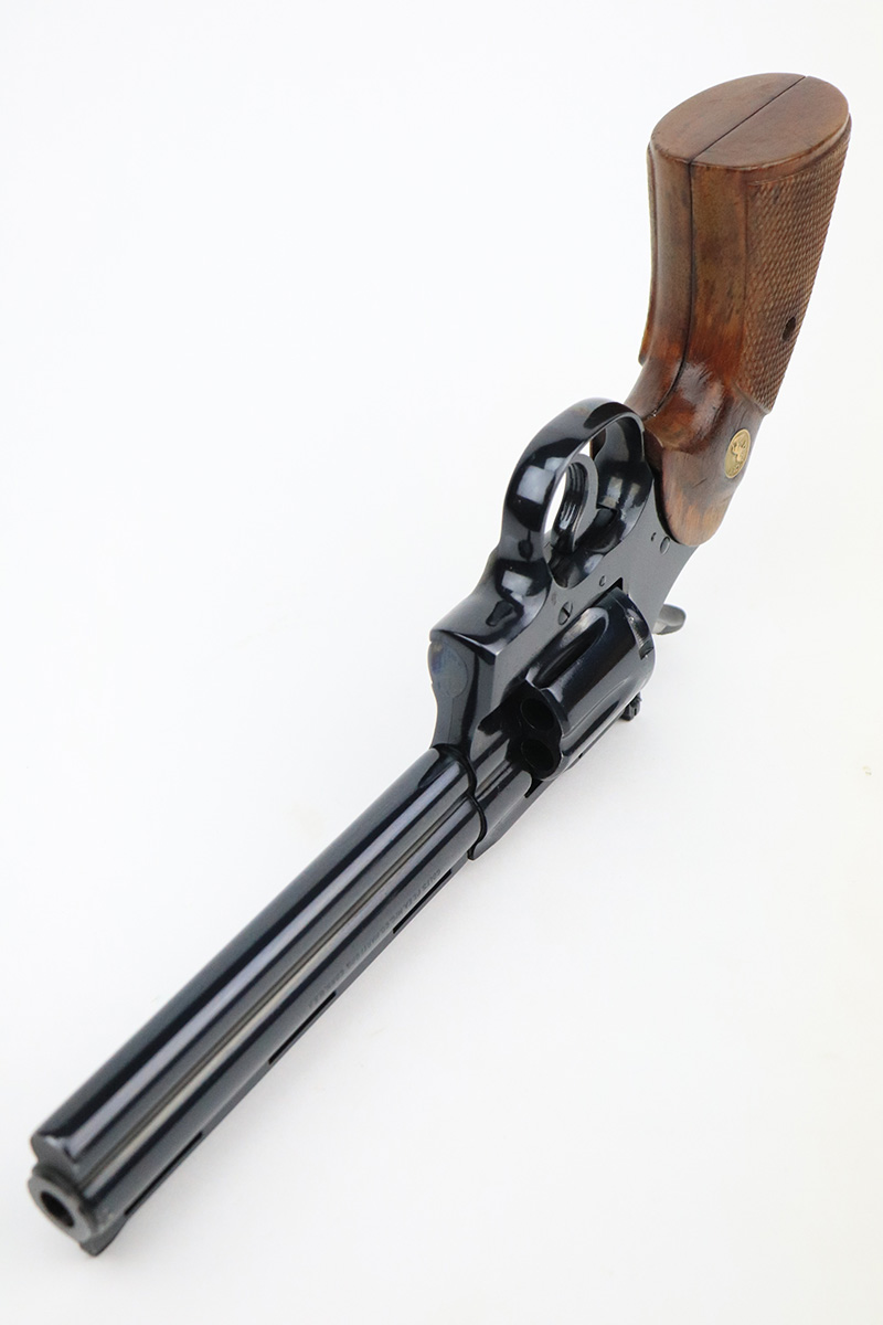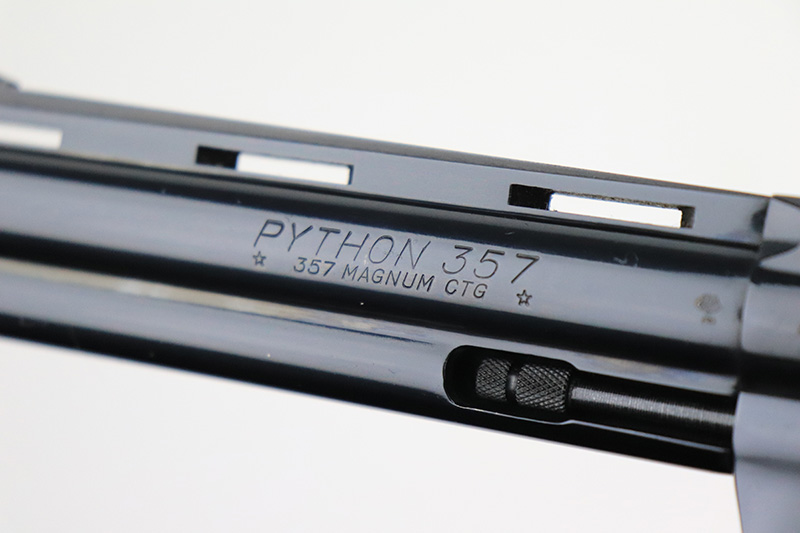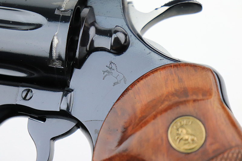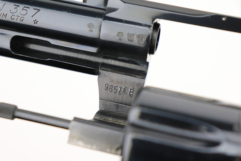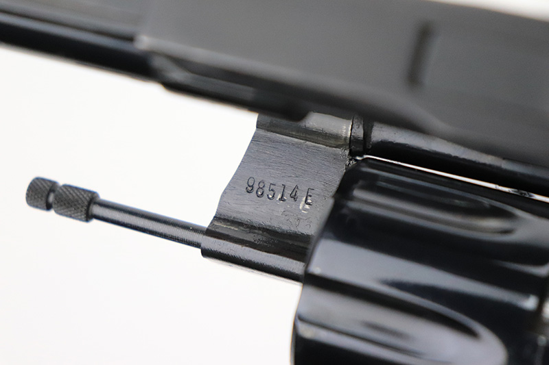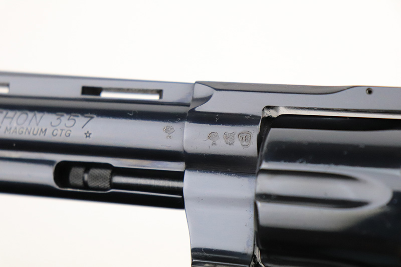 9/22/22 – This is a minty Colt Python from 1978 that was sent to Germany as part of a commercial purchase order, and features the German proof house markings on the left side. It has about 98% of the original blue, with a minor turn line on the cylinder and a little wear on the muzzle. Minty bore and grips. Smooth action and proper timing/lockup. Small import mark inside the cylinder well.