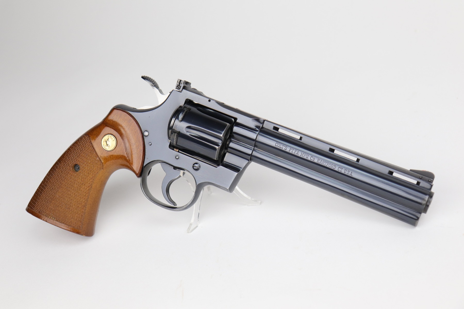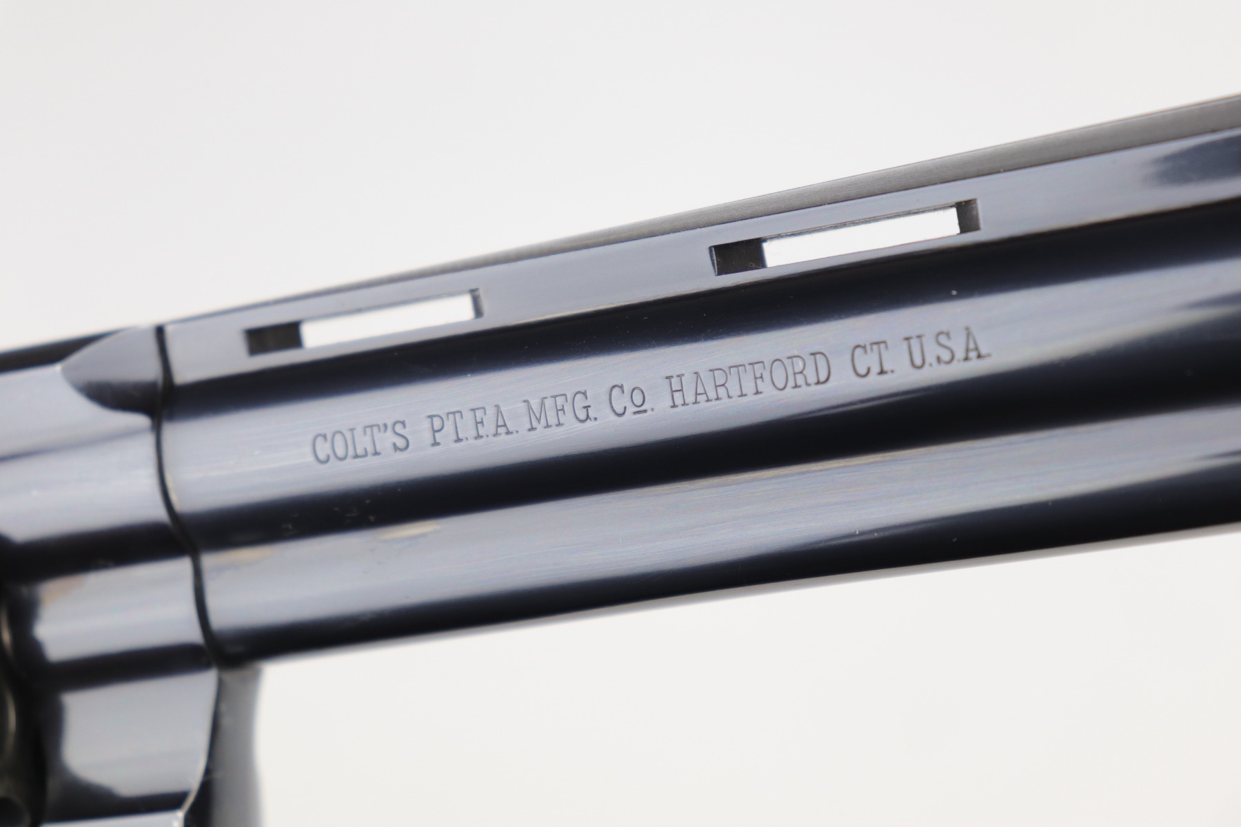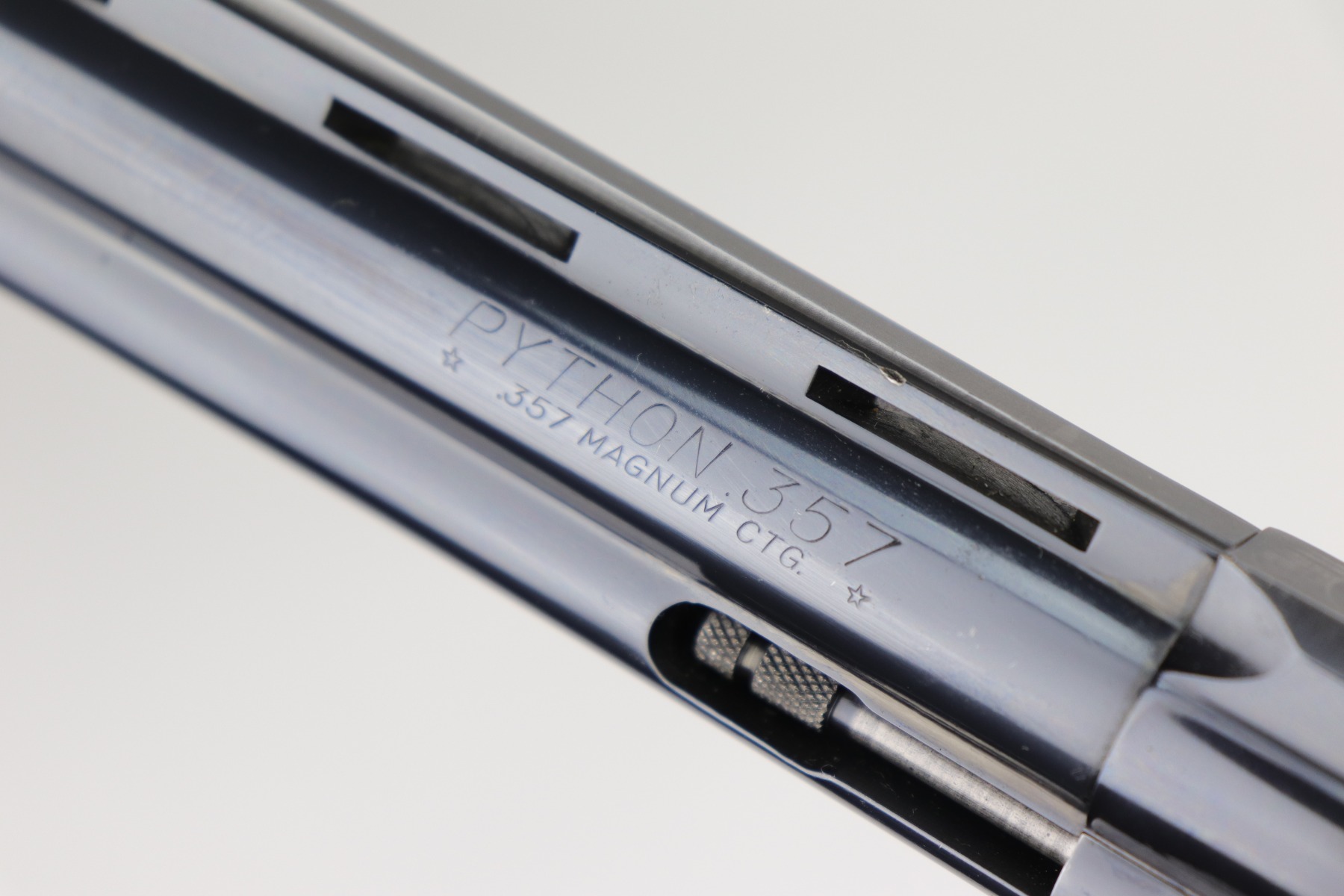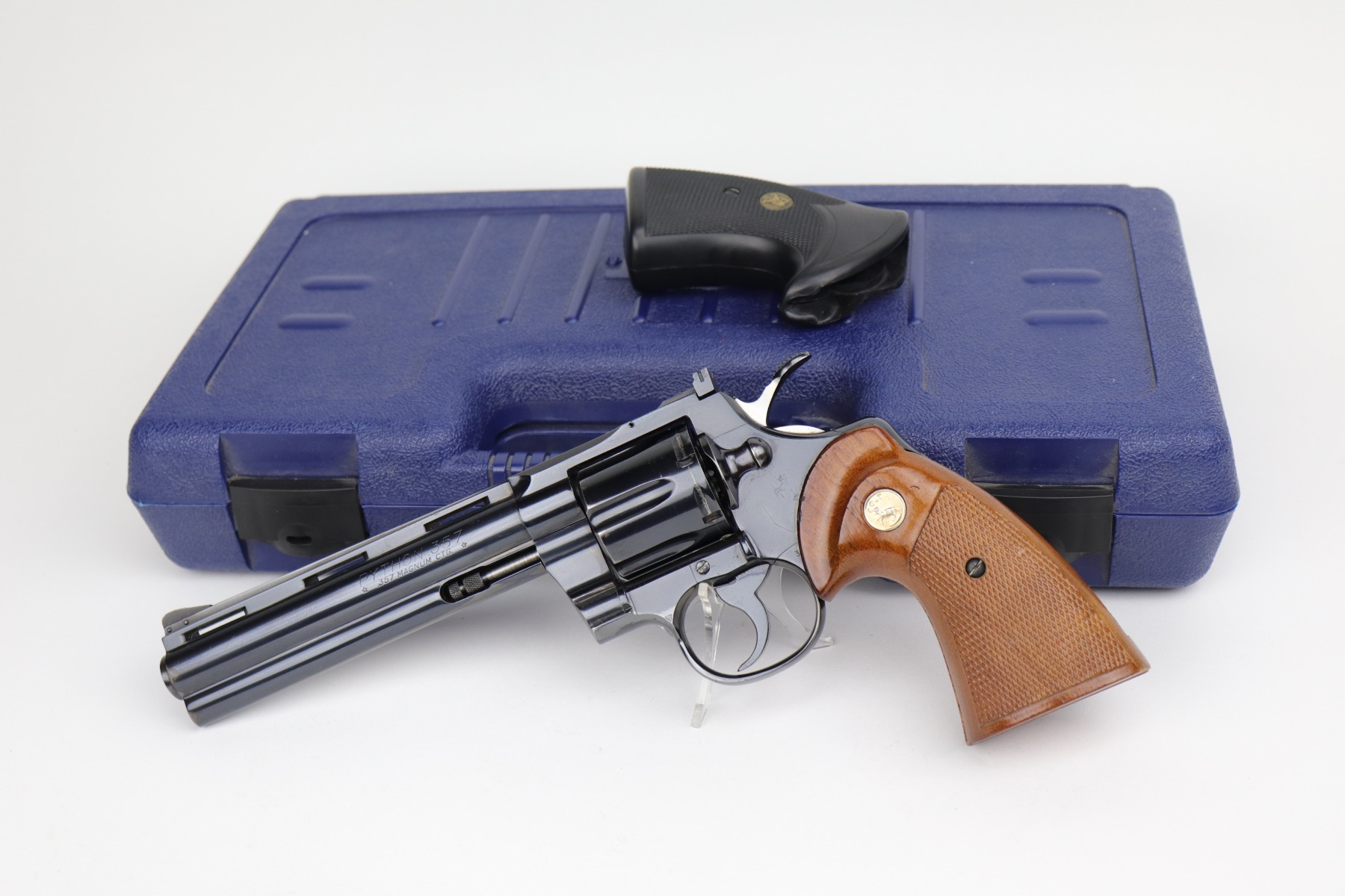 9/25/20 – This is a Colt Python Revolver, chambered in .357 Mag. 6″ barrel. From the serial, it was manufactured in 1967. it comes with a Colt hard case that is hand-numbered to the gun with a pen. It comes with a spare Pachmayr black rubber grip. The gun is in excellent condition, retaining about 97% of its bluing. There is minor muzzle wear, minor high edge wear on the cylinder, minor roll mark on the cylinder, a few light scratches on the left side of the barrel, one scratch on the left side of the frame near the rampant colt, and a few minor dings on the underside of the trigger guard. Minty bore. Excellent grip.