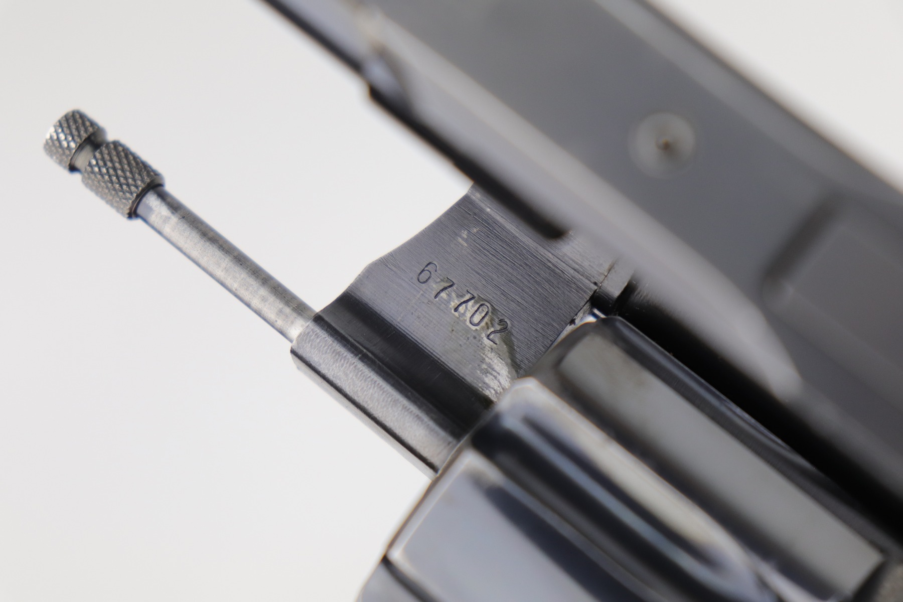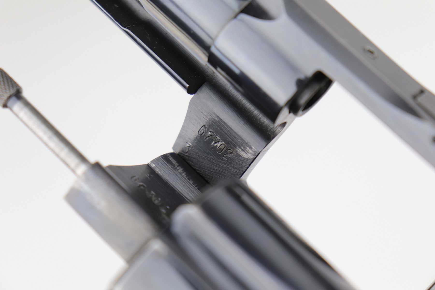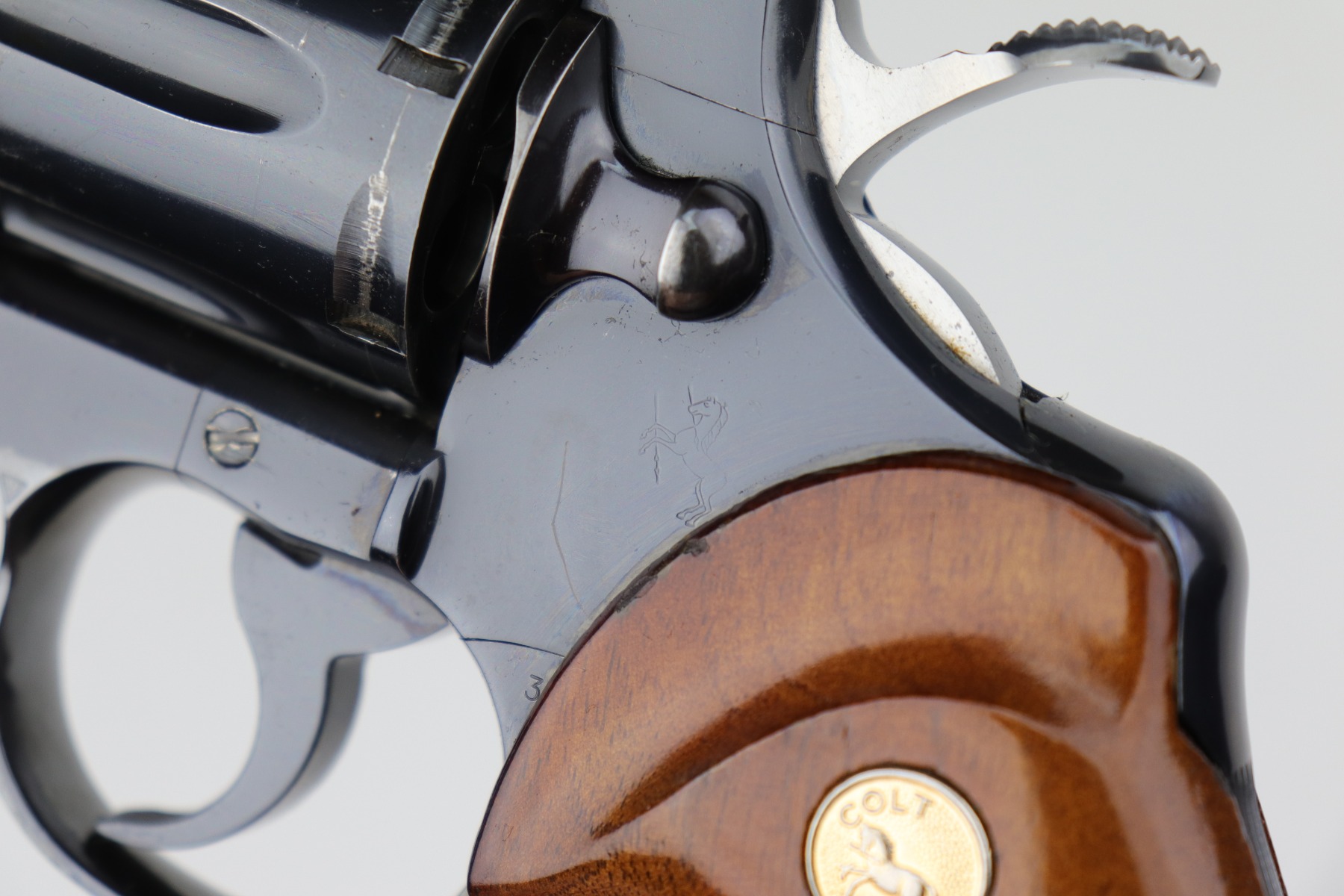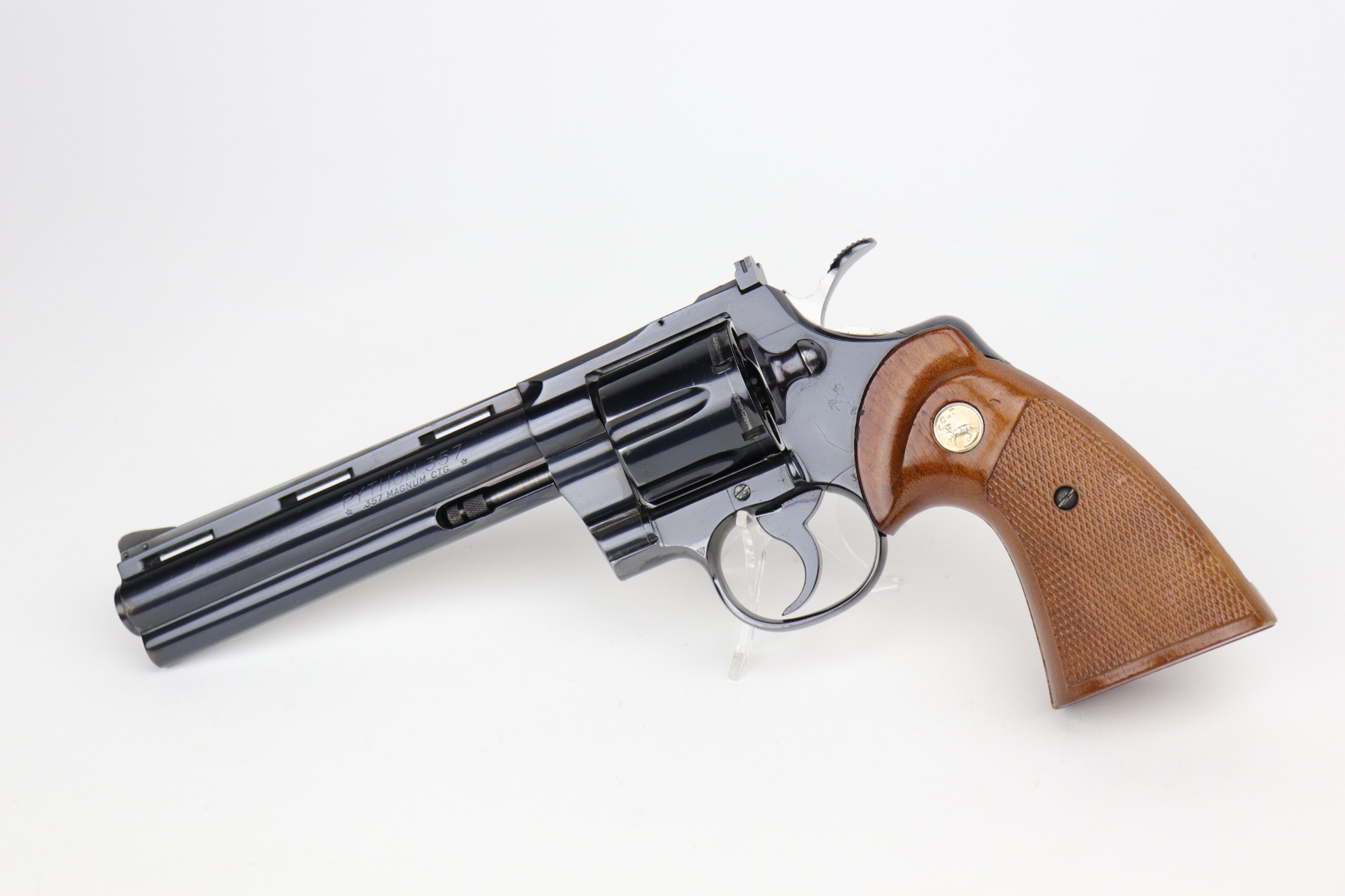 9/25/20 – This is a Colt Python Revolver, chambered in .357 Mag. 6″ barrel. From the serial, it was manufactured in 1967. it comes with a Colt hard case that is hand-numbered to the gun with a pen. It comes with a spare Pachmayr black rubber grip. The gun is in excellent condition, retaining about 97% of its bluing. There is minor muzzle wear, minor high edge wear on the cylinder, minor roll mark on the cylinder, a few light scratches on the left side of the barrel, one scratch on the left side of the frame near the rampant colt, and a few minor dings on the underside of the trigger guard. Minty bore. Excellent grip.