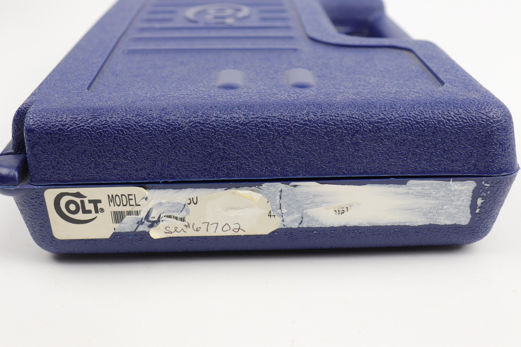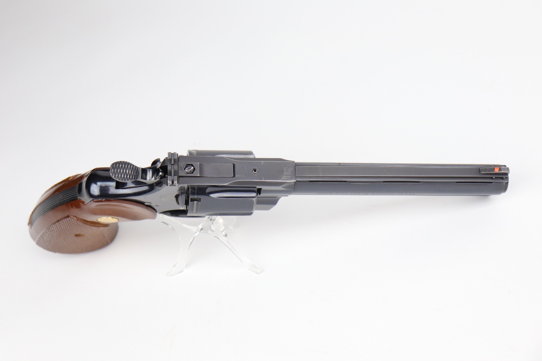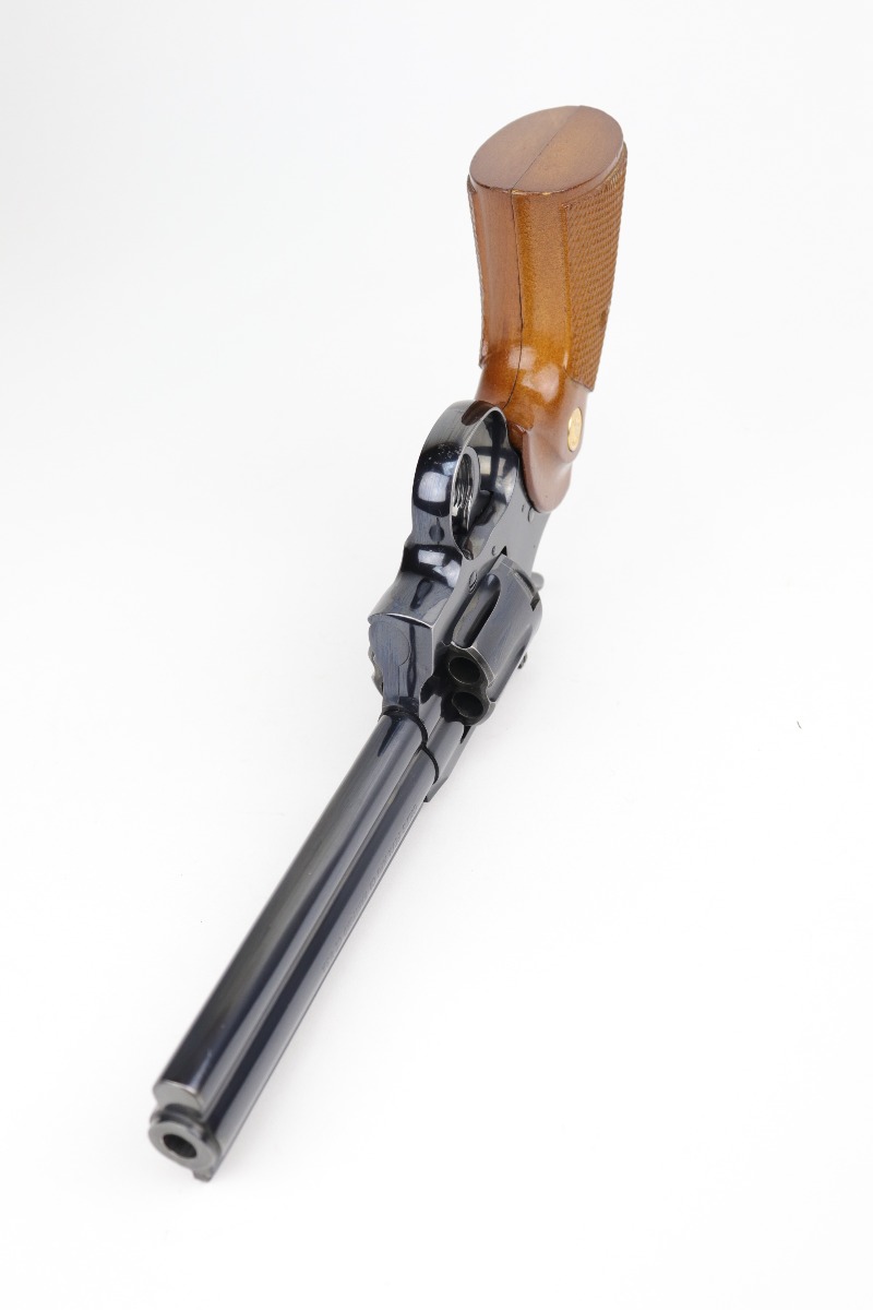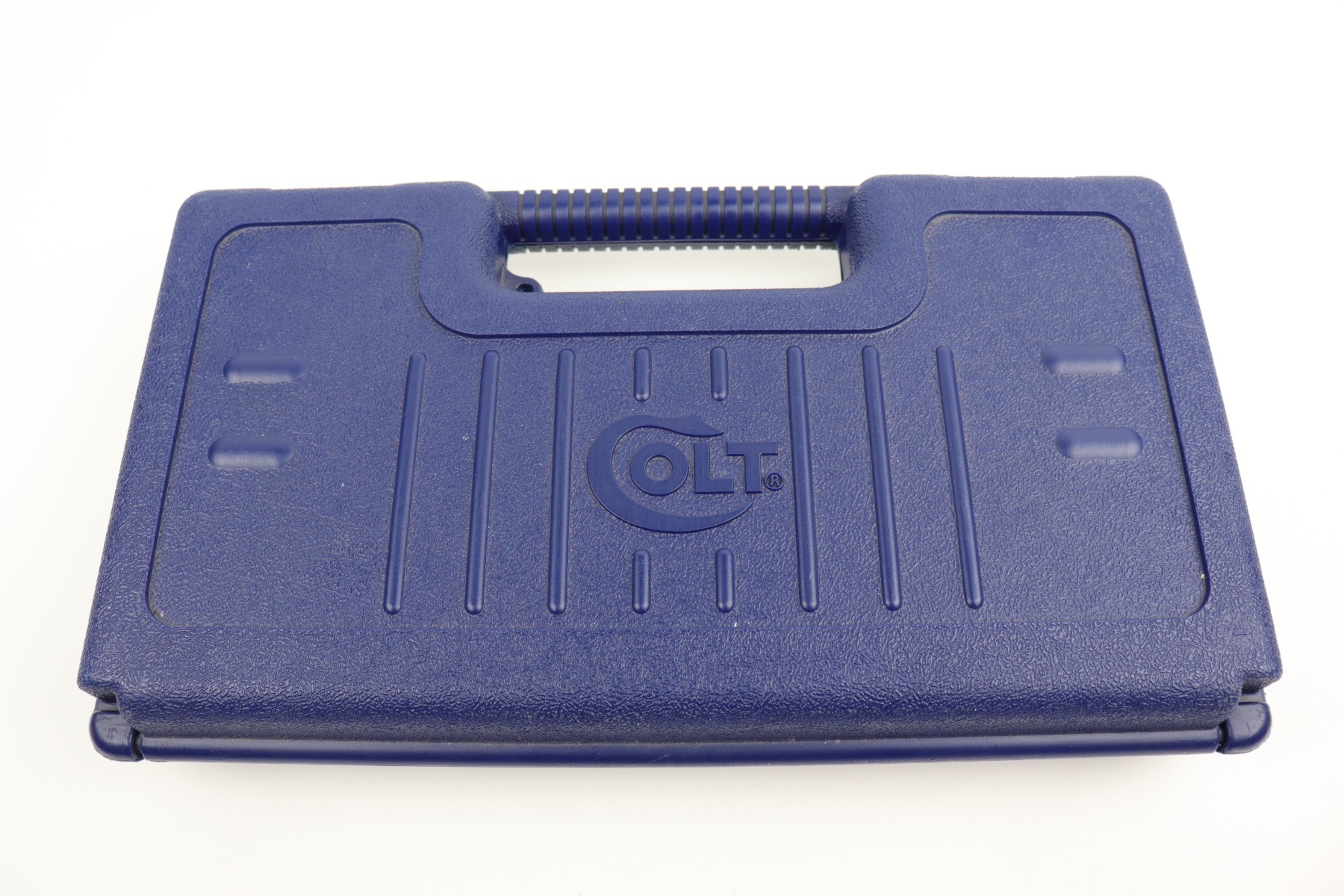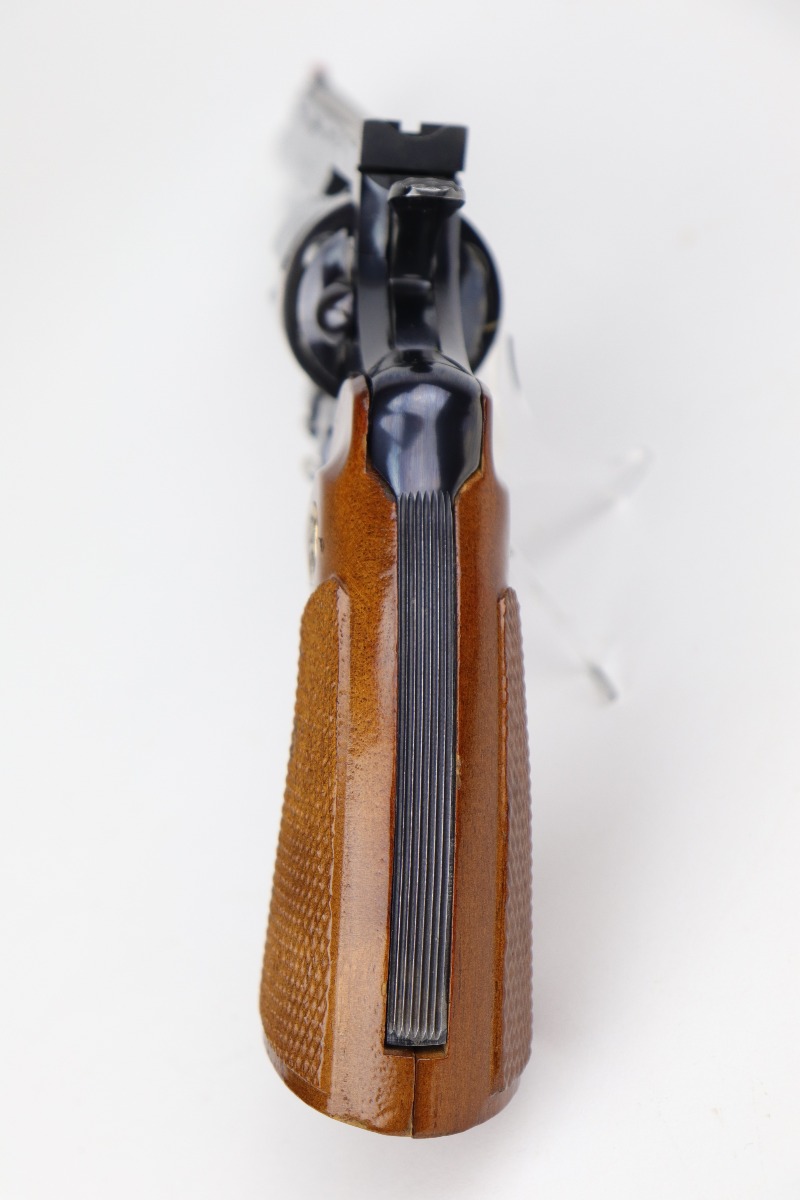9/25/20 – This is a Colt Python Revolver, chambered in .357 Mag. 6″ barrel. From the serial, it was manufactured in 1967. it comes with a Colt hard case that is hand-numbered to the gun with a pen. It comes with a spare Pachmayr black rubber grip. The gun is in excellent condition, retaining about 97% of its bluing. There is minor muzzle wear, minor high edge wear on the cylinder, minor roll mark on the cylinder, a few light scratches on the left side of the barrel, one scratch on the left side of the frame near the rampant colt, and a few minor dings on the underside of the trigger guard. Minty bore. Excellent grip.