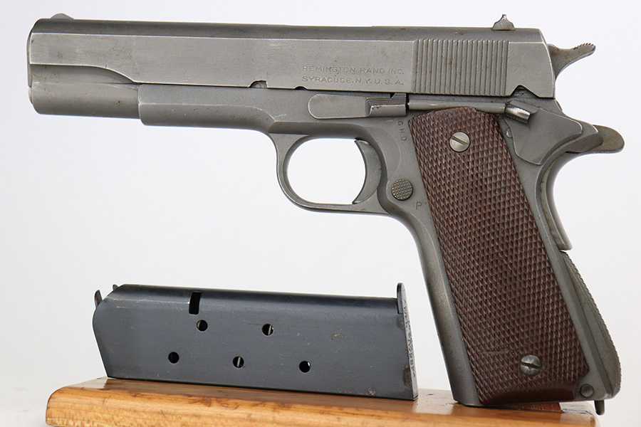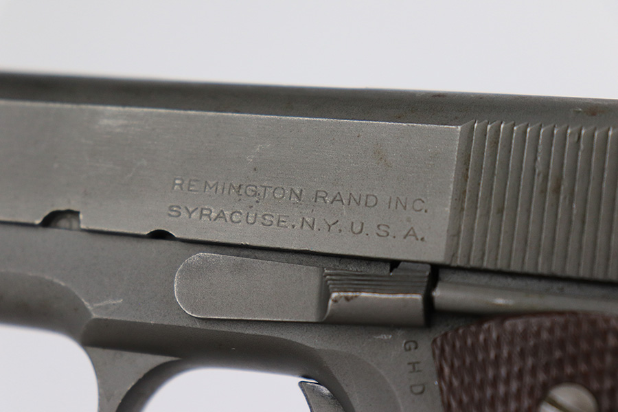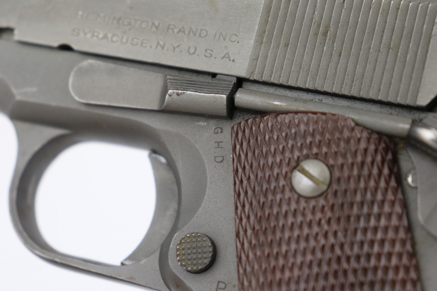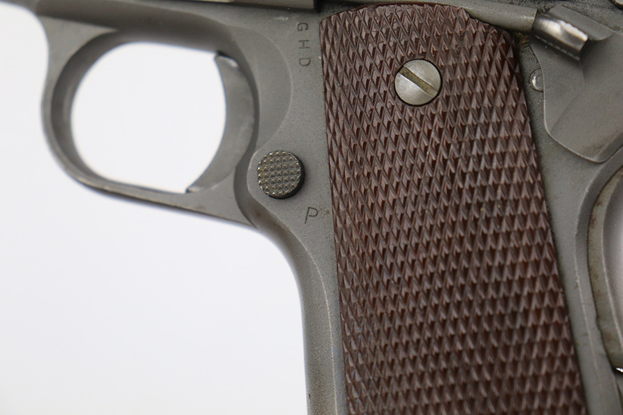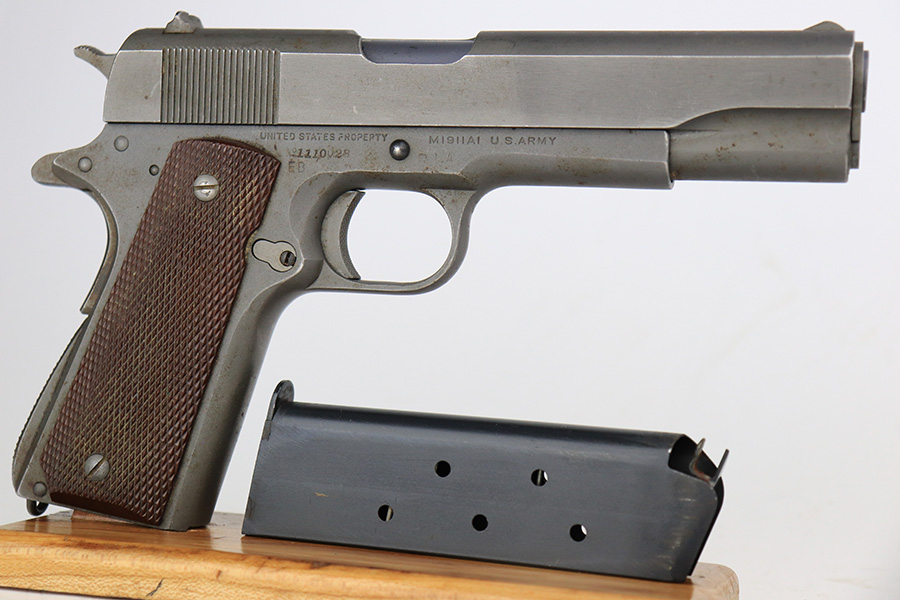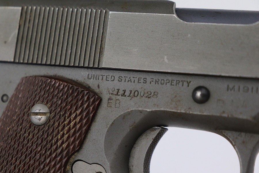 6/2/23 – This is a nice example of a WW2-era 1911A1. The frame was made by Colt and dates to 1943. The slide was made by Remington Rand and is a scarce second variation. WW2-era High Standard barrel (pakerized). There are “RIA” and “EB” markings on the right side of the frame, indicating this gun was reworked and refurbished at the Rock Island Arsenal. It has retained most of its parkerized finish, but there is minor thinning on the grip straps, very minor high edge wear, light spotty discoloration throughout, and tiny scuffs here and there. Fitted with nice reddish plastic grips and comes with a post-war magazine. Mint bore.