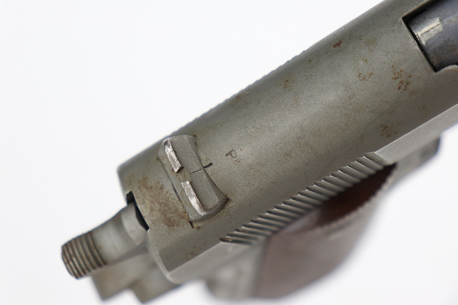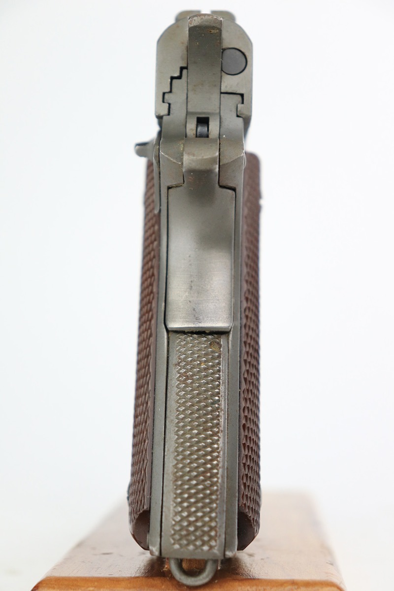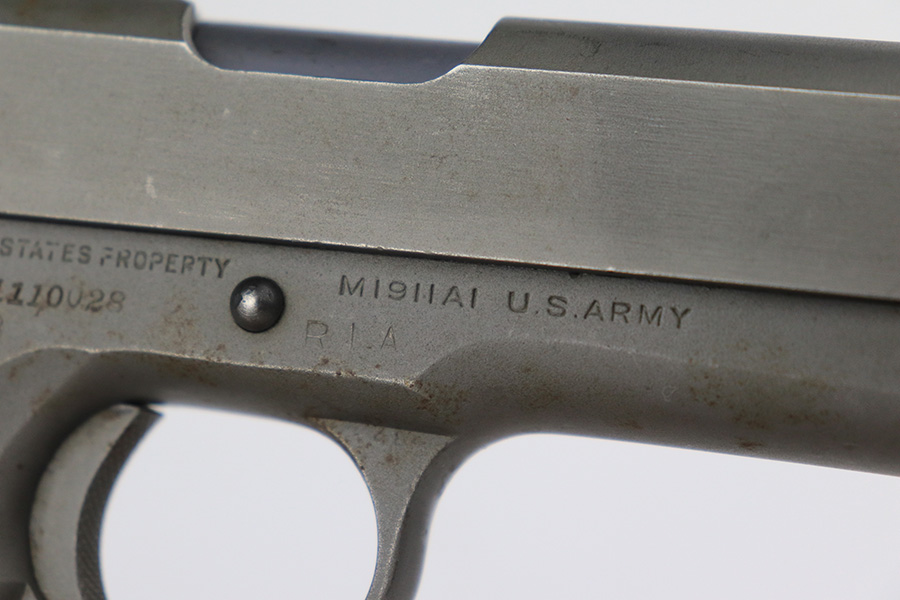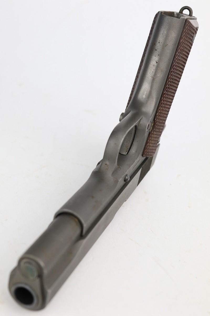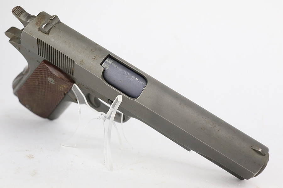 6/2/23 – This is a nice example of a WW2-era 1911A1. The frame was made by Colt and dates to 1943. The slide was made by Remington Rand and is a scarce second variation. WW2-era High Standard barrel (pakerized). There are “RIA” and “EB” markings on the right side of the frame, indicating this gun was reworked and refurbished at the Rock Island Arsenal. It has retained most of its parkerized finish, but there is minor thinning on the grip straps, very minor high edge wear, light spotty discoloration throughout, and tiny scuffs here and there. Fitted with nice reddish plastic grips and comes with a post-war magazine. Mint bore.