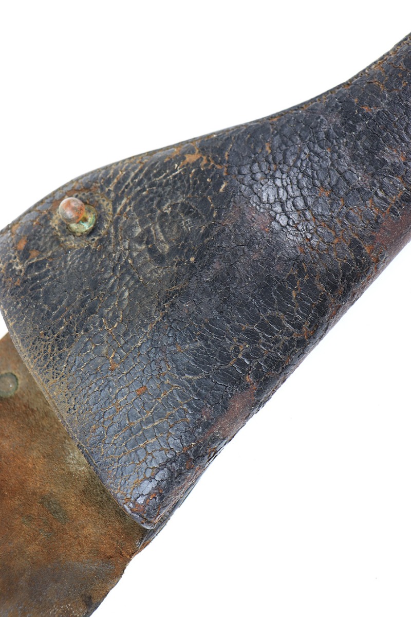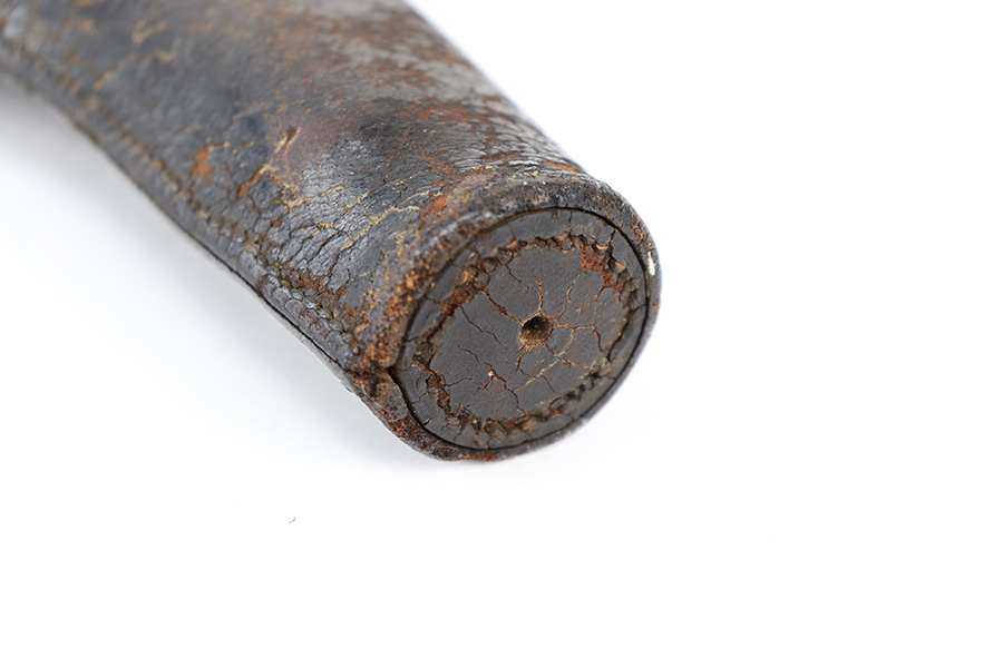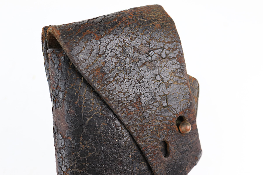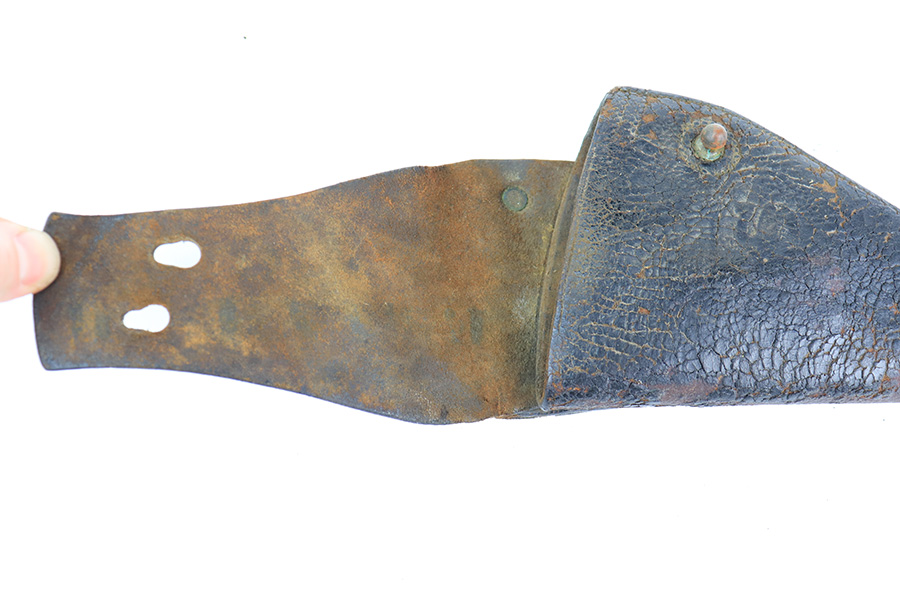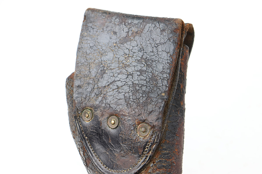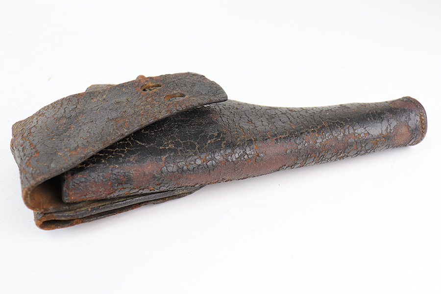 3/18/22 – This is an original Colt Single Action Army holster. The holster was shortened / modified in the 1890s for artillery use. The holster has surface cracking throughout the surface leather, as shown. The leather is still firm with mild pliability however. The front flap appears to be stamped “D 5 2 3” vertically and upside down – likely unit stamps. No other markings or stamps. All the stitching is excellent and original. Measures about 10.5 inches from top to bottom when closed.