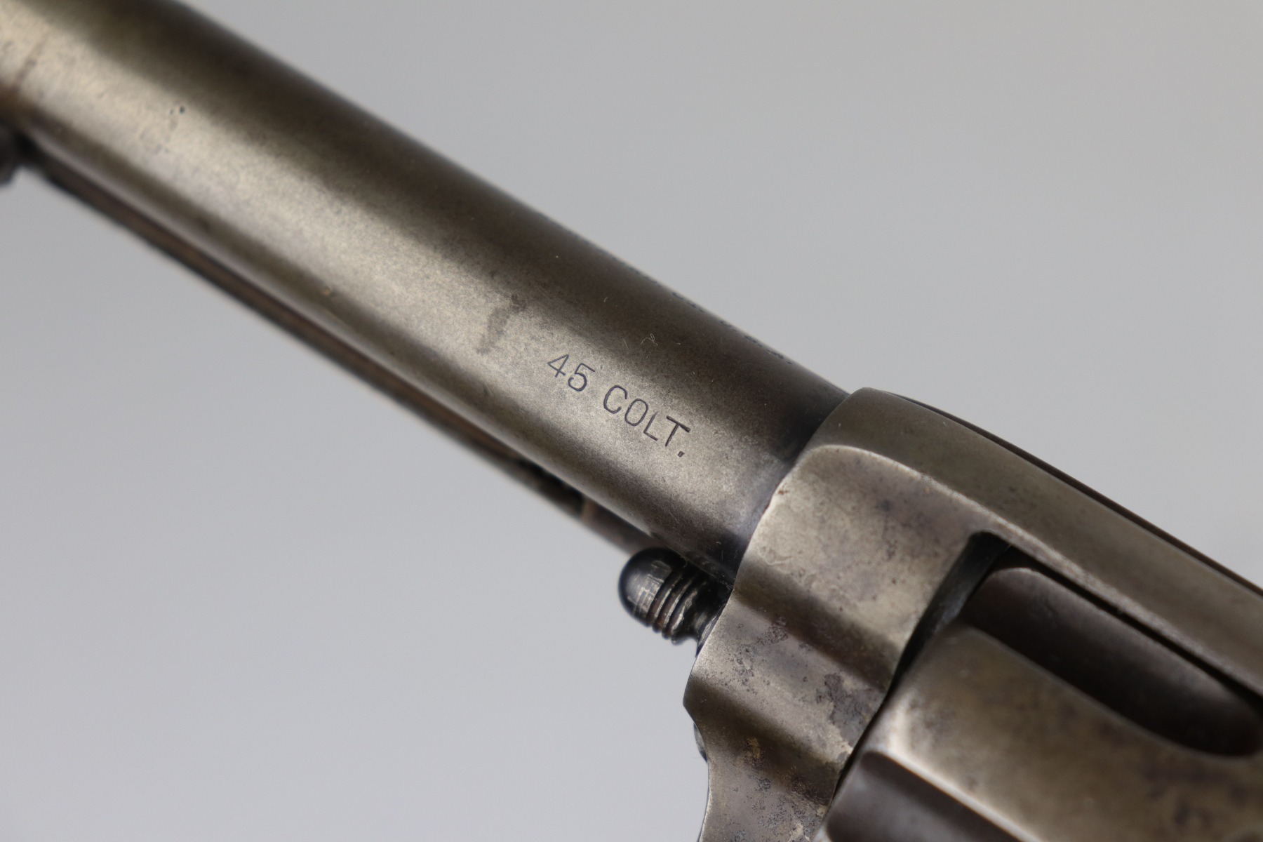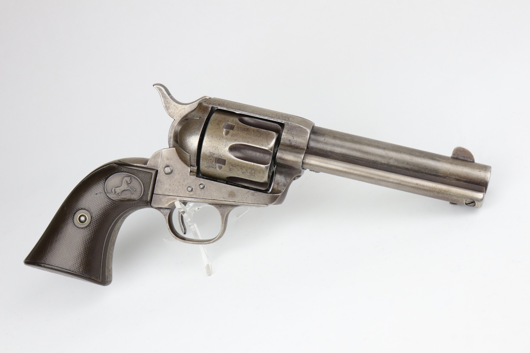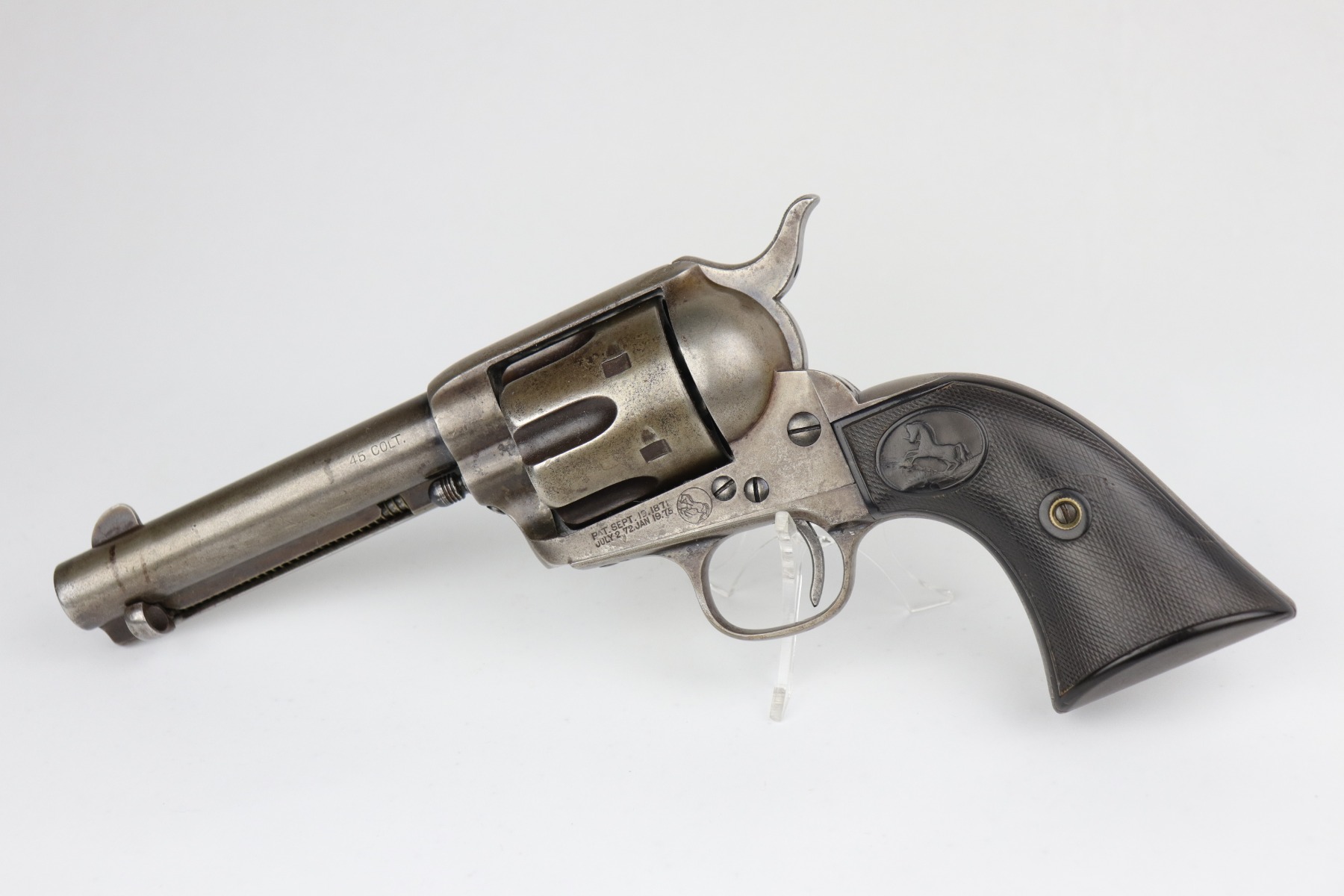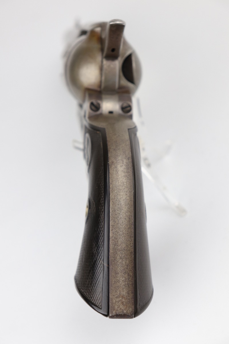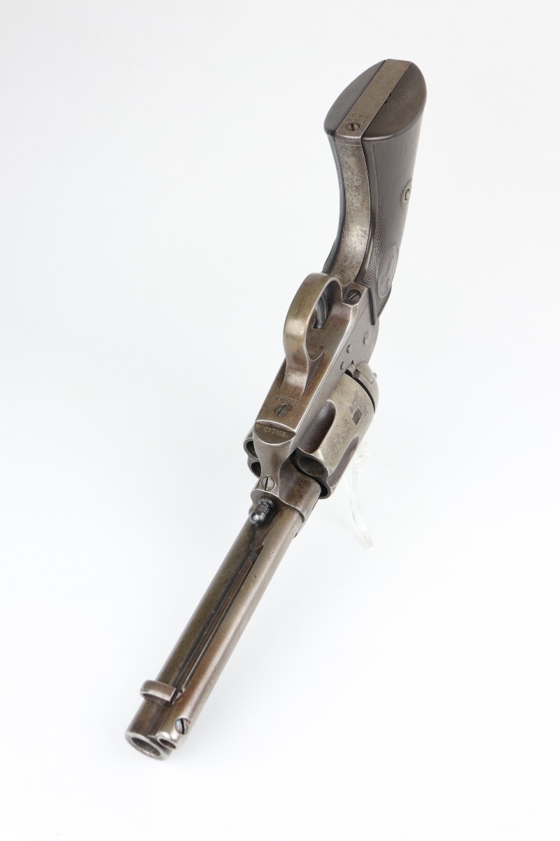 7/14/20 – This is an original Colt SAA Model 1873 revolver, chambered in .45 Colt. It was made for the commercial market in 1894. It has a 4.75″ barrel. Overall, the gun is in good condition for its age. Most of the original finish is worn. It is now mostly covered in a layer of brown patina and there is light pin-pricking throughout. The metal is not rusted or pitted. Original grips. All parts are matching. The action is tight and the timing is excellent. There is moderate rifling in the bore with corrosion throughout, 5/10. This gun is an antique.