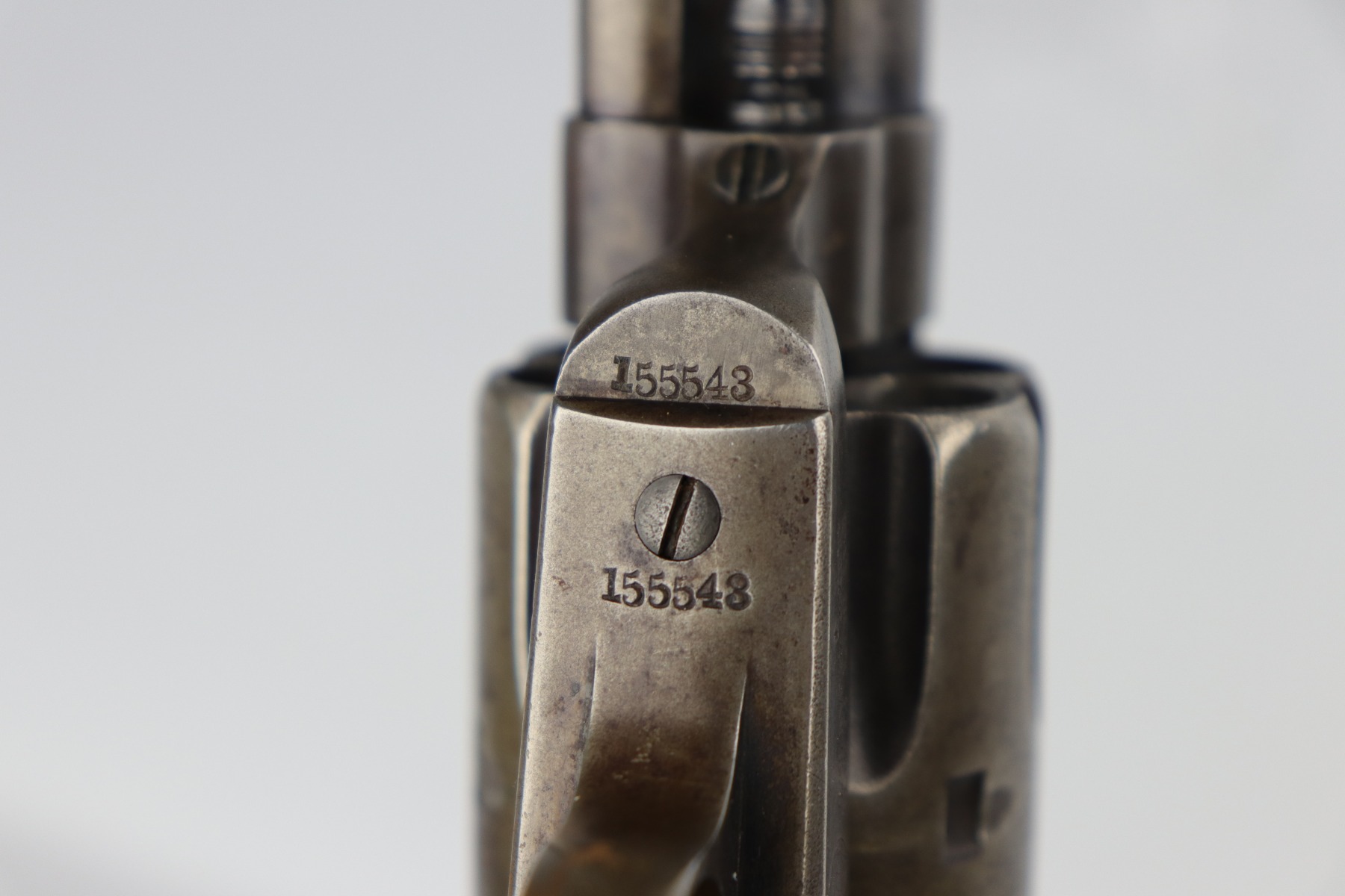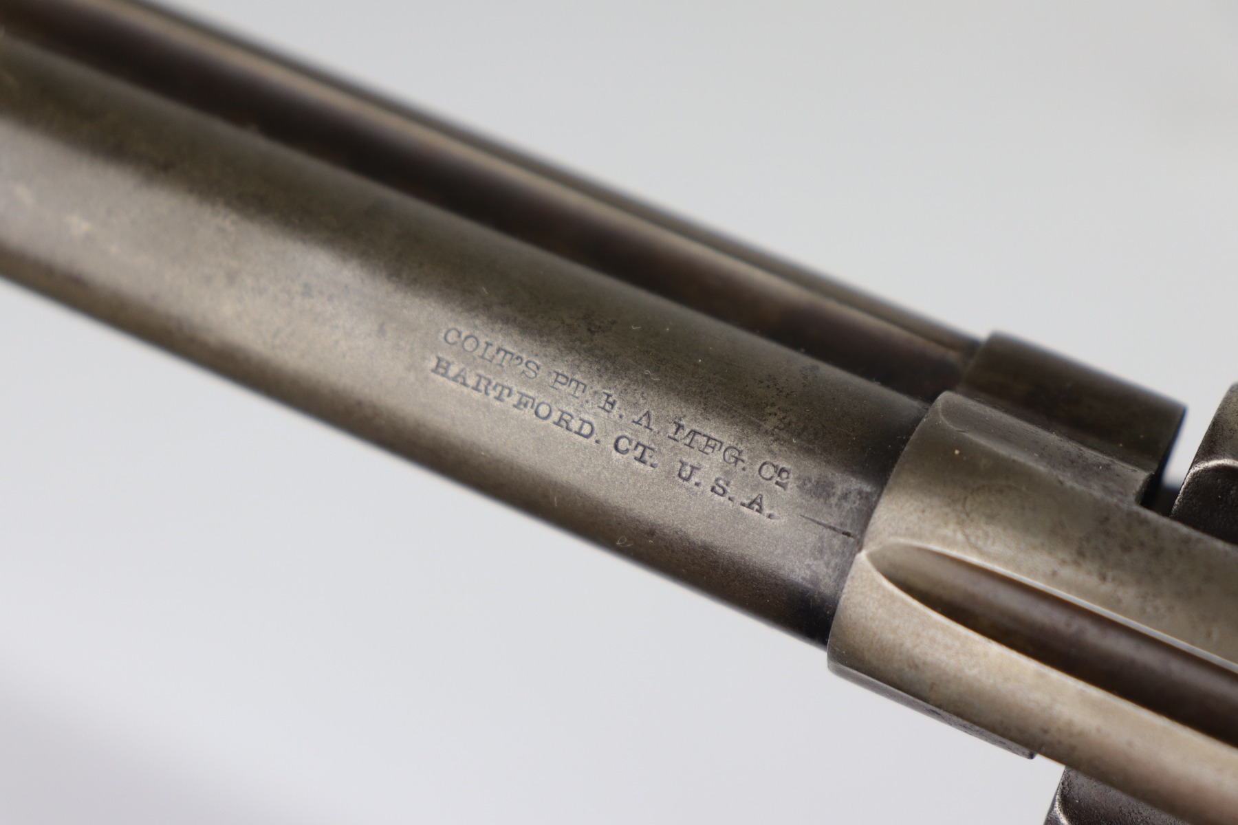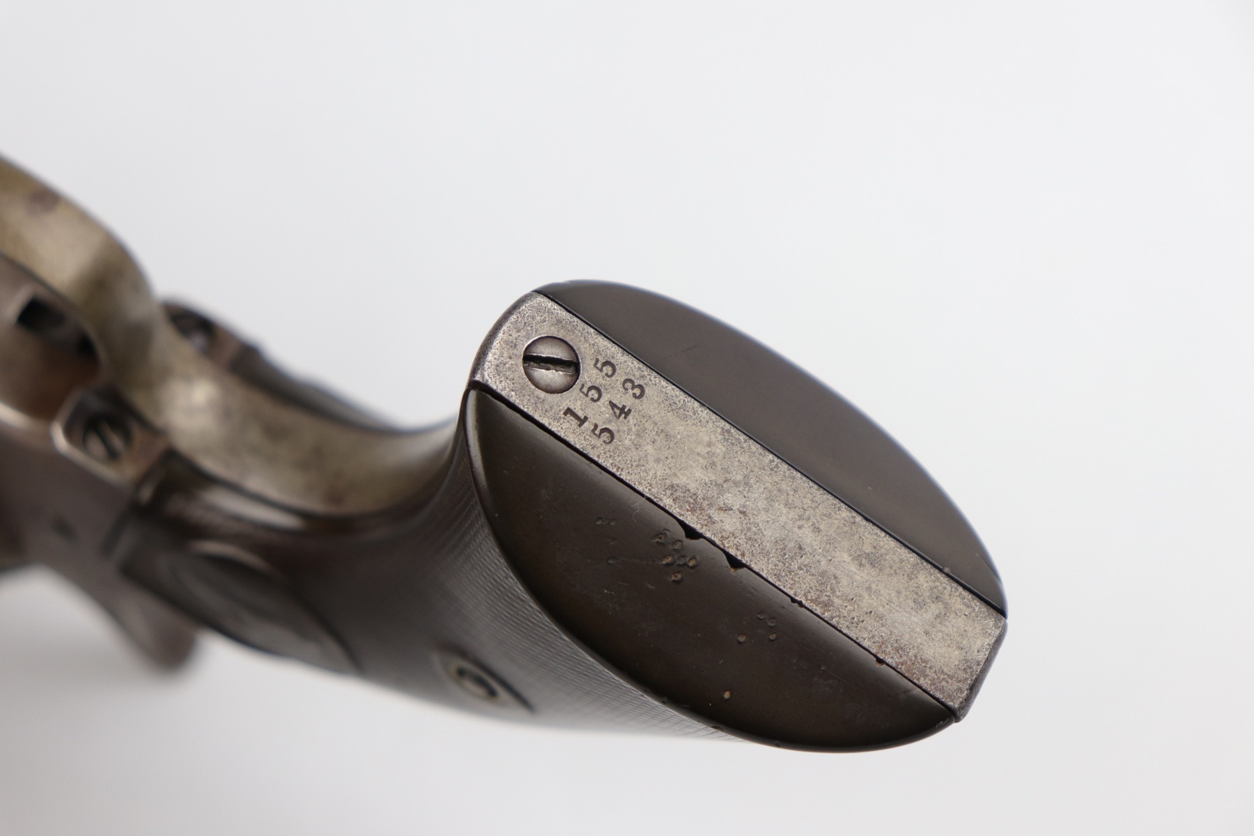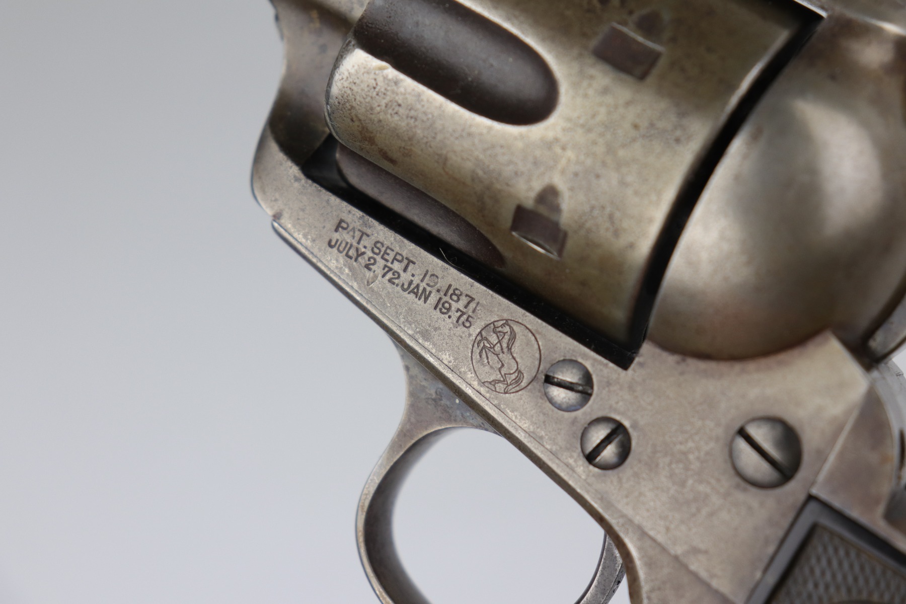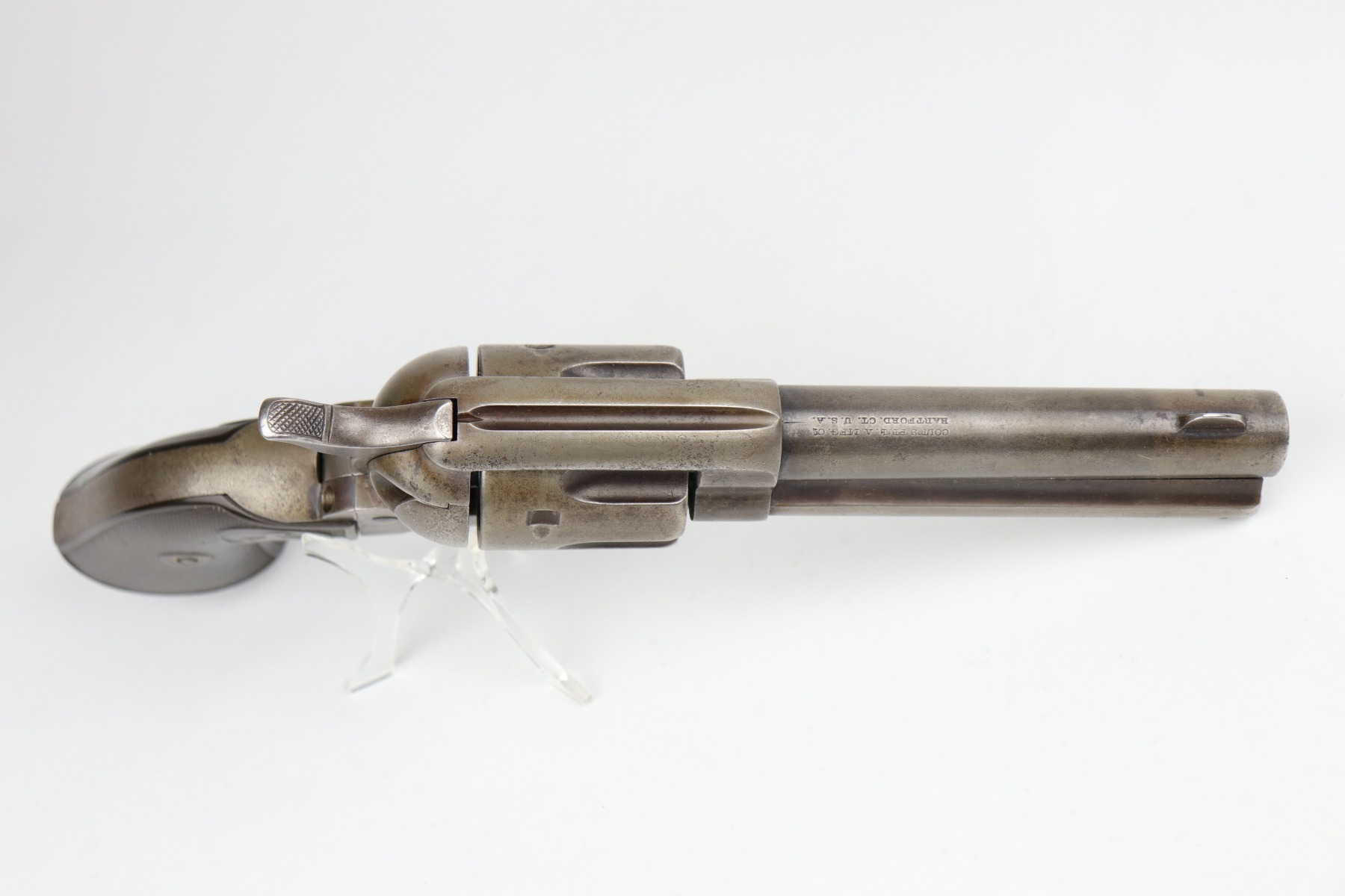 7/14/20 – This is an original Colt SAA Model 1873 revolver, chambered in .45 Colt. It was made for the commercial market in 1894. It has a 4.75″ barrel. Overall, the gun is in good condition for its age. Most of the original finish is worn. It is now mostly covered in a layer of brown patina and there is light pin-pricking throughout. The metal is not rusted or pitted. Original grips. All parts are matching. The action is tight and the timing is excellent. There is moderate rifling in the bore with corrosion throughout, 5/10. This gun is an antique.