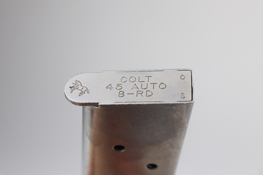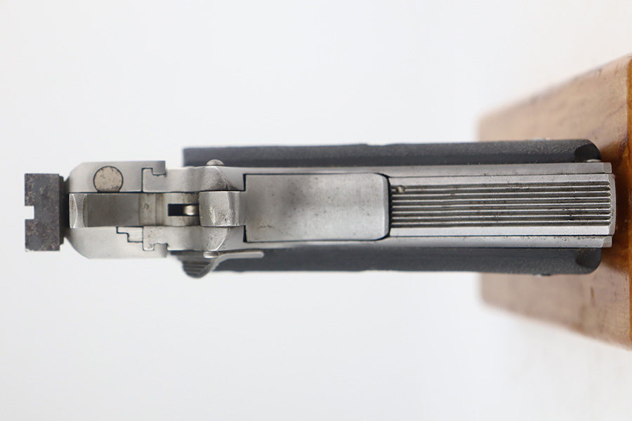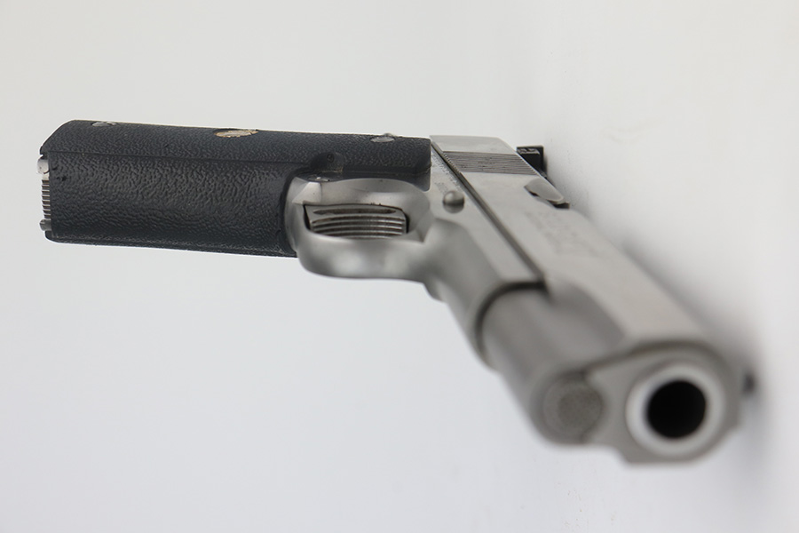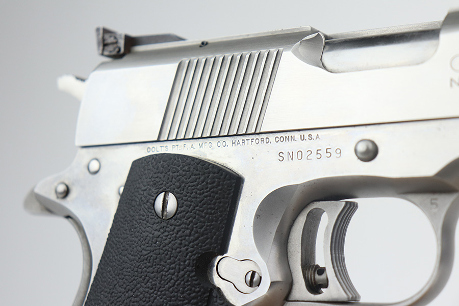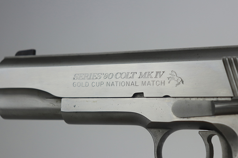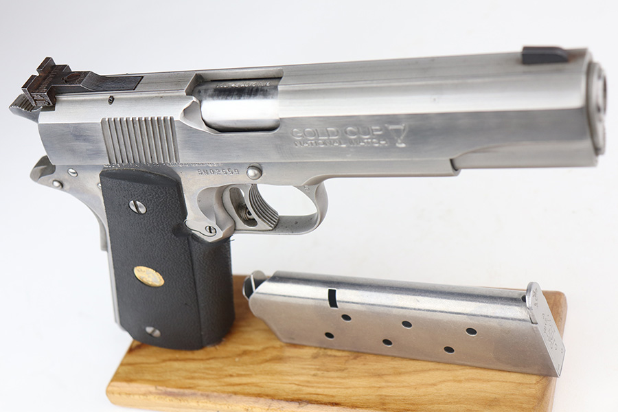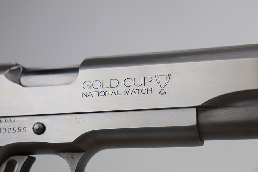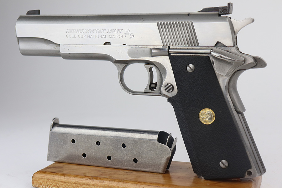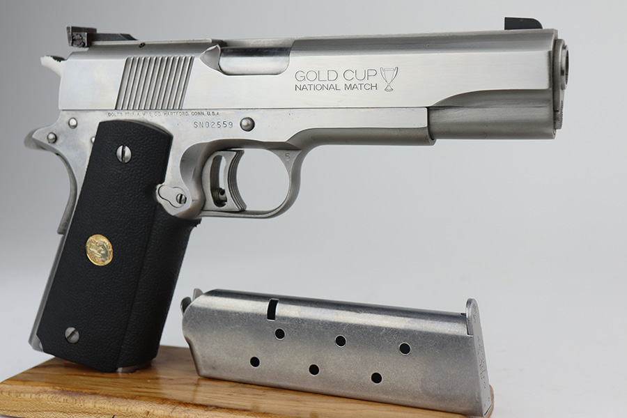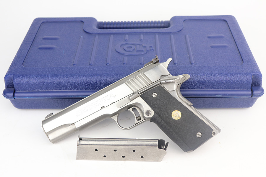 7/2/21 – The Colt Gold Cup is known as the finest shooting semi-automatic in the world, and is the standard for competitive guns. The first Colt Gold Cup pistol was introduced in the late 1950’s to give competitive shooters a gun to take directly from the dealer’s showcase to the firing line. Colt Gold Cup pistols have been used to compete in local club matches through the National Matches at Camp Perry. This is a Series 80 that was made in 1989, and has the factory stainless steel finish. It has minor hints of oxidation on the underside of the trigger guard, and a tiny bit of wear on the left side of the frame. Minty bore. Original magazine. Comes with the Colt blue plastic case but it’s not original to this pistol.