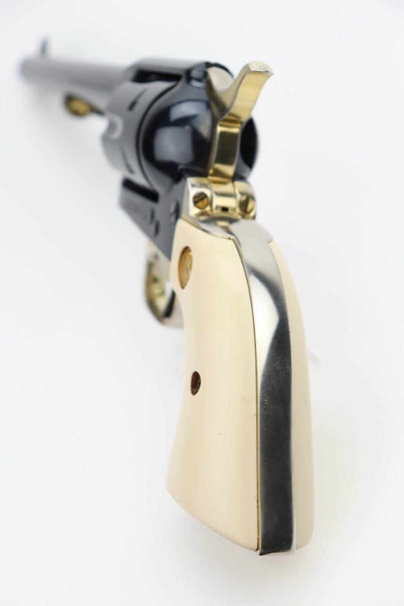 12/1/23 – This is a very nice example of a Colt Single Action Army Revolver – 125th Anniversary Model from 1961. Chambered in .45 Caliber with a 7.5″ barrel. The finish rates about 90%. There is virtually no bluing loss, but the gold-colored wash on the frame has thinned in some areas. Fitted with nice ivory-colored plastic grips. Excellent, shiny bore.