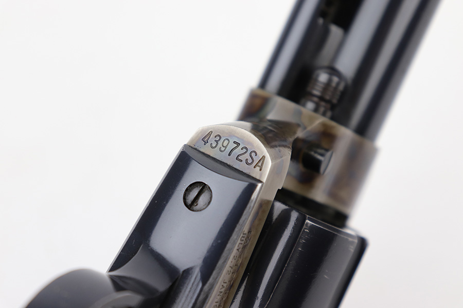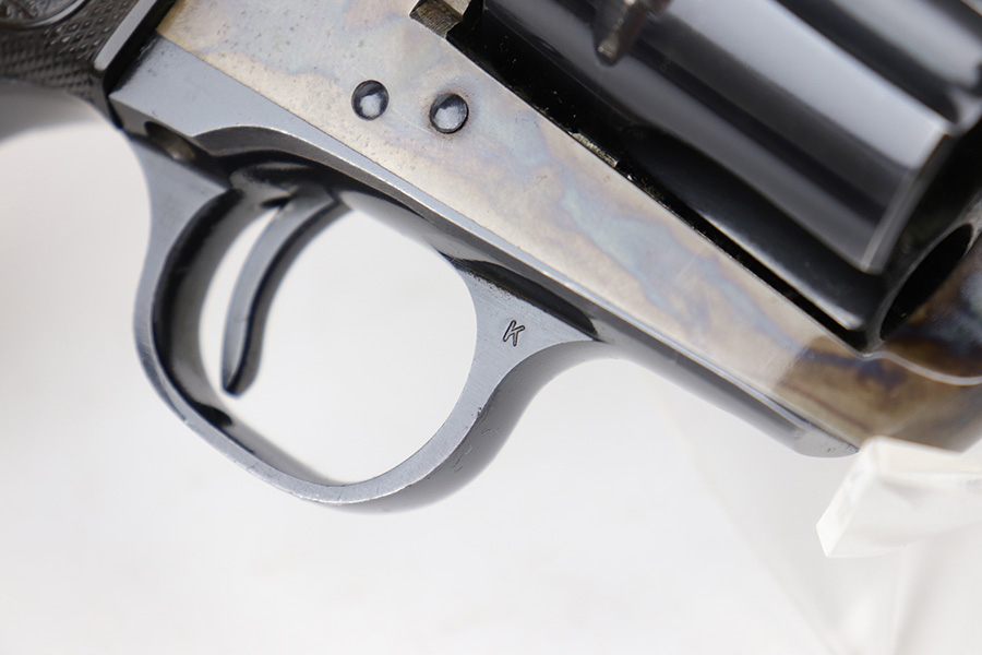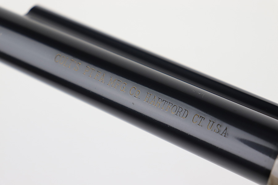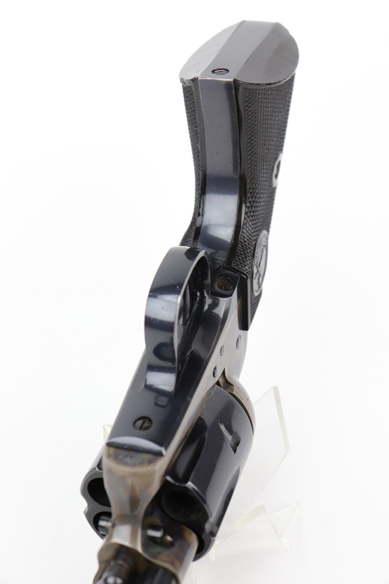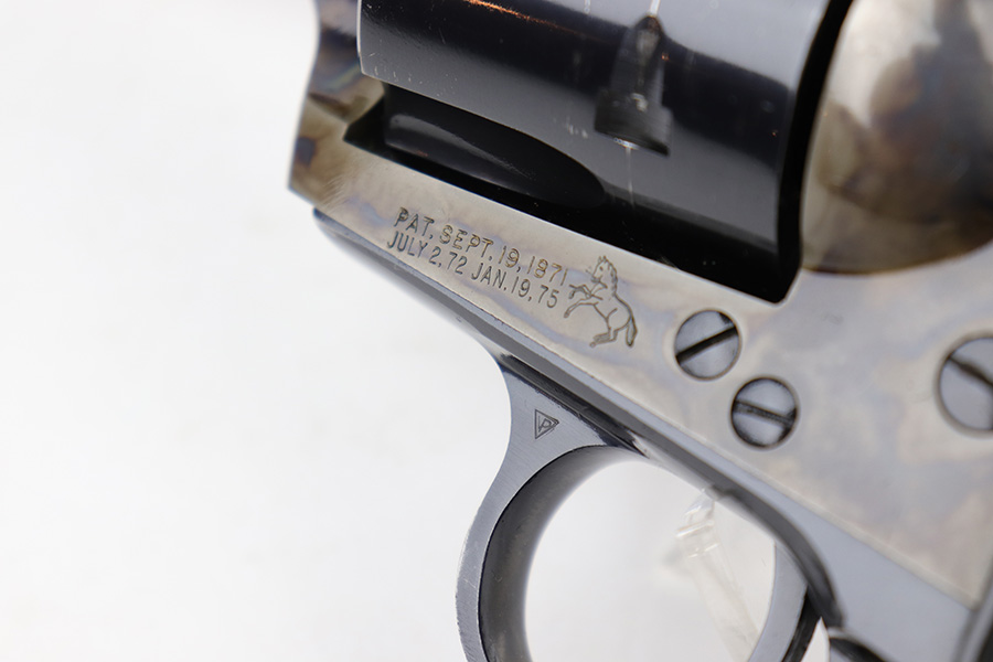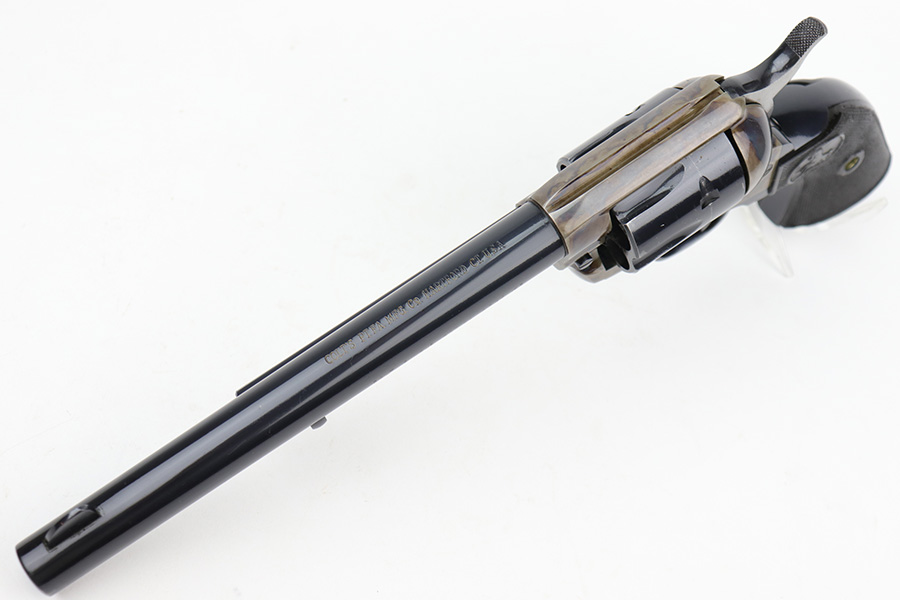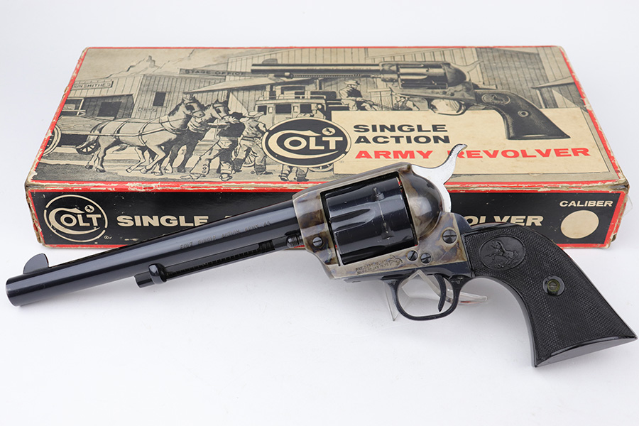 12/15/22 – This is an excellent, 2nd generation Colt Single Action Army in original box. The revolver has about 97% of the original blue remaining, with minor wear on the cylinder and muzzle. There are also a few dings on the back of the grip frame. 7.5in barrel with minty bore. Beautiful case hardening on the frame. Smooth action and proper timing. Comes with period original Colt box, which shows some wear and tear, and isn’t/wouldn’t have been numbered.