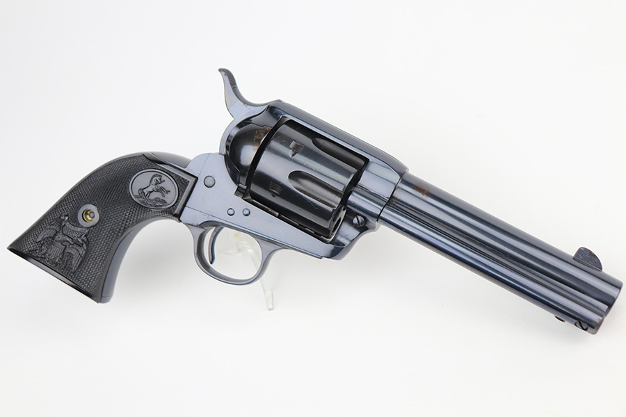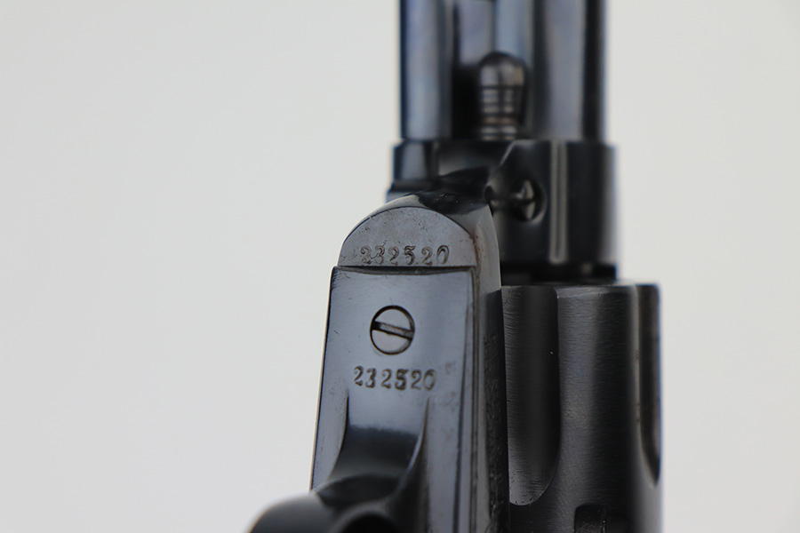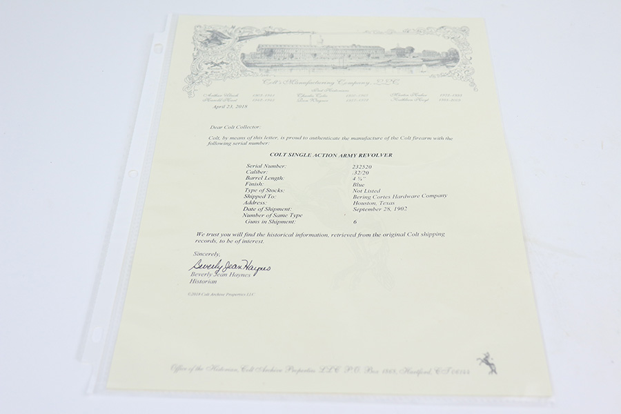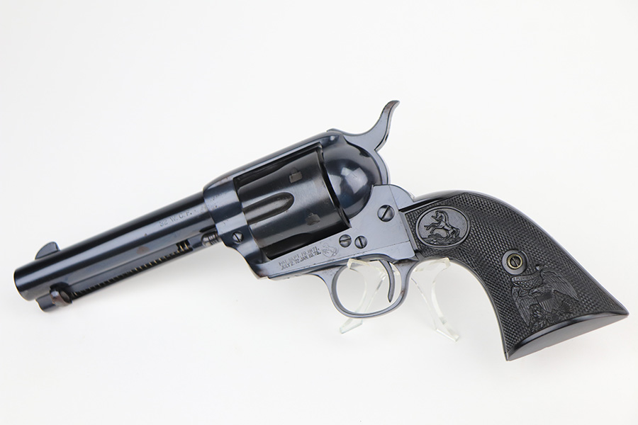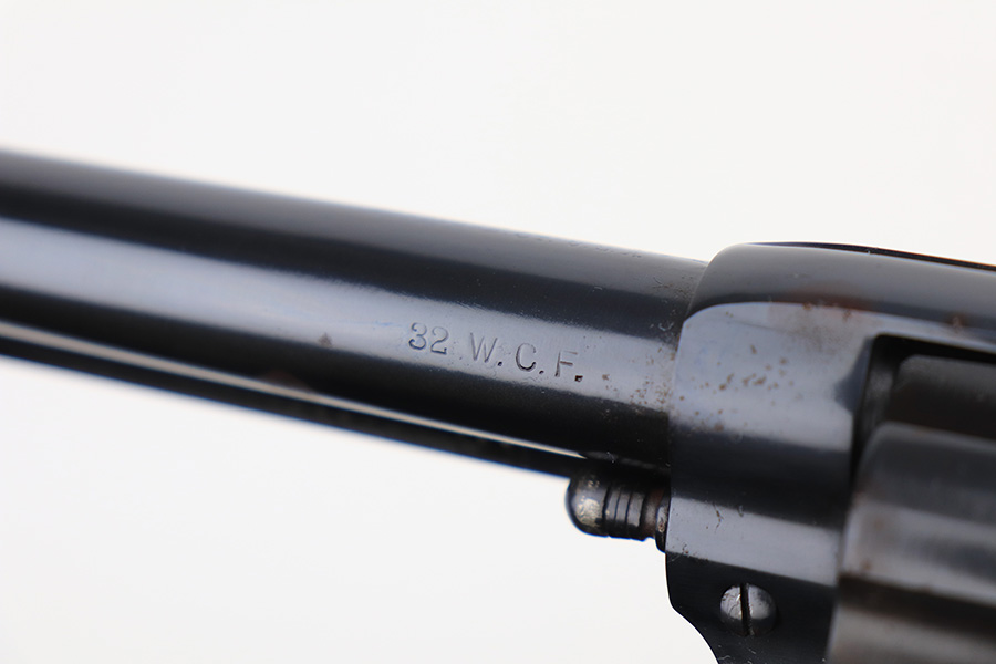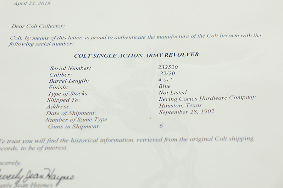 2/11/22 – This is a nice Colt Single Action Army revolver from 1902. It’s a first gen example that is accompanied by a Colt archive letter stating it shipped to a hardware company in Houston, TX. Barrel is 4.75in and it’s chambered for .32-20 WCF. The gun has matching numbers throughout but the finish was restored at some point. Couple of areas of patina/freckling but generally in nice shape. Hard rubber Colt grips that were replaced at some point. Bore is shiny with strong rifling, but has a couple patches of minor pitting.