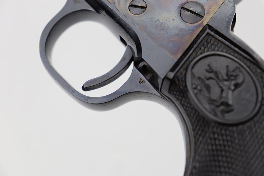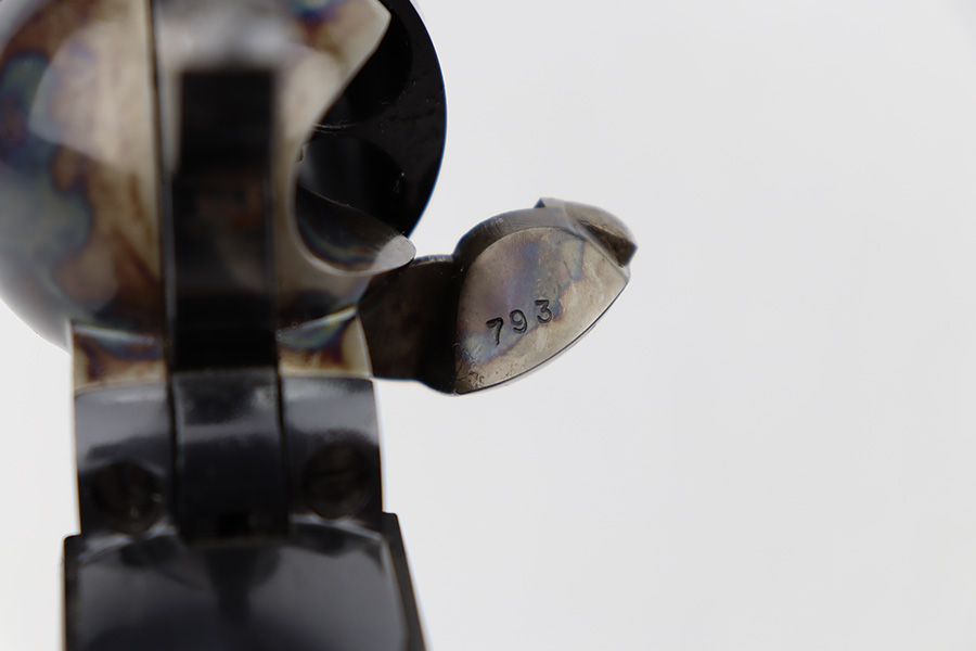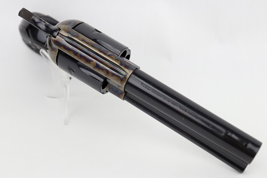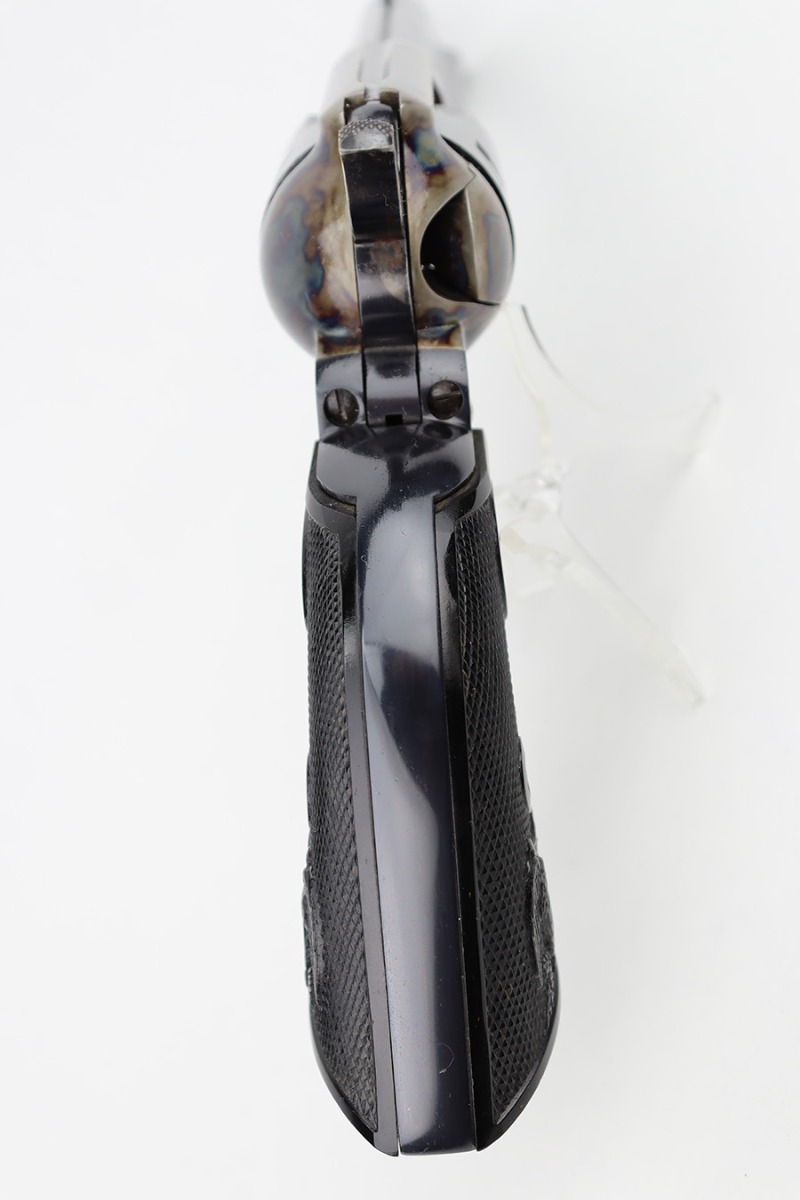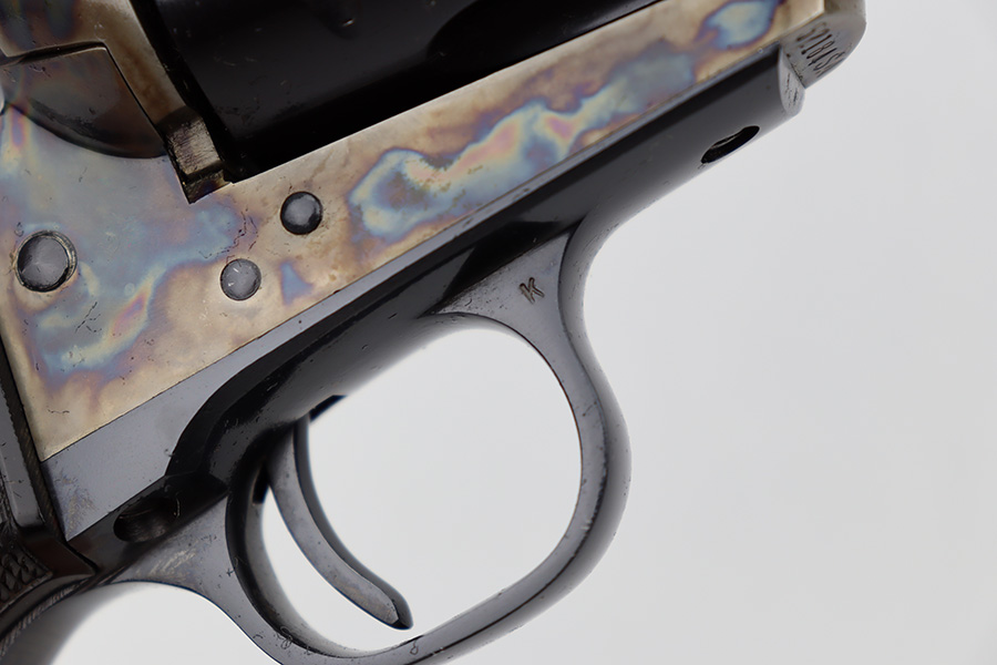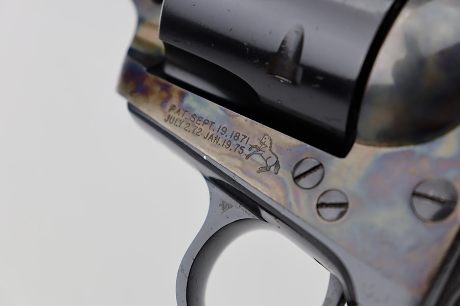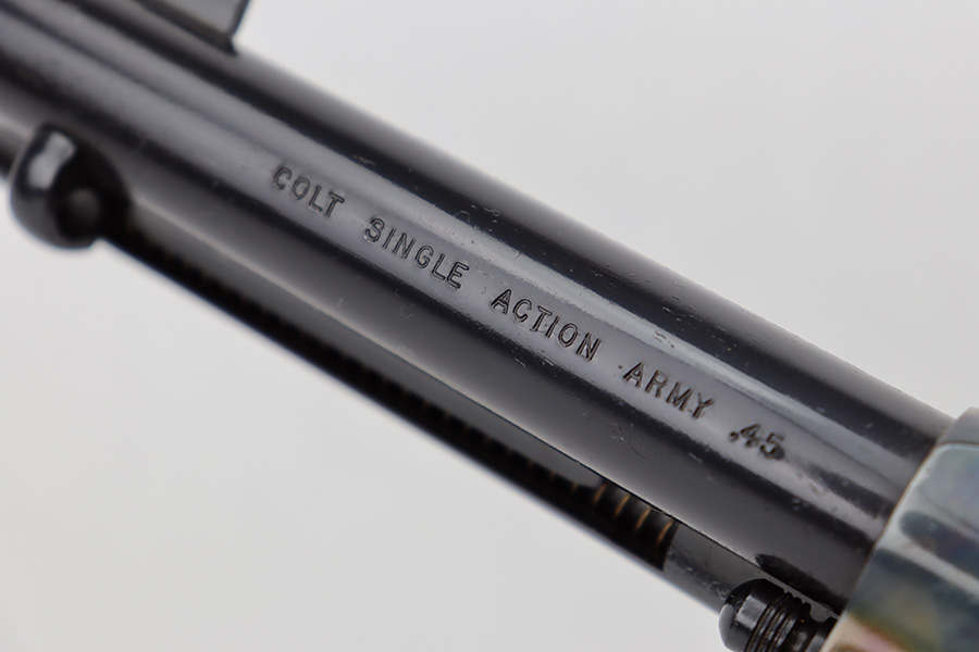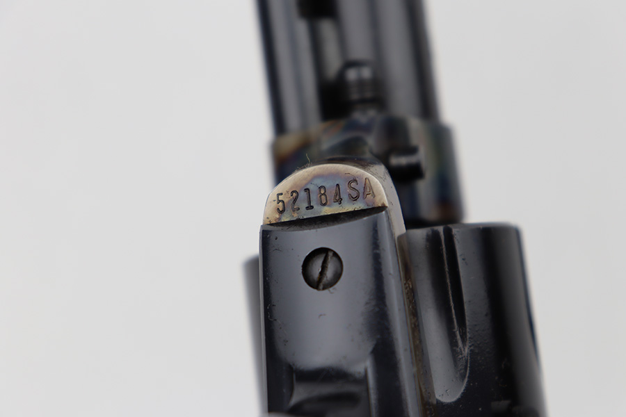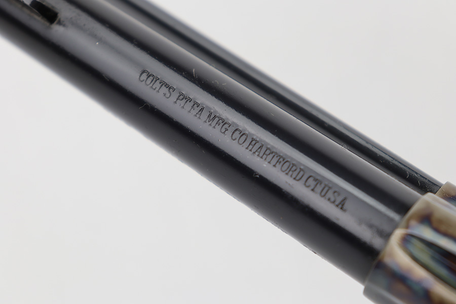 7/26/23 – This is a beautiful example of a 2nd Generation Colt Single Action Army Revolver, manufactured in 1969 and chambered in .45 Caliber. 4.75″ barrel. It is matching and has retained nearly all of its original finish. Just a few tiny scratches on the barrel and on the front strap. Gorgeous case-hardening on the frame. Barely a hint of a roll mark on the cylinder. Fitted with excellent black plastic American Eagle grips, though they are mismatched to this gun. Like-new bore. The action is very smooth.