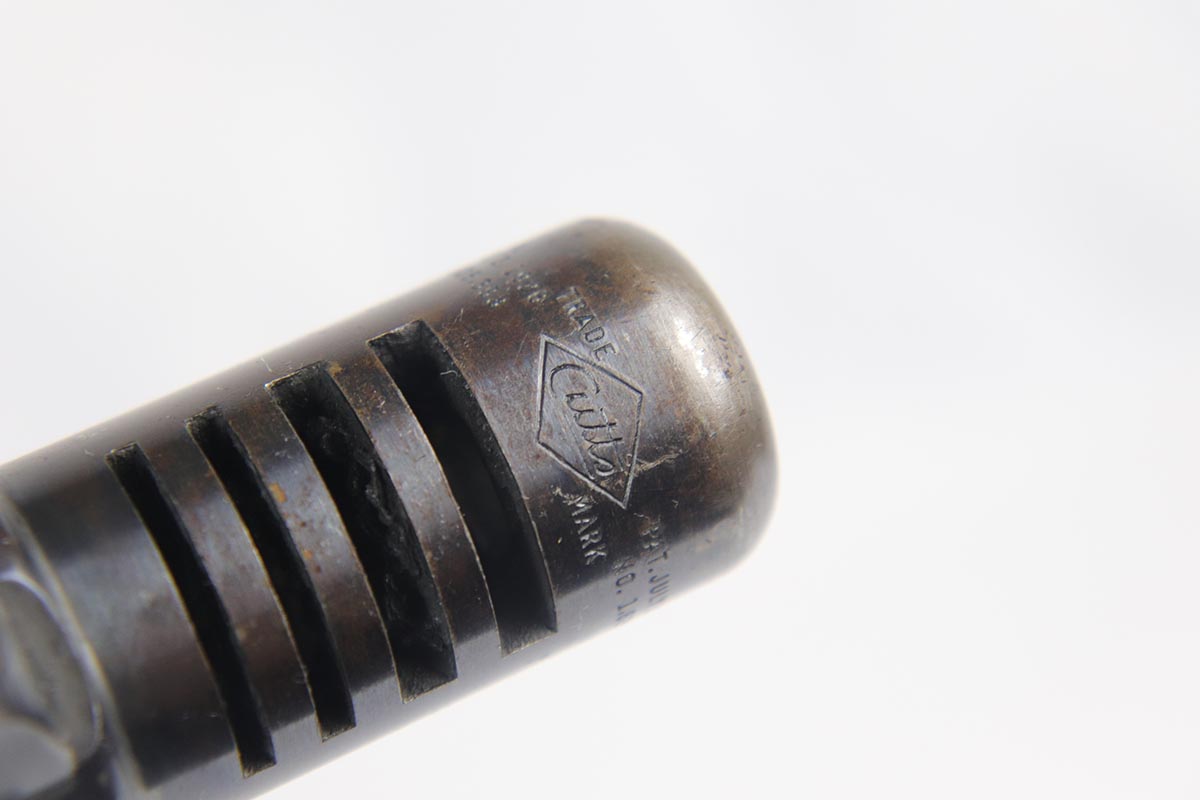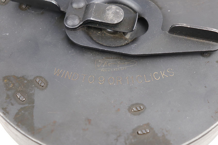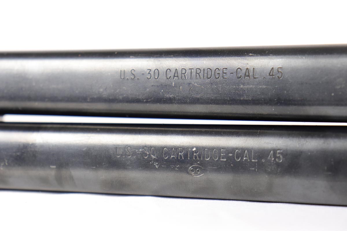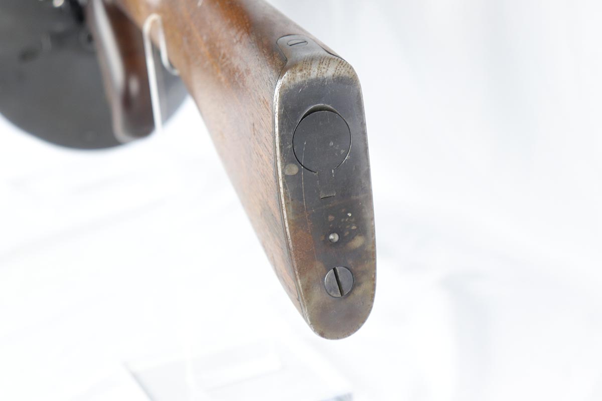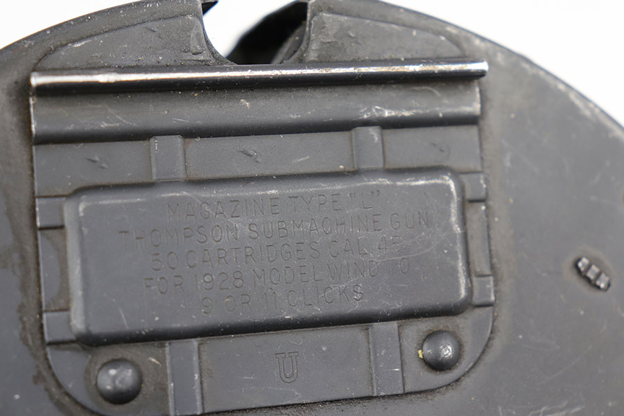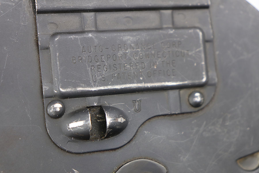 11/15/18 – This is an excellent example of the U.S. Navy overstamp Thompson with matching upper and lower receiver assemblies. Typical “U.S. Navy” added engraved marking over model and SN on left side with correct “8” stamped over “1”. Anchor proof mark present at front end of buttstock. 1928 parts verified within receiver with unknurled cocking handle. The Colt Thompson machine gun exhibited the highest levels of fit and finish. Specimens with the Cutts compensator and “U.S. Navy” markings are among the most desirable to historical collectors. Lustrous blue original finish, some wear to gray patina where the actuator rides in the receiver, and also thinning to a pleasing gray patina on the Cutts compensator. Bore is brilliant and bright with minor firing residue. Additional 1928 parts included are a knurled parkerized actuator with recoil spring and buffer assembly. Also included is an original Type L Thompson drum mag and two 30-rd magazines. This weapon is fully transferable on an ATF form 3 or form 4 as Curio & Relic eligible.