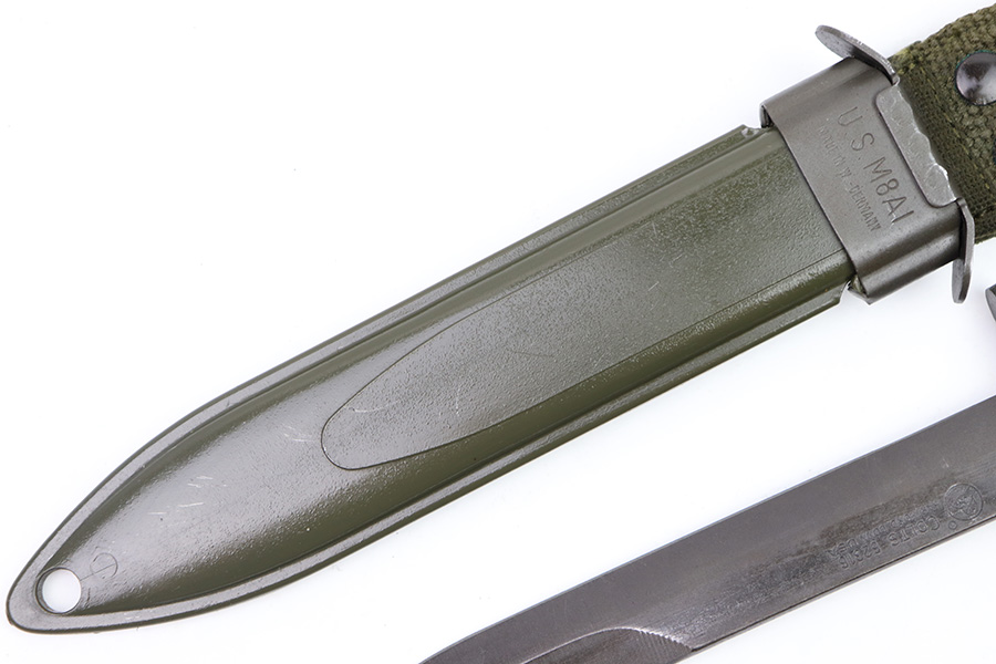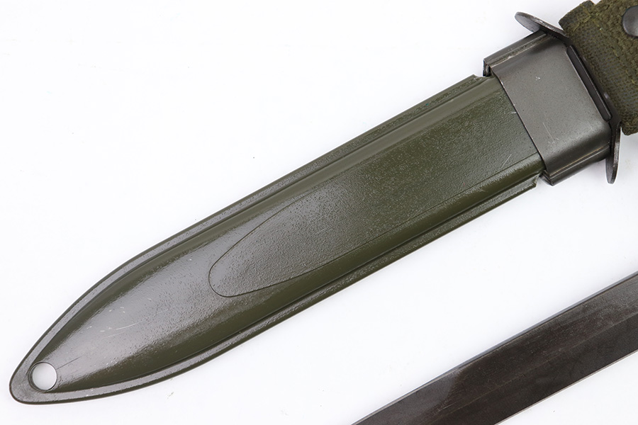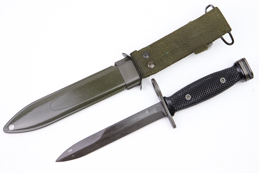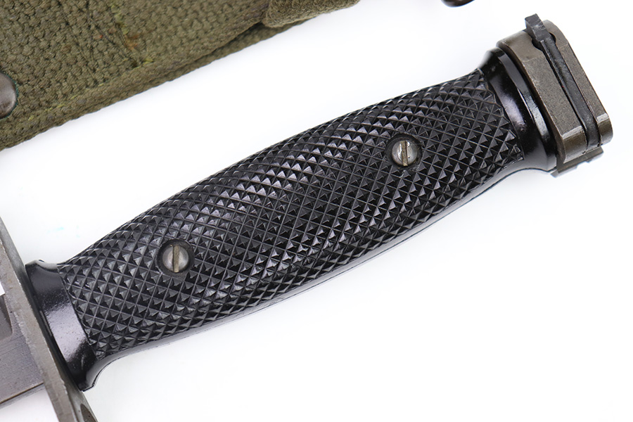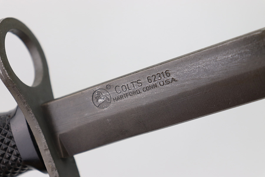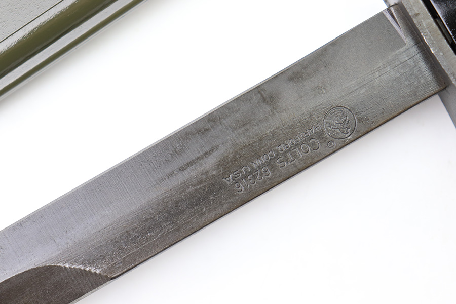 9/9/22 – This is an original US M7 bayonet made by Colt. These were made and issued with M16 rifles during Vietnam. This example is in excellent condition with a clean blade that appears unused and unsharpened. Clean finish throughout. The hand guard is stamped “US M7”. The black plastic handle is excellent with a sharp diamond pattern. Comes with a minty condition US M8A1 scabbard, as shown.