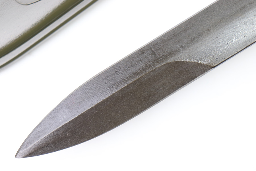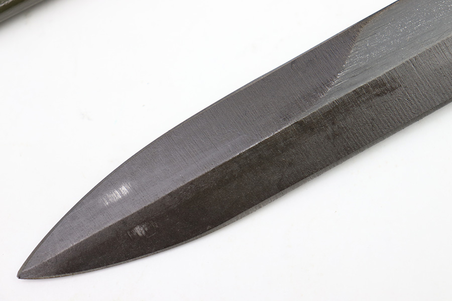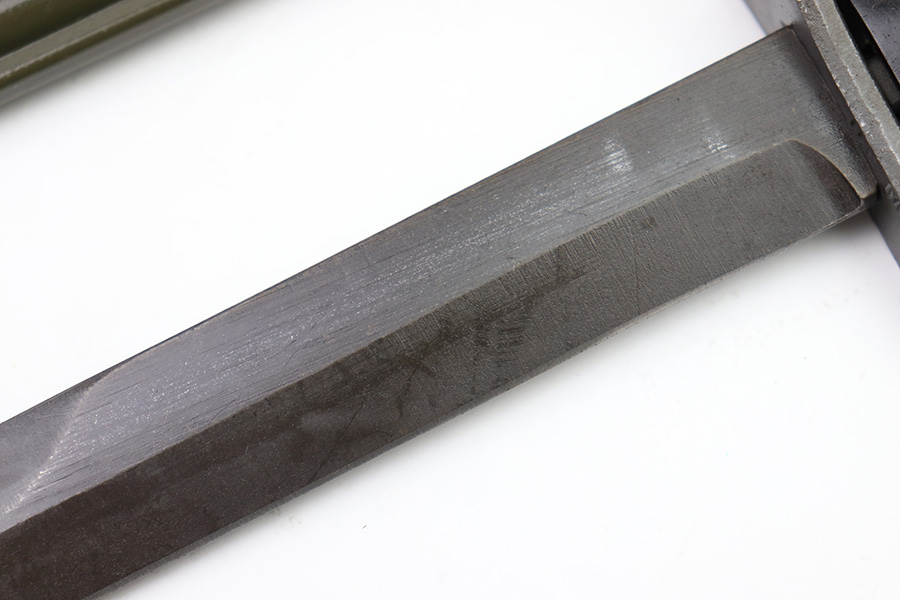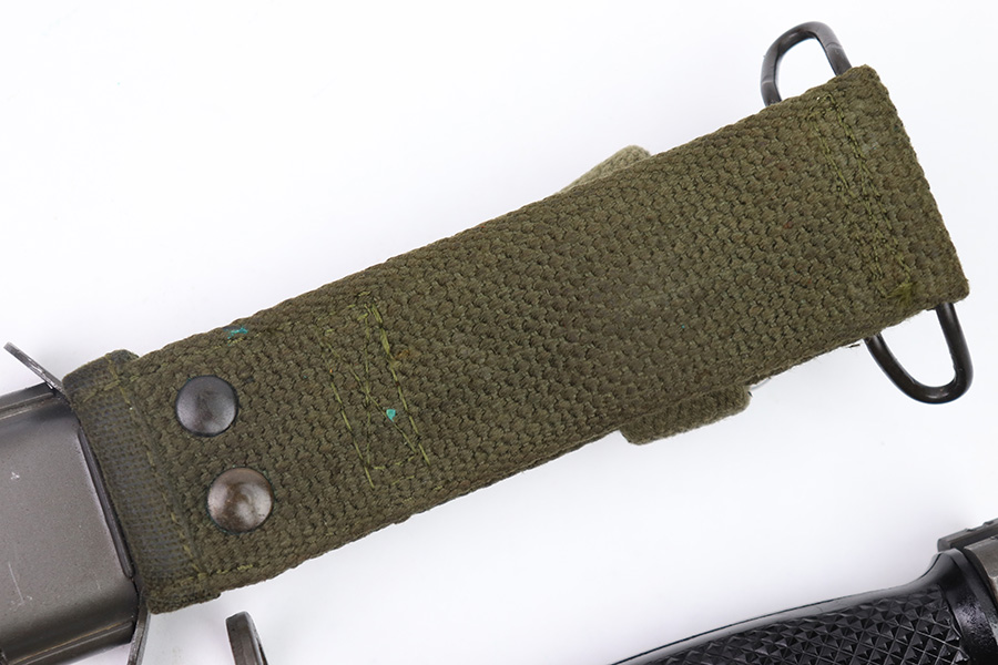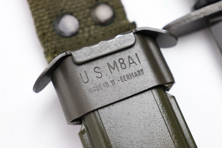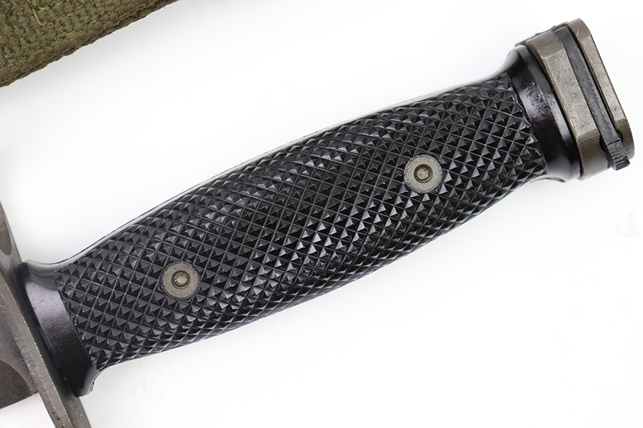 9/9/22 – This is an original US M7 bayonet made by Colt. These were made and issued with M16 rifles during Vietnam. This example is in excellent condition with a clean blade that appears unused and unsharpened. Clean finish throughout. The hand guard is stamped “US M7”. The black plastic handle is excellent with a sharp diamond pattern. Comes with a minty condition US M8A1 scabbard, as shown.