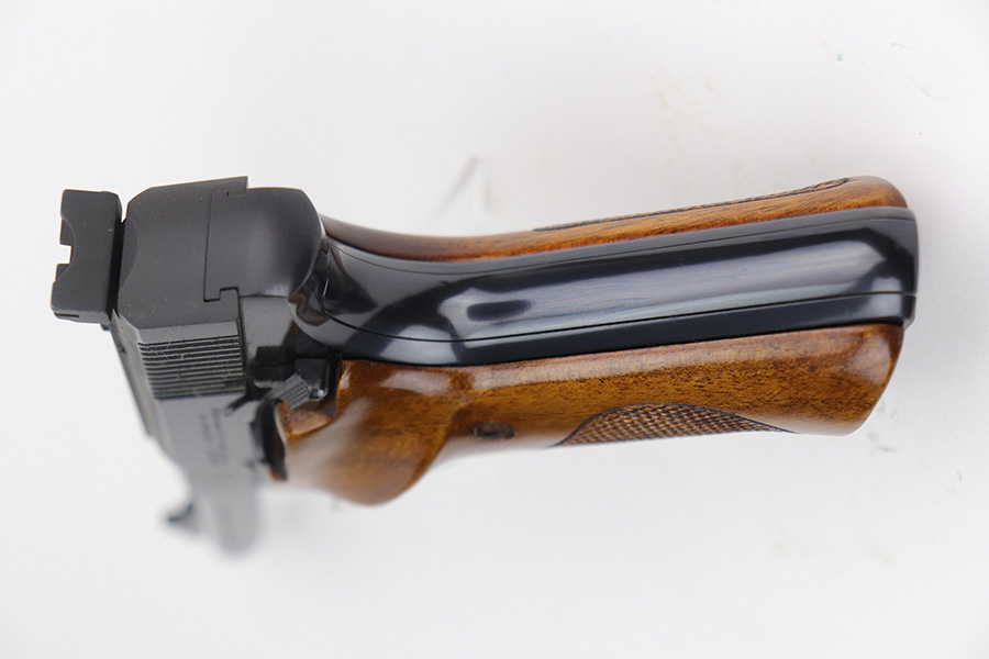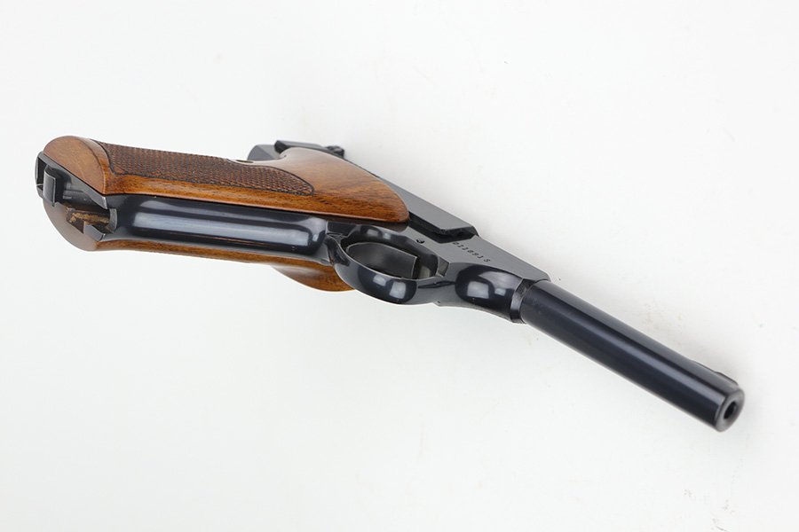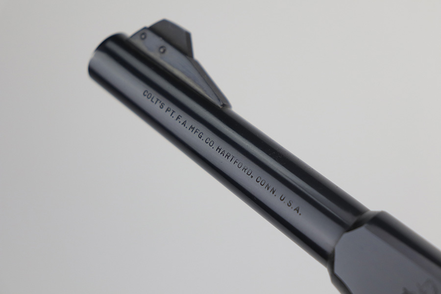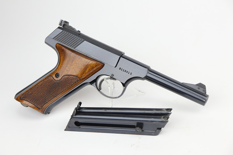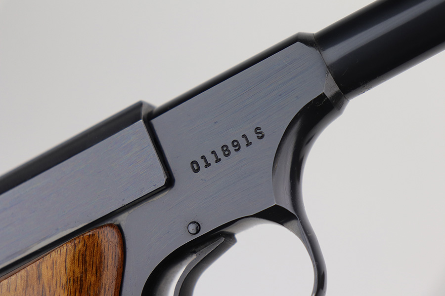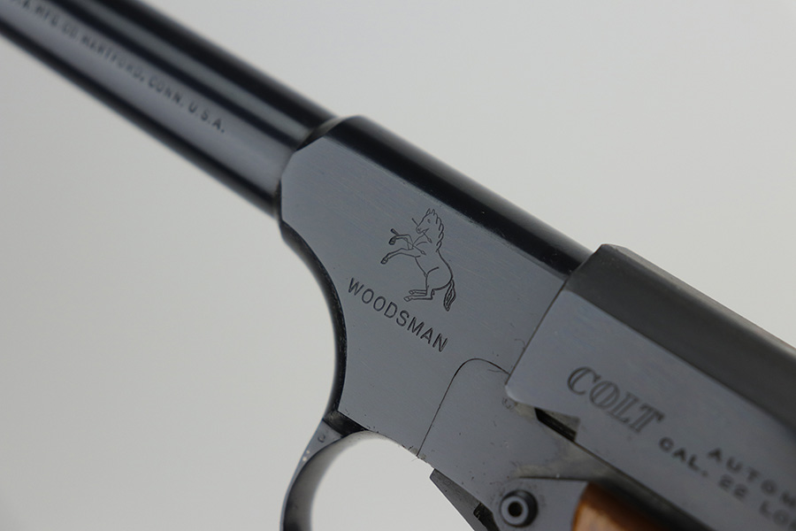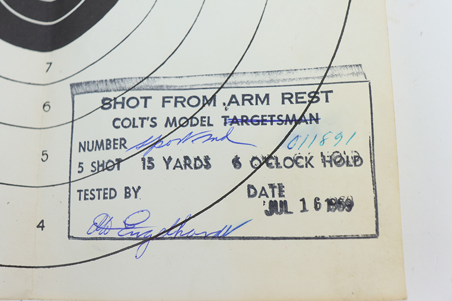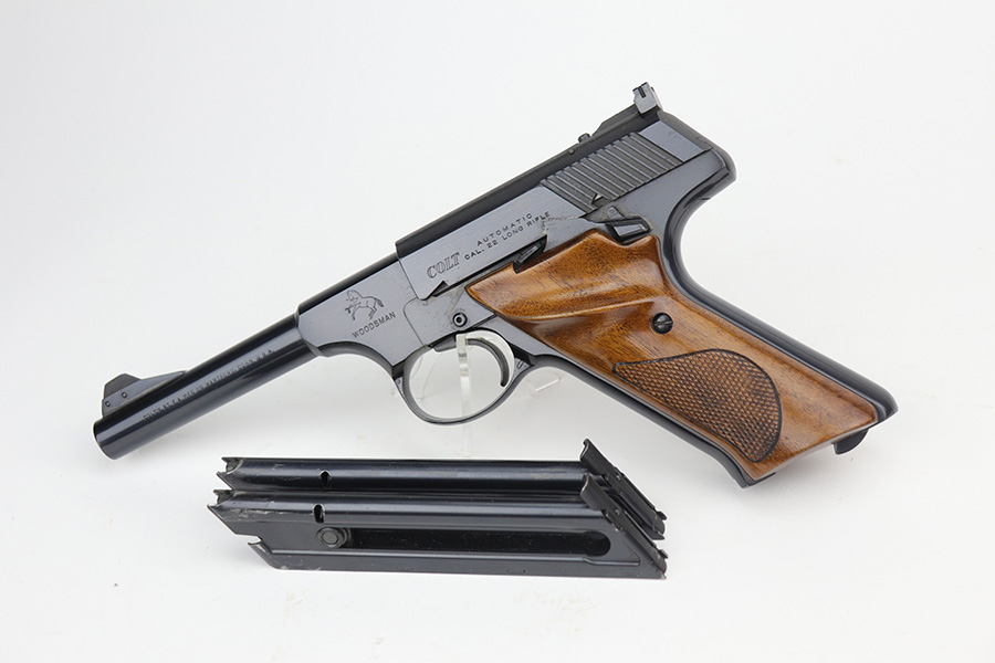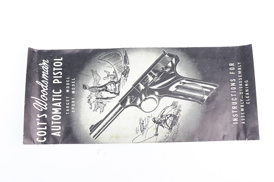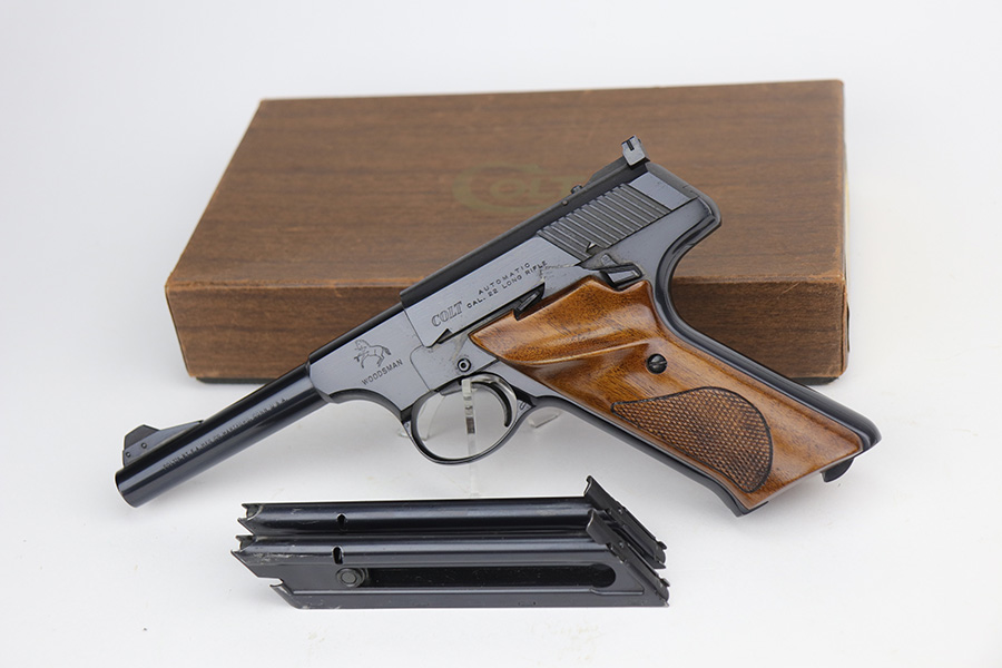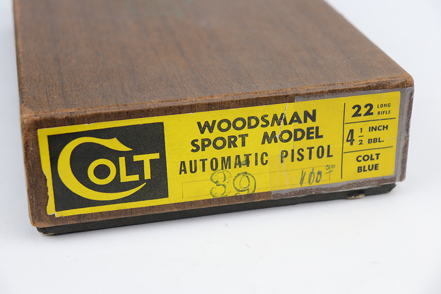 10/28/21 – This is a minty Colt Woodsman in its original, matching box. Made in 1969, the pistol has just a little bit of wear around the muzzle, but otherwise looks nearly new. It’s a third series example with 4.5 inch barrel. Mint bore and grips. Comes with a total of two magazines. It also includes the Colt tool, manual and the original matching test target. Box is correctly hand numbered and matching on the bottom. It’s in good condition aside from one edge of the bottom which is separating from the side.