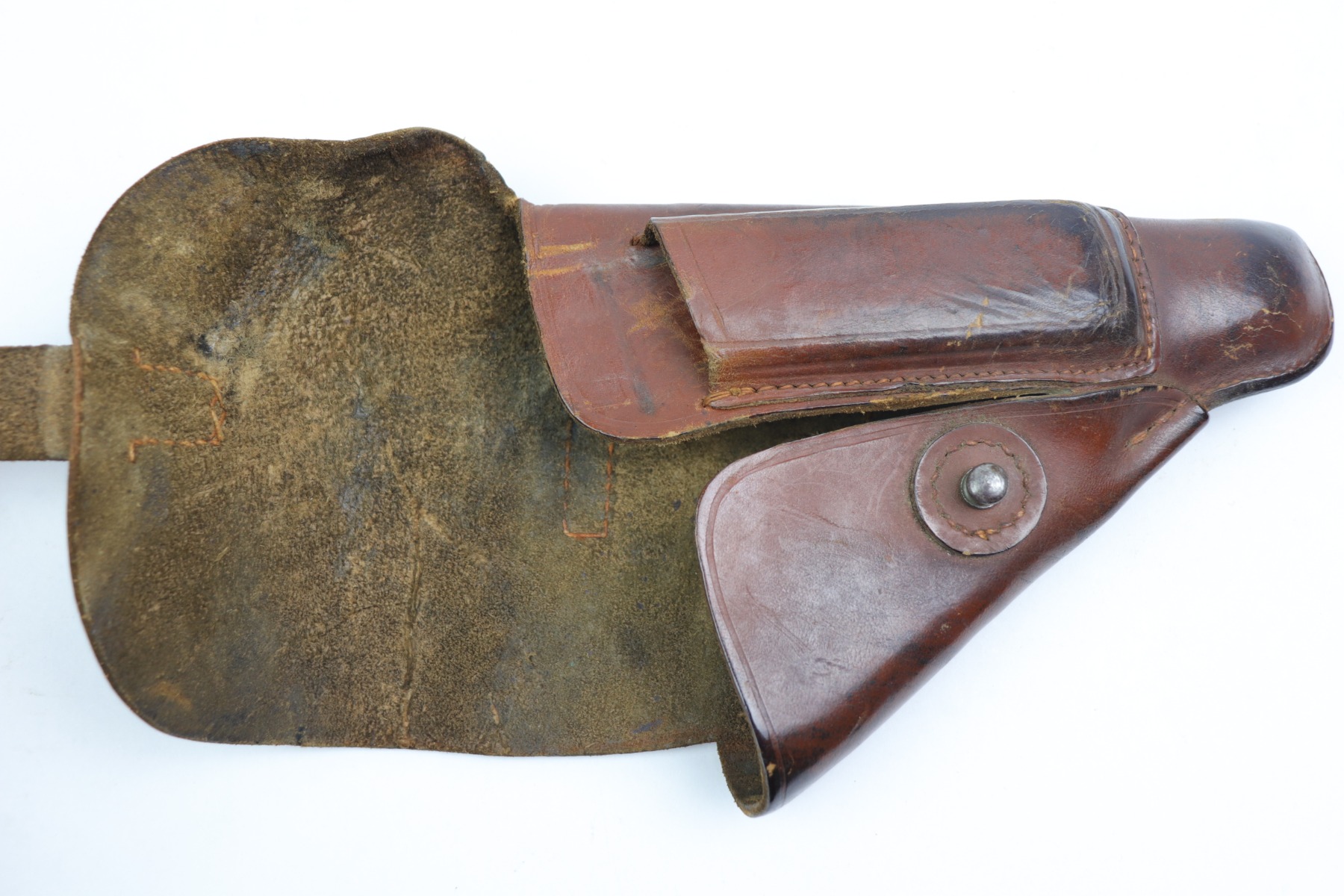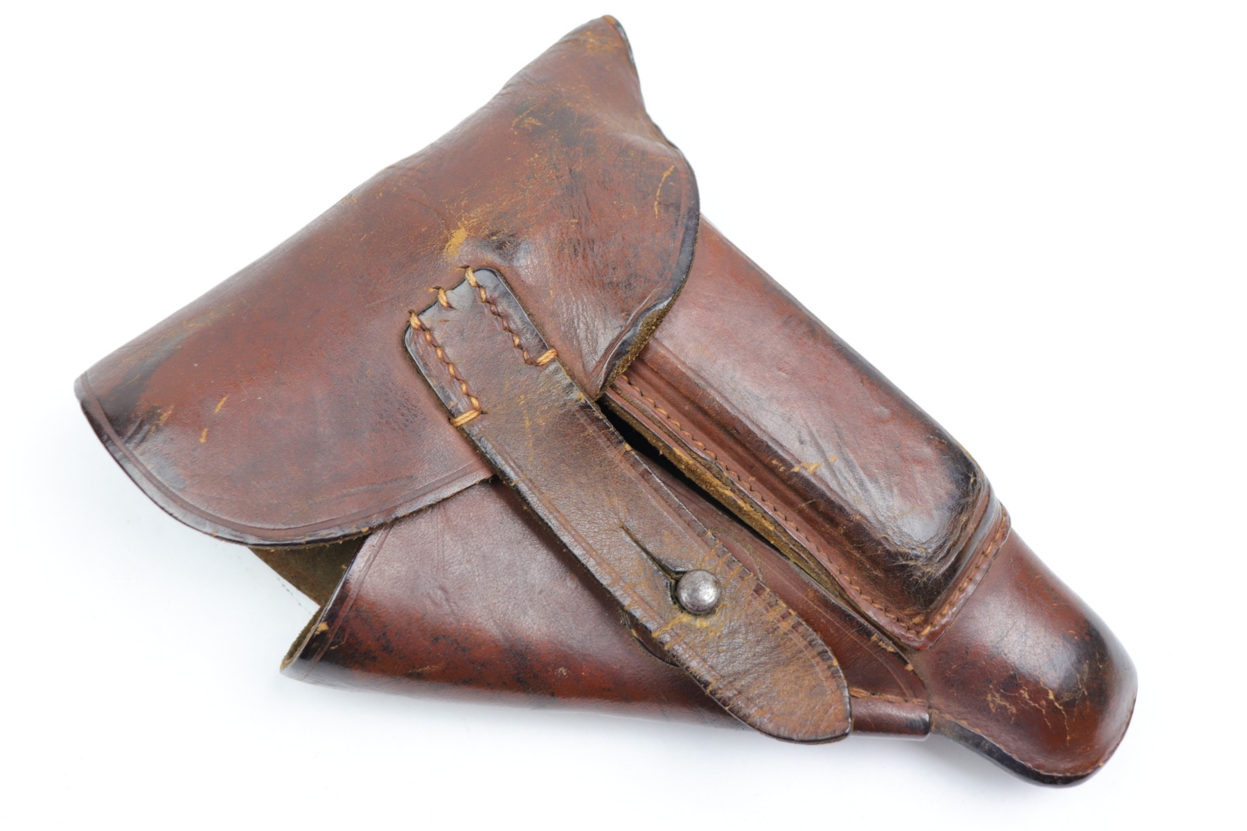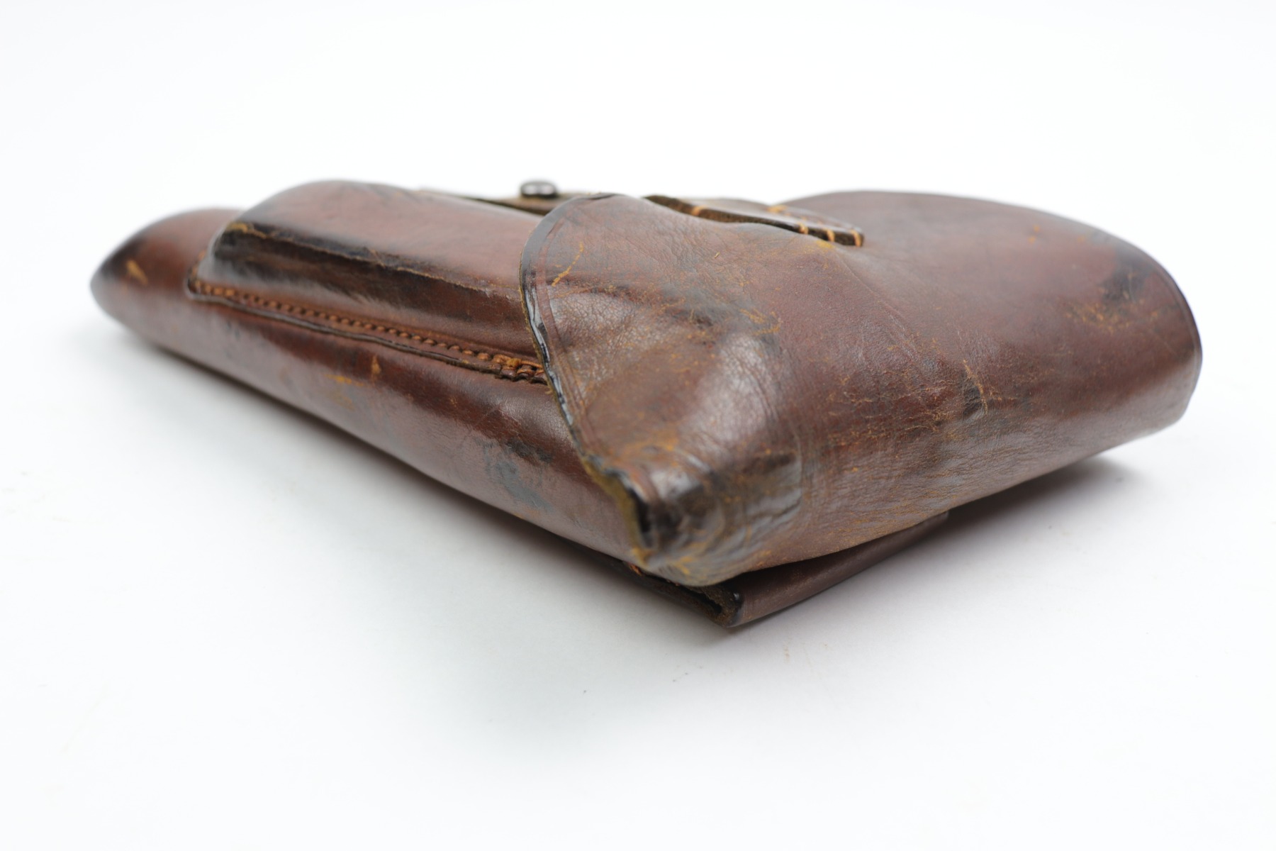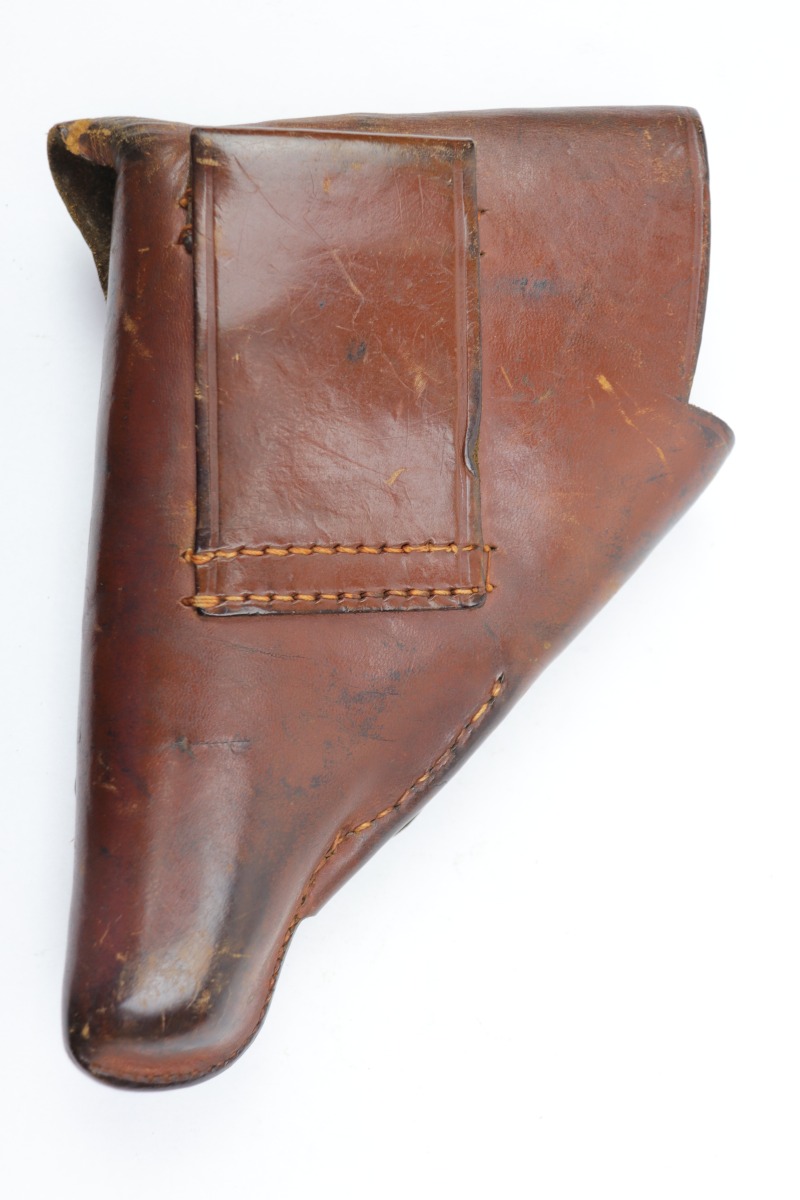12/28/20 – This is a commercial style holster for a 7.65mm pistol. Our guess is this holster was made immediately post WW2 or at the end of the war. There are no markings but the leather seems aged,. Stitching is all in tact with no notable flaws. Shows signs of previous use but no major issues.