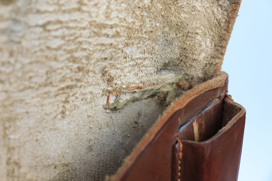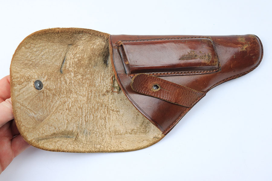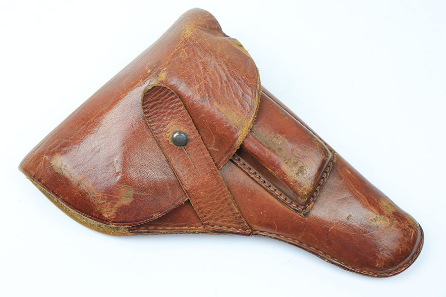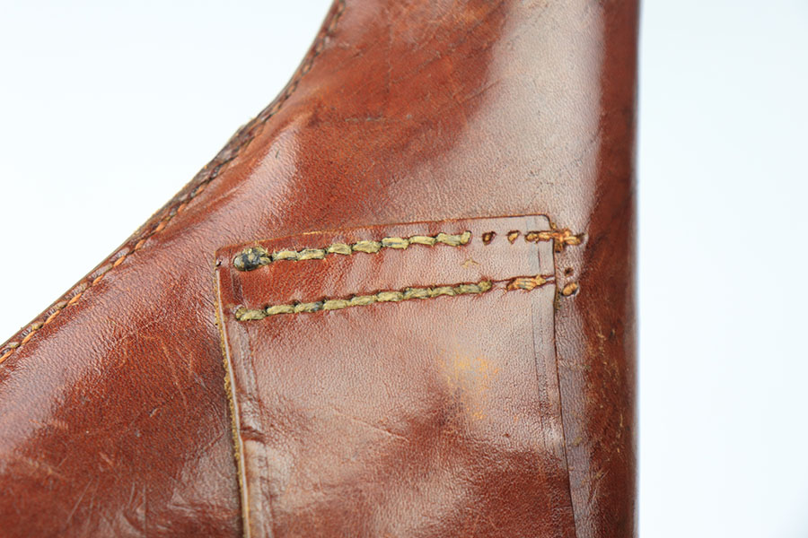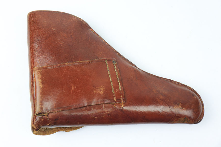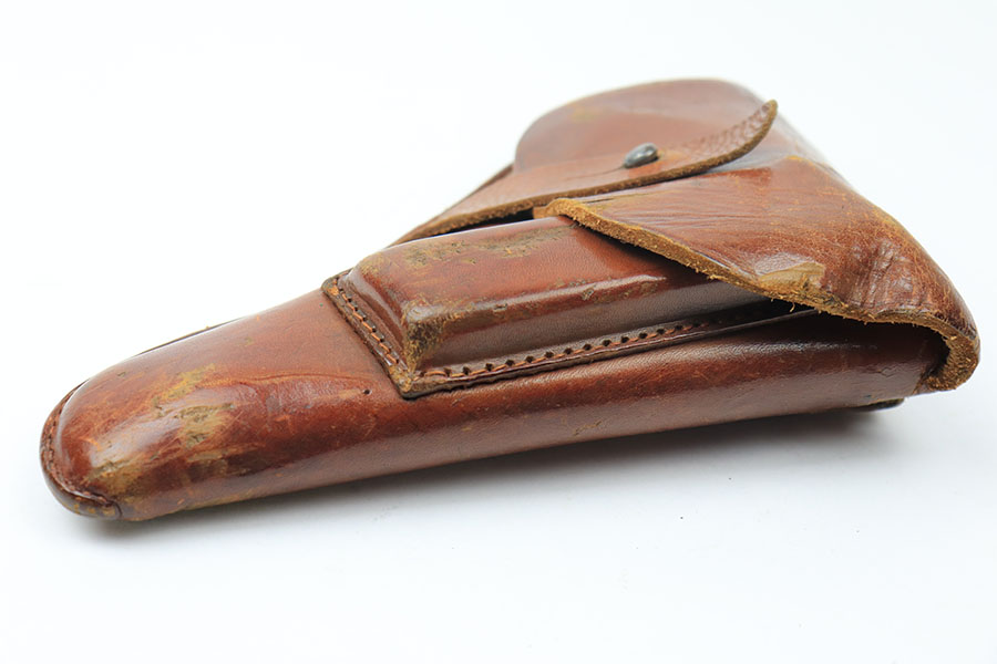 6/1/21 – This is a commercial, unmarked pistol holster for a 7.65mm axis pistol. Commonly seen paired with a Mauser HSc. The holster has no markings or stamps, but is WW2 style and shows typical signs of use and aging. The holster belt loop has been restitched, as shown in photos. There’s also some surface scratching on the leather, but no major damage.
