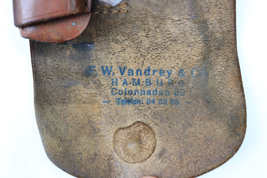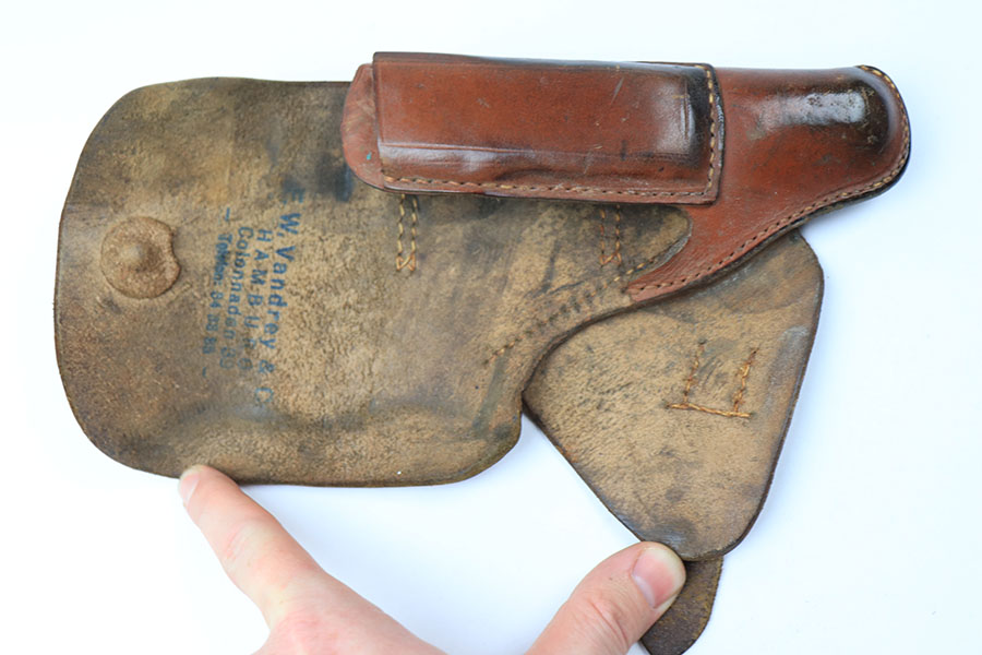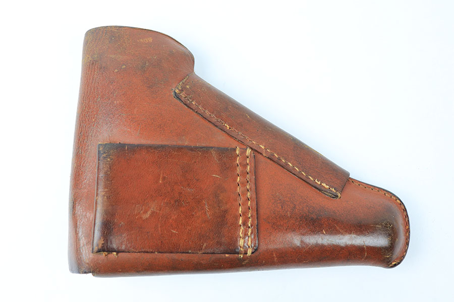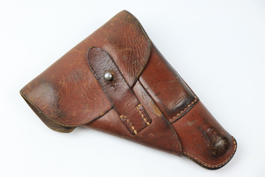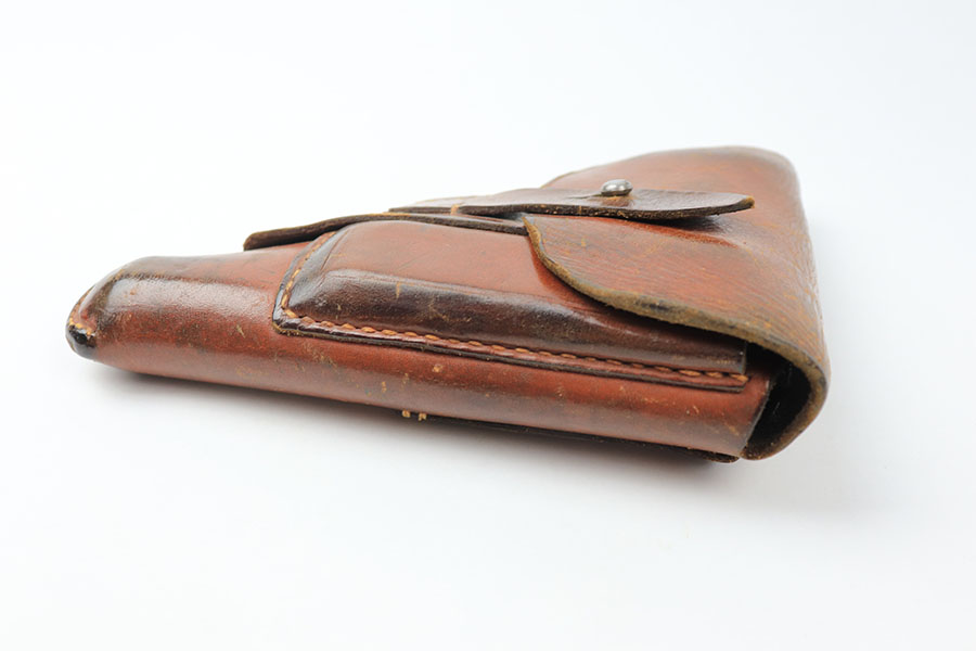 6/30/21 – This is an original WW2 era holster for a 7.65mm Axis pistol such as a Walther PP. The holster has no markings or stamps, except for some hand-writing on the interior leather. Shows typical signs of use and aging but no excessive wear. No stitching issues.