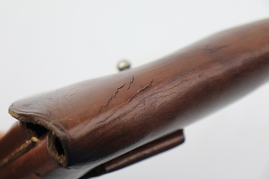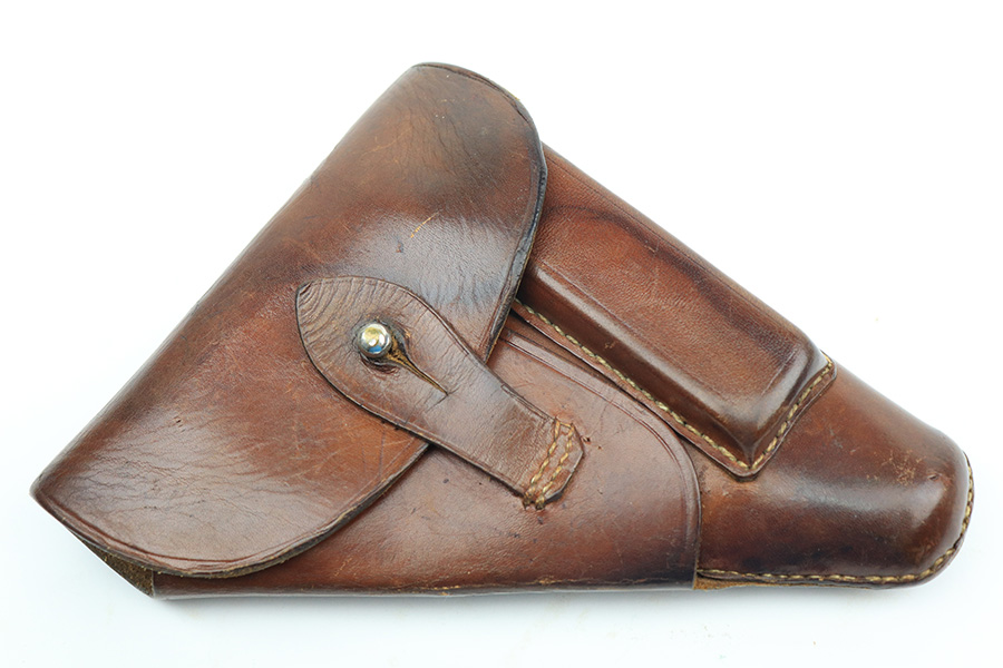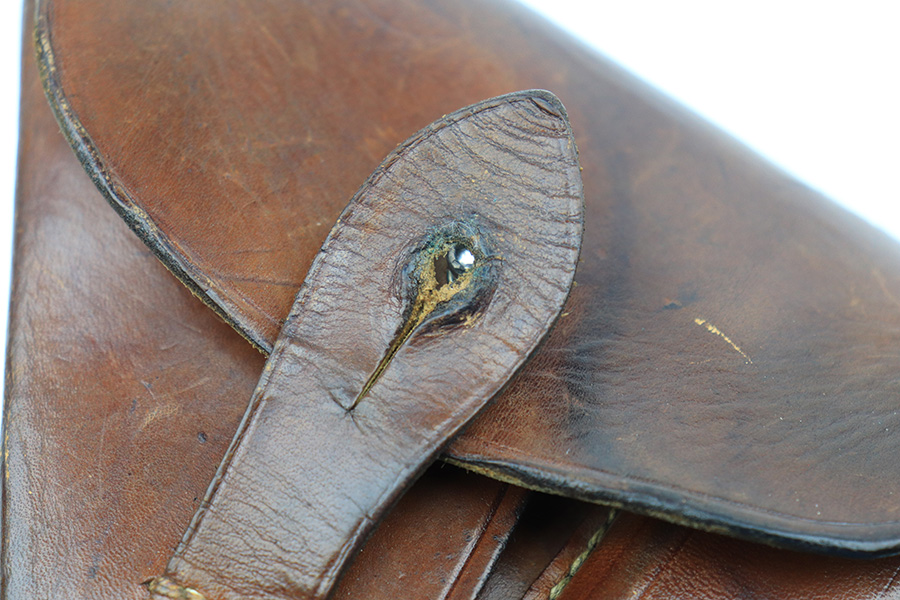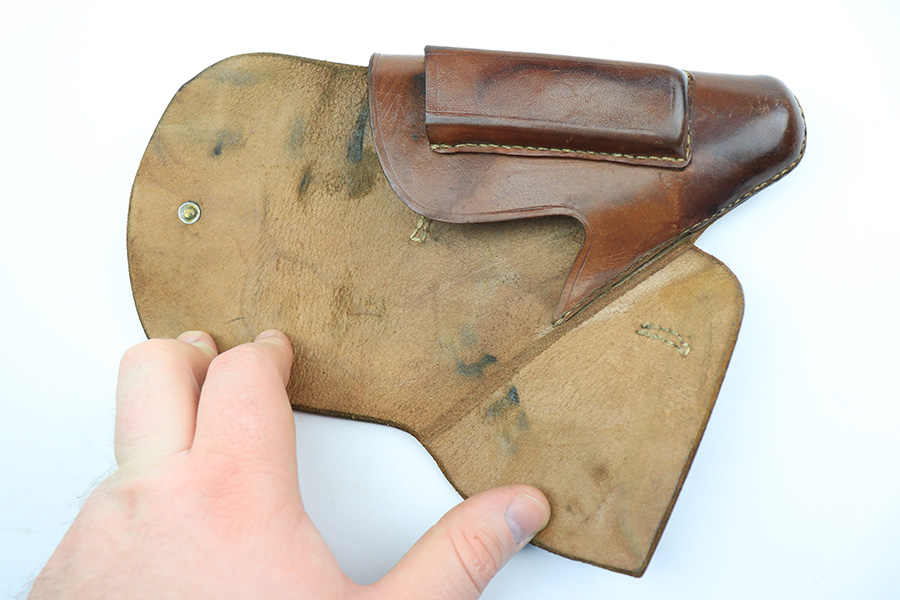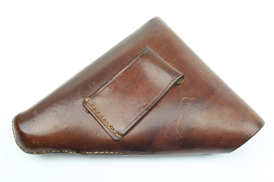 12/1/21 – This is an unmarked, commercial 7.65mm pistol holster. The leather has normal signs of aging and light use wear but no major issues. Fairly clean interior leather. The stitching is all tight and original without issue.