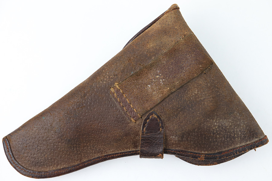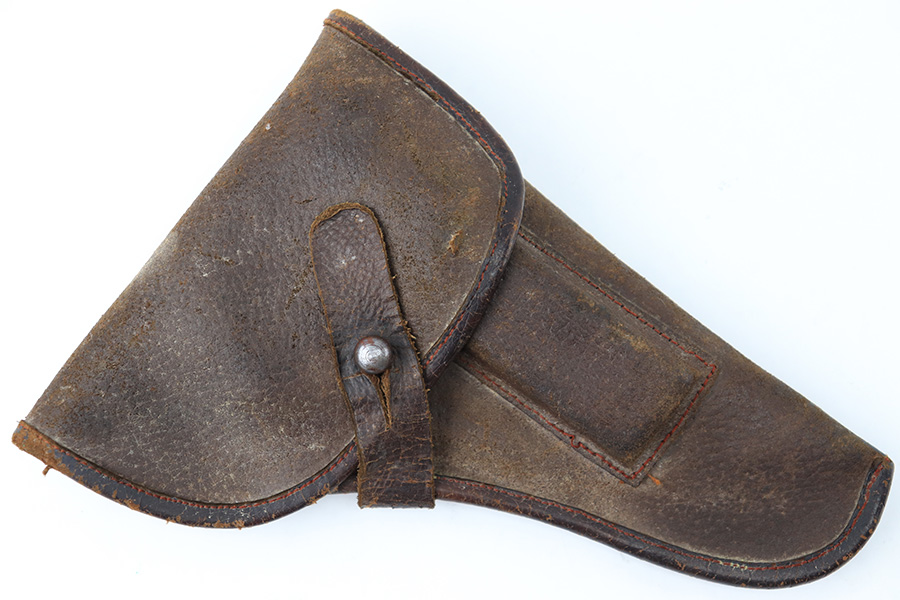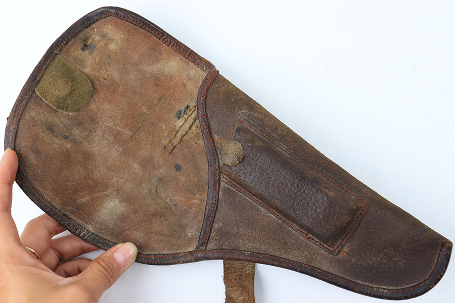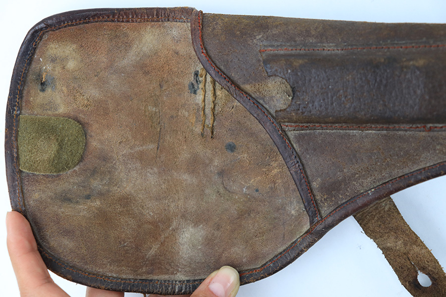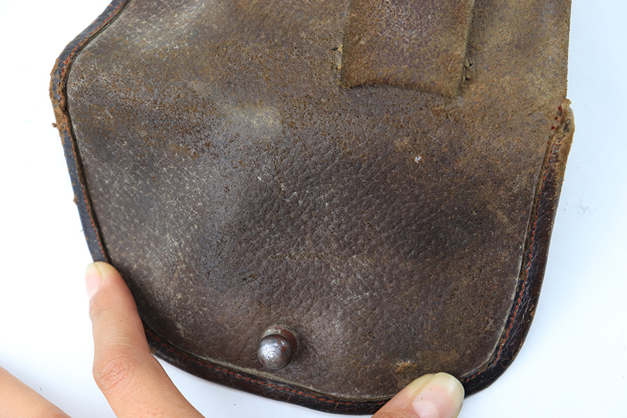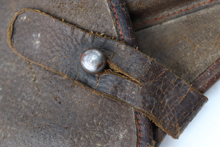 8/21/23 – This is a commercial 7.65mm pistol holster. Fits a Walther PP, Mauser HSC, Sauer 38h, or similar sized 7.65mm pistol. The holster is German style and likely WW1 or WW2 era production. The exterior leather has a textured finish that’s similar to pigskin style leather. There is some scuffing along the reinforced edges of the holster, as well as general use and aging wear throughout. Normal pliability. There’s some loose stitches on the magazine pouch, but the stitching is still intact throughout.