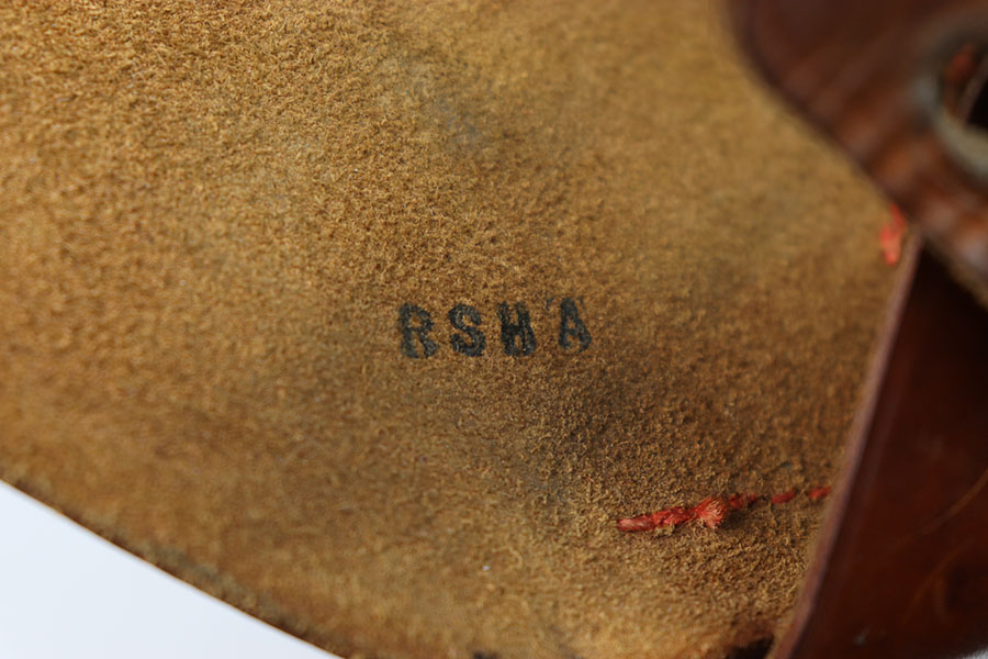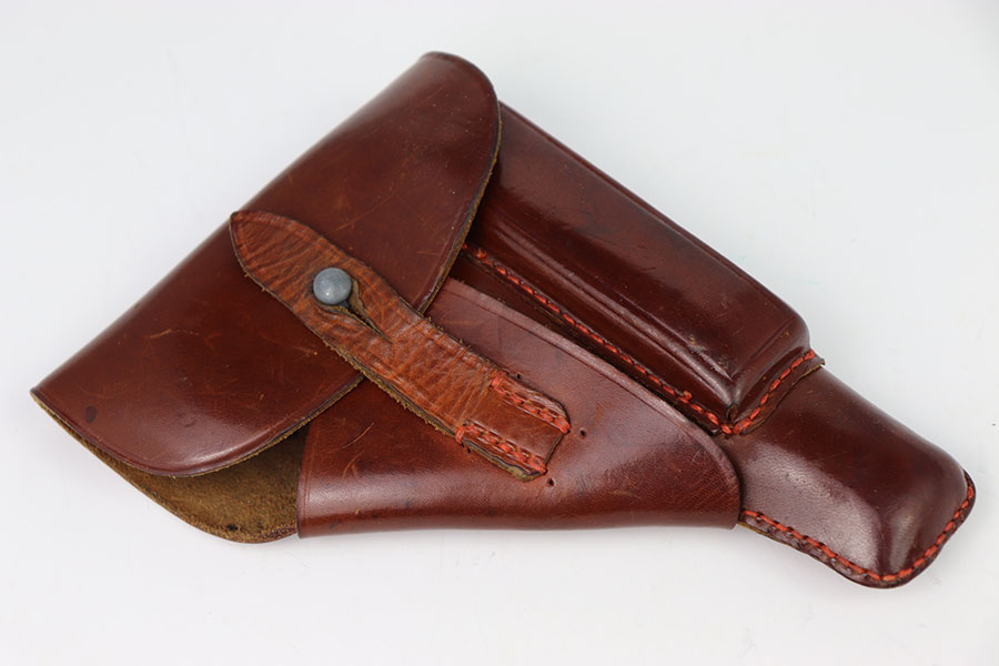 3/7/24 – This is an excellent condition Commercial 7.65mm holster for a Walther PPK or similar sized pistol. The holster is typical WW2 era style production with reddish colored stitching and excellent, clean leather throughout. Nearly no signs of previous use and natural aging throughout, but no major issues. Some interior writing from a previous owner. The inside leather is ink stamped “RSHA” that we believe is fake / reproduction. Priced accordingly.