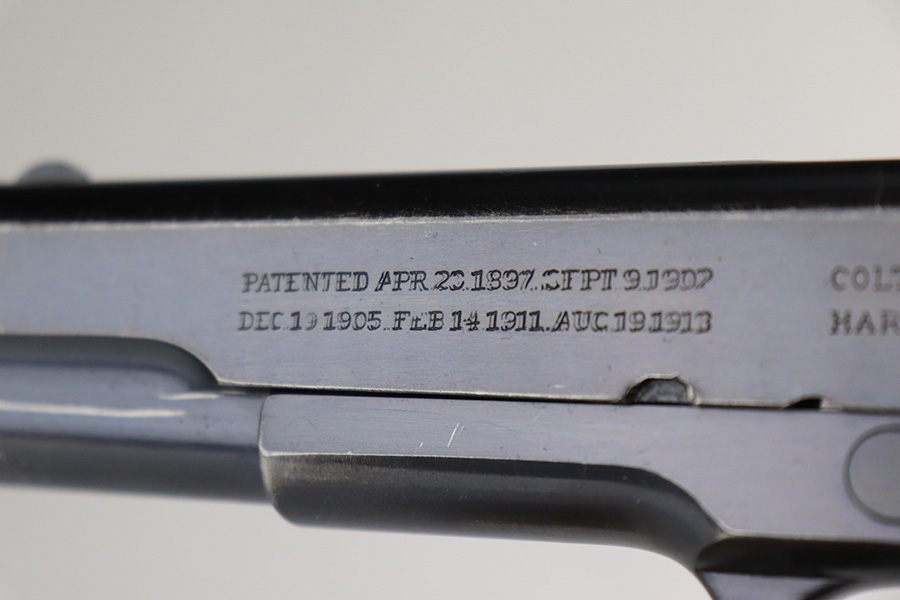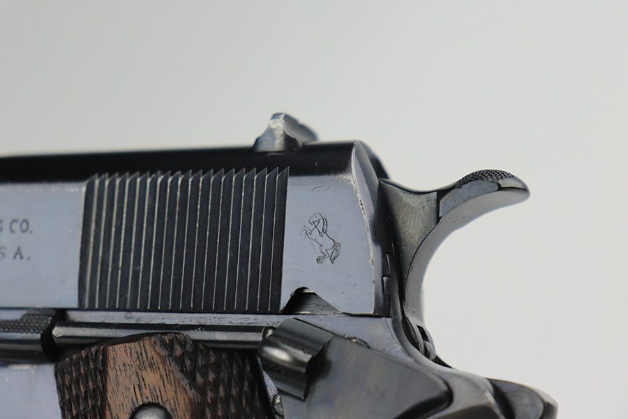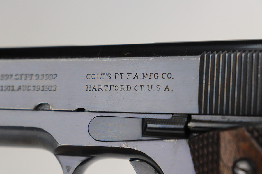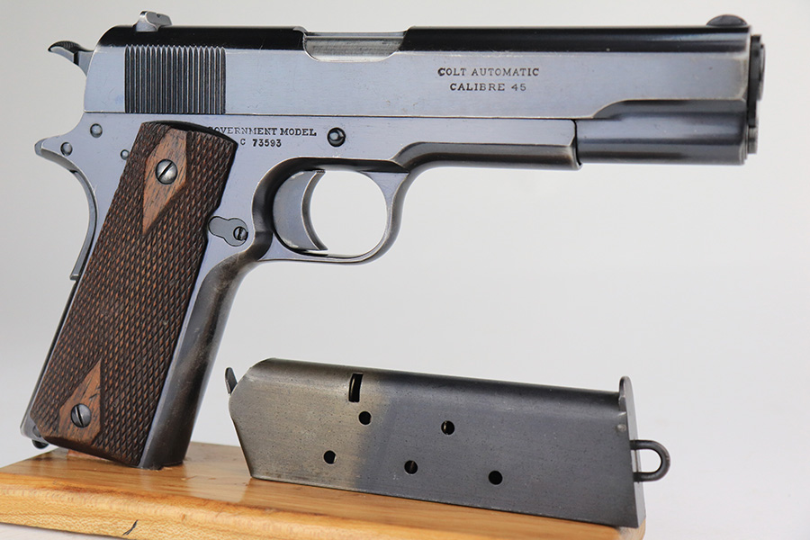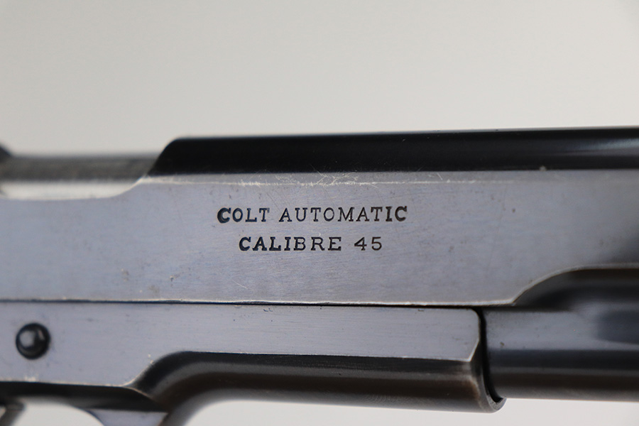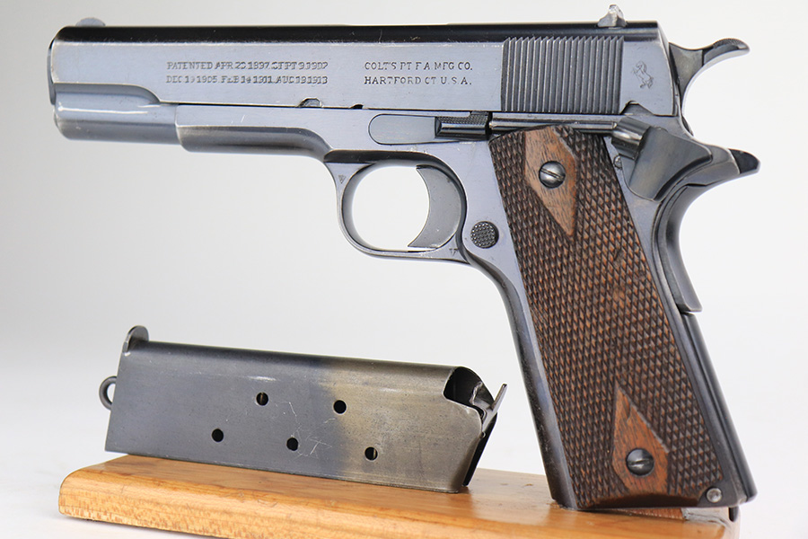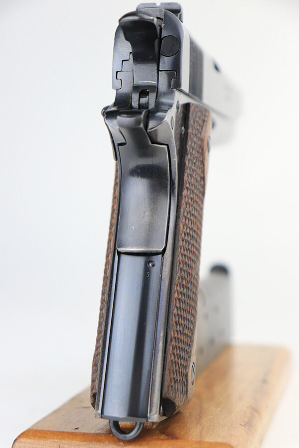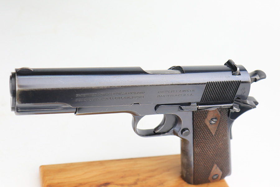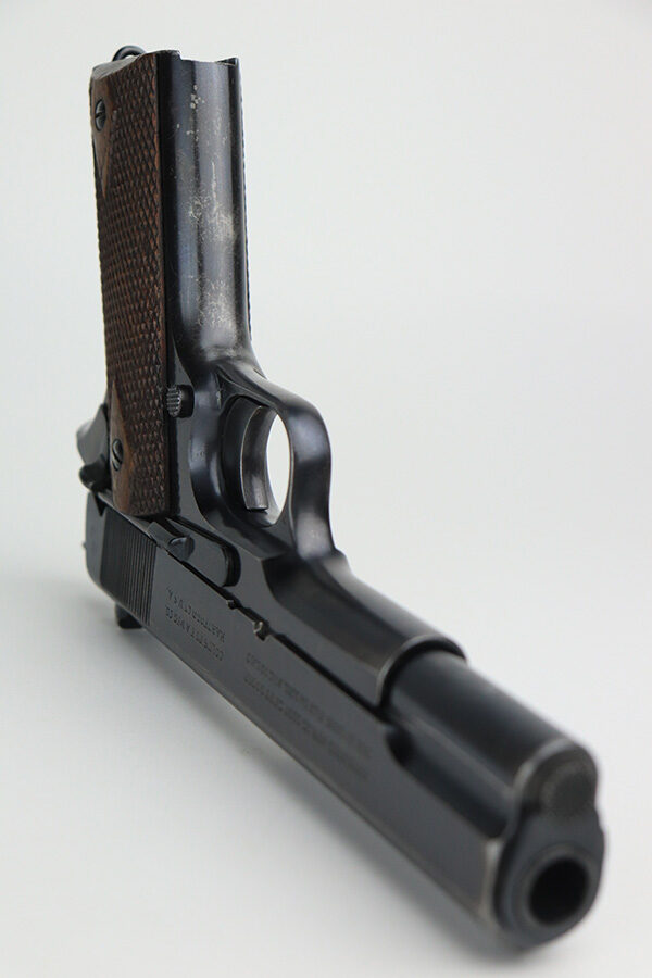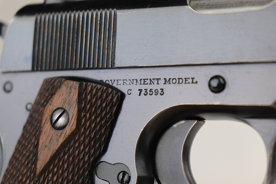 12/13/21 – This is a very nice example of a Colt Government Model 1911 sold in the commercial market in 1916. The slide legend on the left side of the slide has a factory double-stamp, giving it a very cool “shadowed” appearance. Comes with a Springfield barrel that has been polished around the ejection port. The gun has retained about 92% of its original Colt bluing. There are areas of somewhat scratchy wear concentrated around the high edges of the slide, around the muzzle, and on the front strap. Very minor thinning on rear grip safety. Some very light scratches/handling marks here and there. Comes with very nice period-correct wood grips (minor bruising here and there) and a two-tone magazine with lanyard loop. The bore is near-mint.