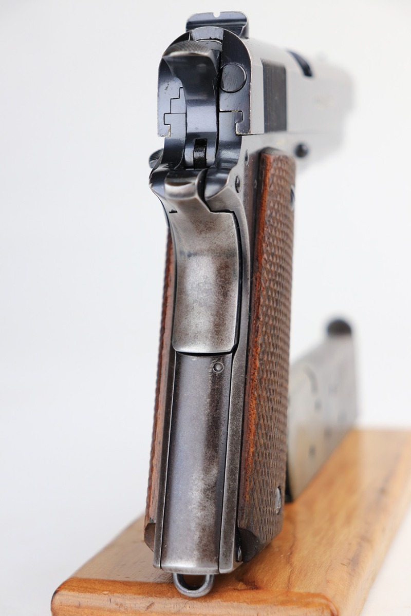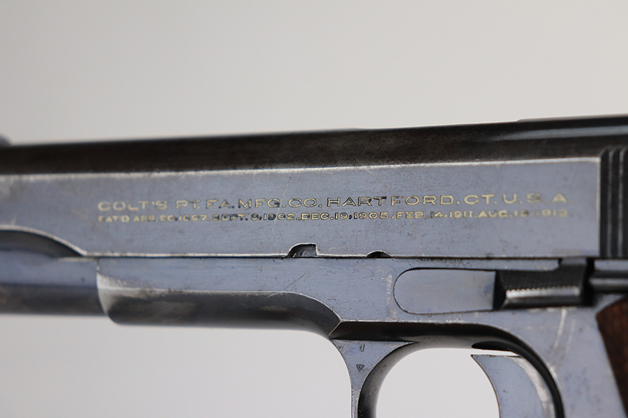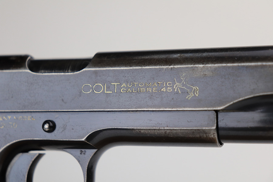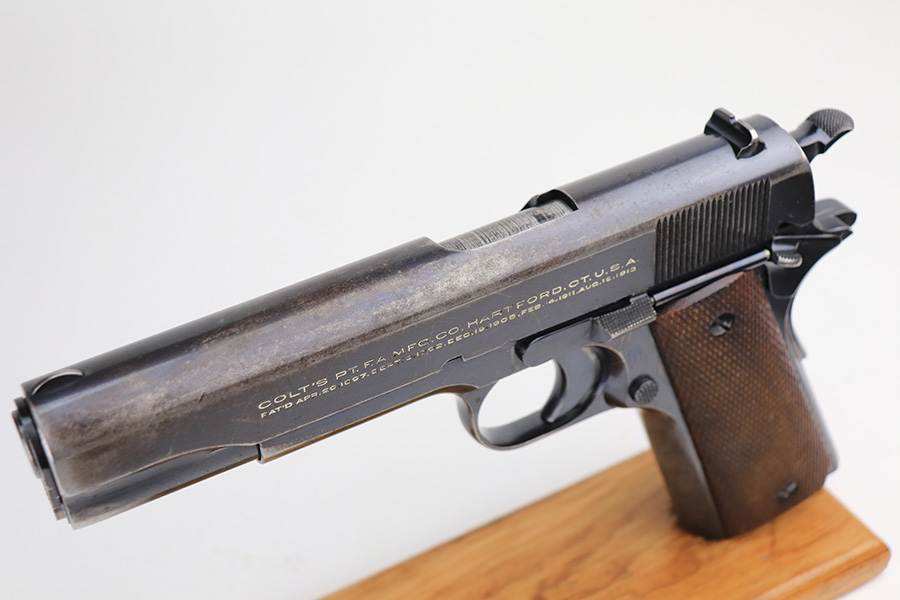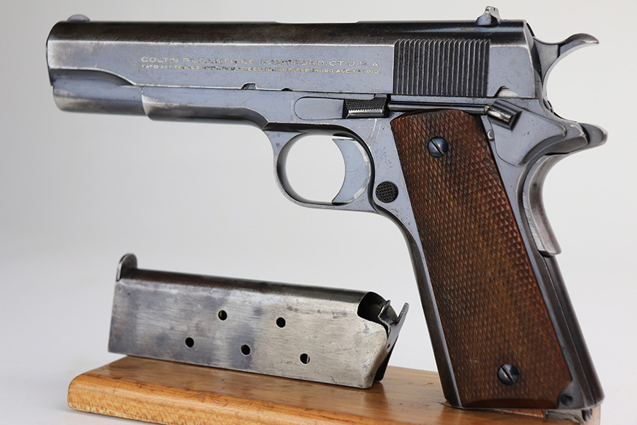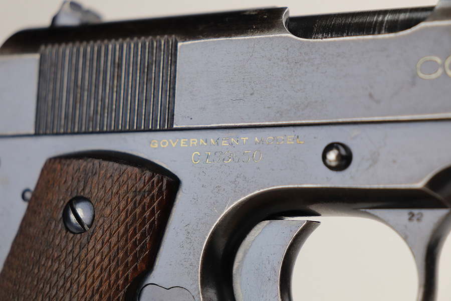 1/25/22 – This is a nice example of a Colt Government Model 1911 sold in the commercial market in 1922. The gun is all correct except for the barrel, which is a post-war Colt barrel. It has retained roughly 70% of its bluing. Most of the finish loss is on the grip straps and on the top of the slide. There is also wear on the high edges in general and around the muzzle. Tiny dots of oxidation generally in the areas of wear. Some light surface scratches here and there, most noticeable on both sides of the slide. Comes with nice wood grips and a proper two-tone magazine. The bore is near-mint.