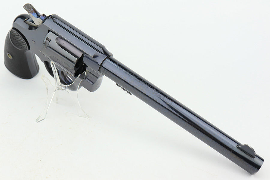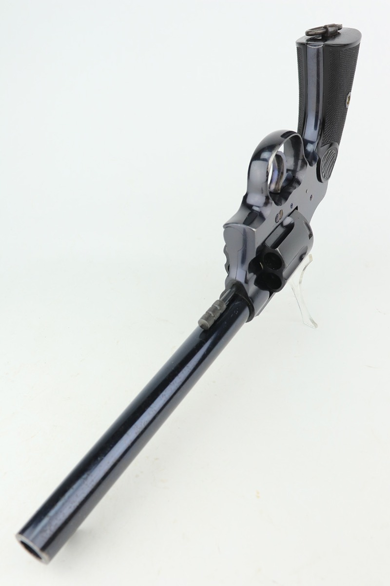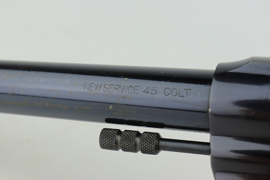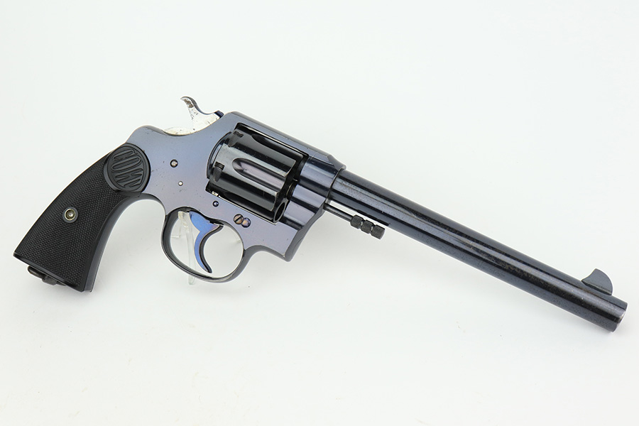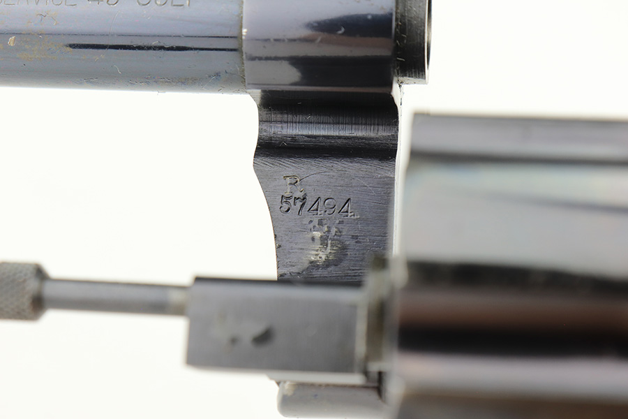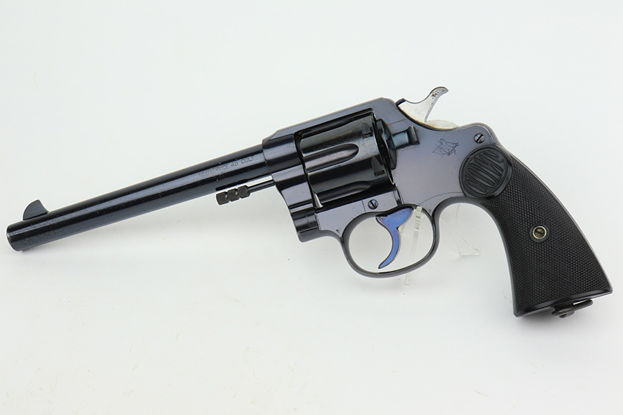 2/3/23 – This is an excellent commercial Colt New Service revolver from 1912. Commercial examples are notably less common than military ones, with about 1/3 of production being for the commercial market. This one is in great shape with around 95% of that beautiful Colt blue remaining. While there isn’t much bluing loss, there is oxidation all along both sides of the barrel. Terrific Colt hard rubber grips with no cracks or chips. Barrel is 7.5in with a minty bore. Good timing/lockup.
