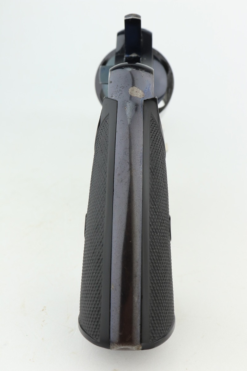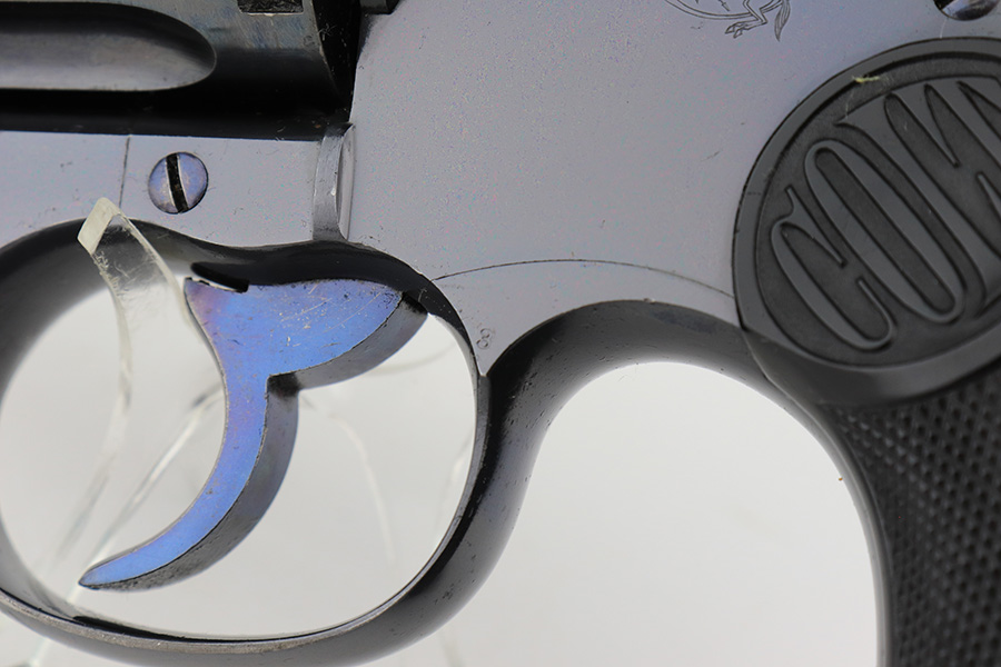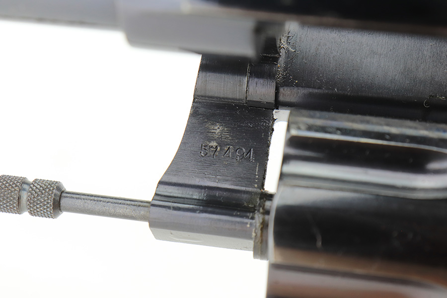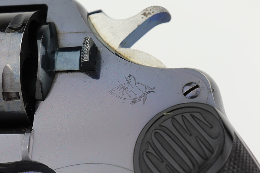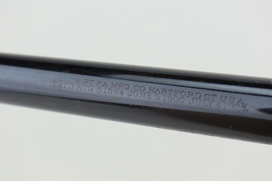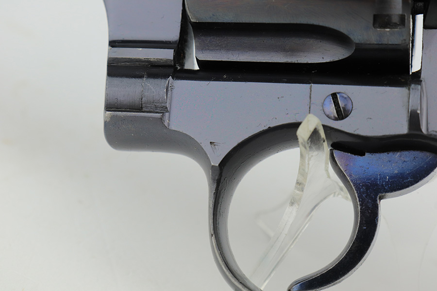 2/3/23 – This is an excellent commercial Colt New Service revolver from 1912. Commercial examples are notably less common than military ones, with about 1/3 of production being for the commercial market. This one is in great shape with around 95% of that beautiful Colt blue remaining. While there isn’t much bluing loss, there is oxidation all along both sides of the barrel. Terrific Colt hard rubber grips with no cracks or chips. Barrel is 7.5in with a minty bore. Good timing/lockup.