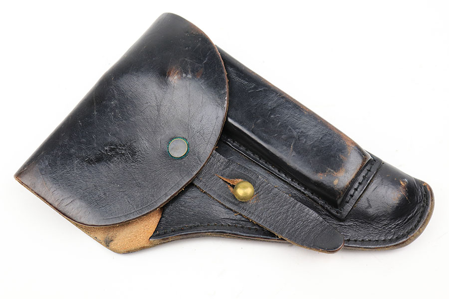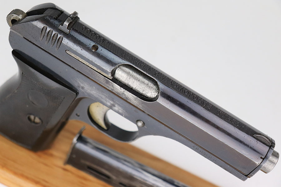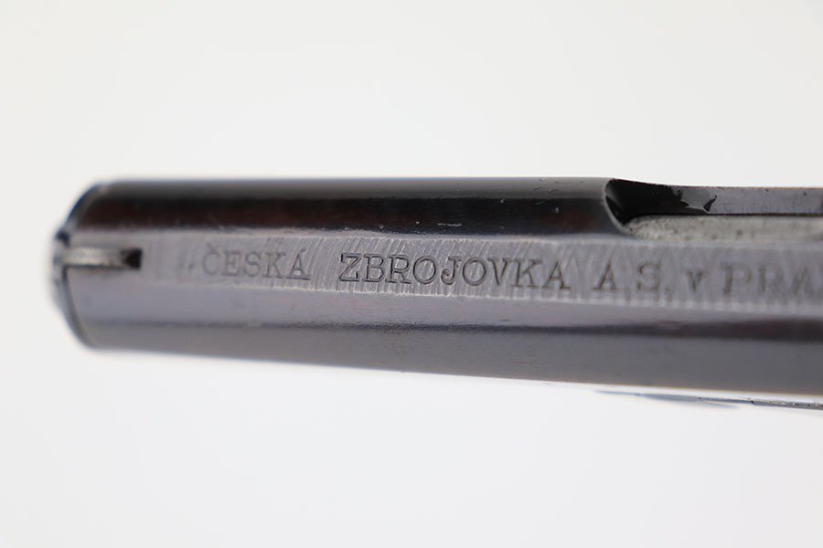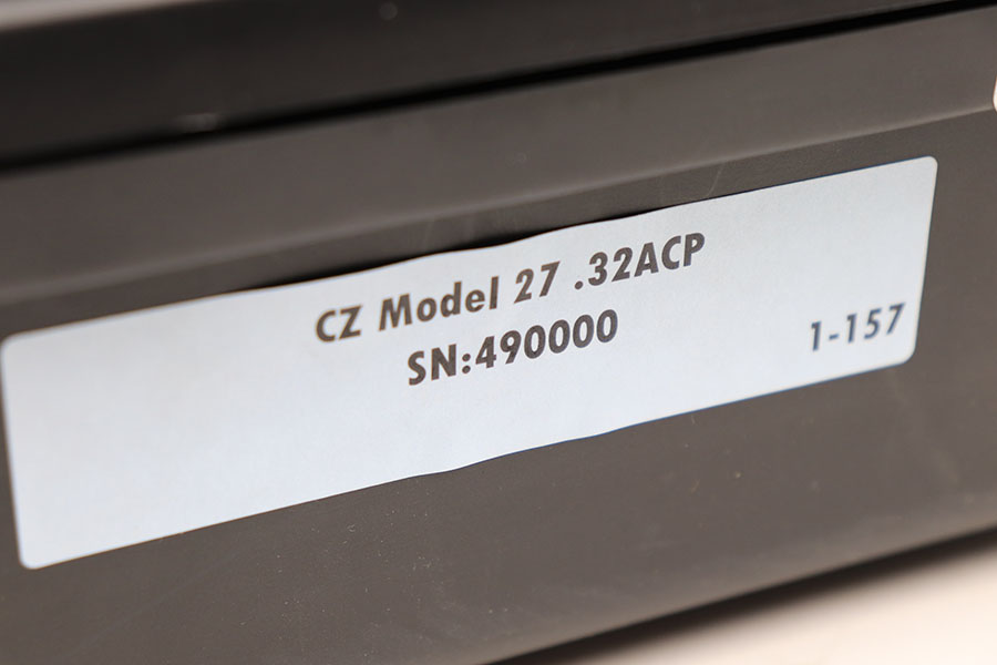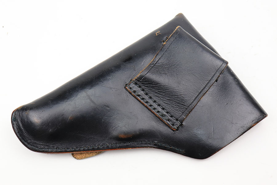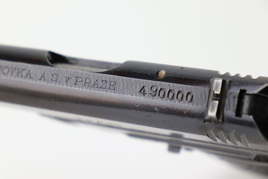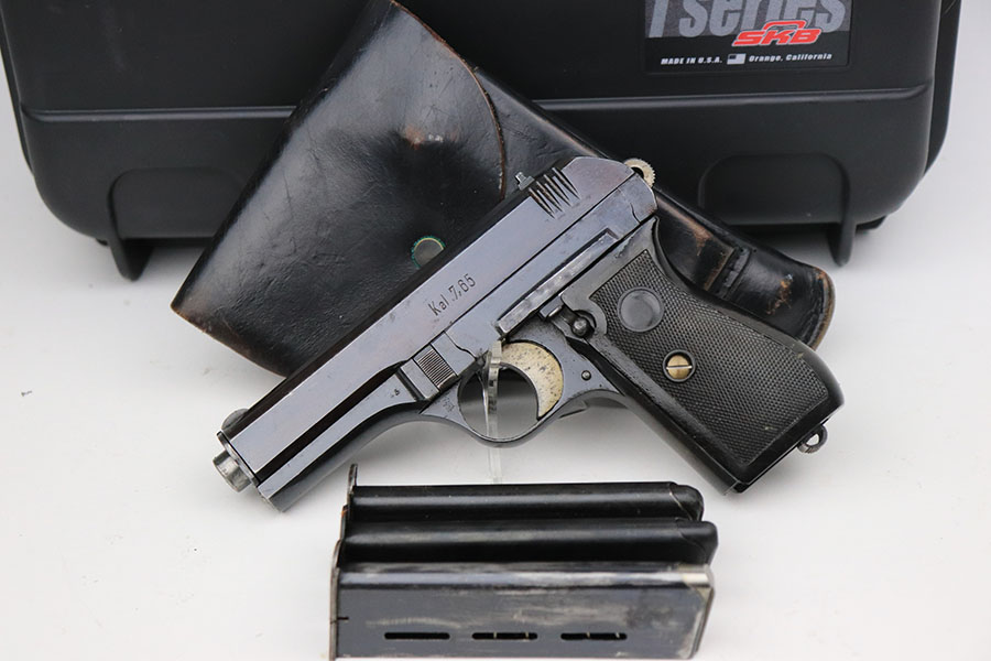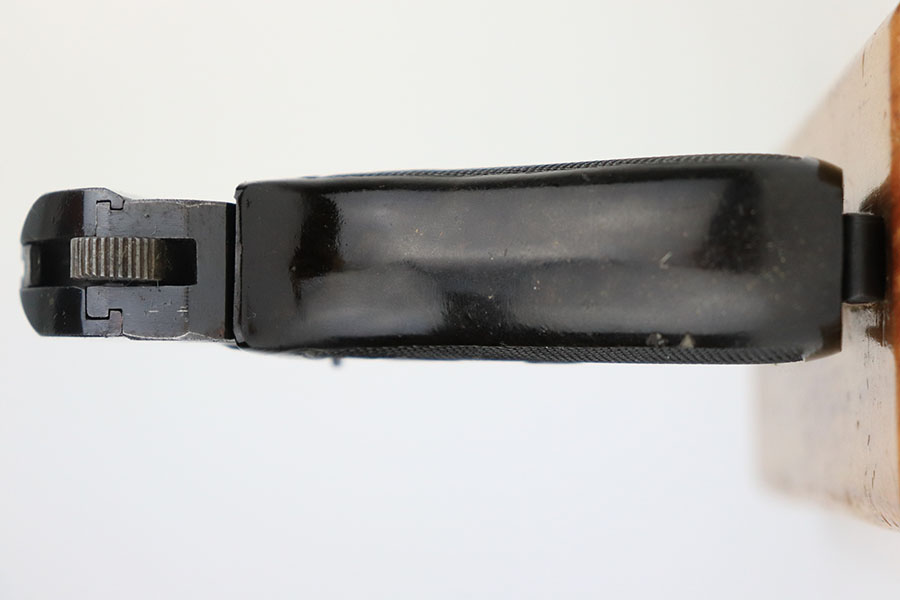 4/8/21 – This is a rare commercial CZ Model 27 rig, the first such example we’ve offered. It features just a ’45 manufacture date, and the Czech lion on the left side of the trigger guard. It also has a desirable serial, ending in 4 zeroes. This pistol was made just after World War II ended, and interestingly features a high-polish finish again rather than the phosphate you’d expect at the end of the war. There’s some freckling in various areas, and some finish loss on the right side of the pistol. The rig includes a total of two original magazines, and one reproduction magazine. One of the originals is police numbered on the base. Holster is also postwar. Comes in a custom storage case, and includes a spare repro grip.