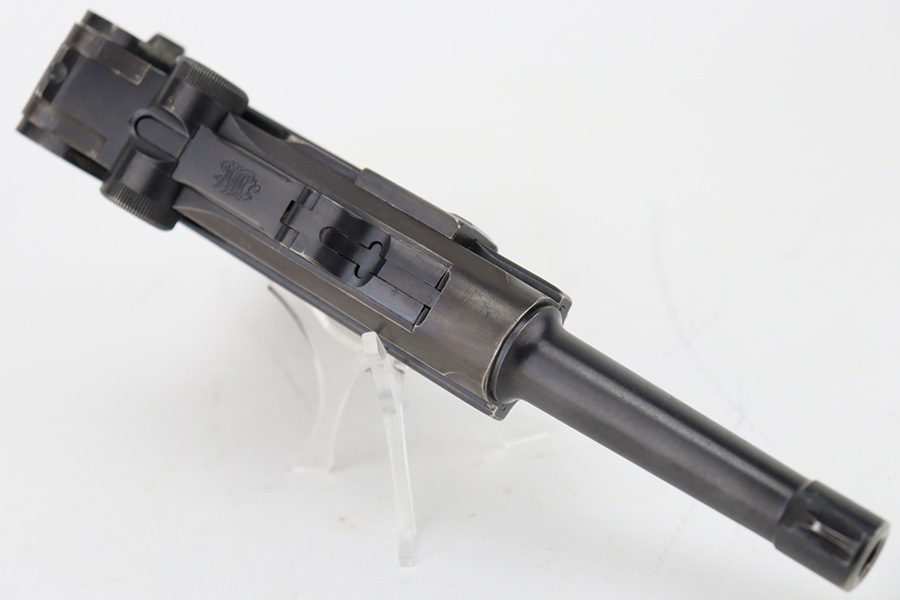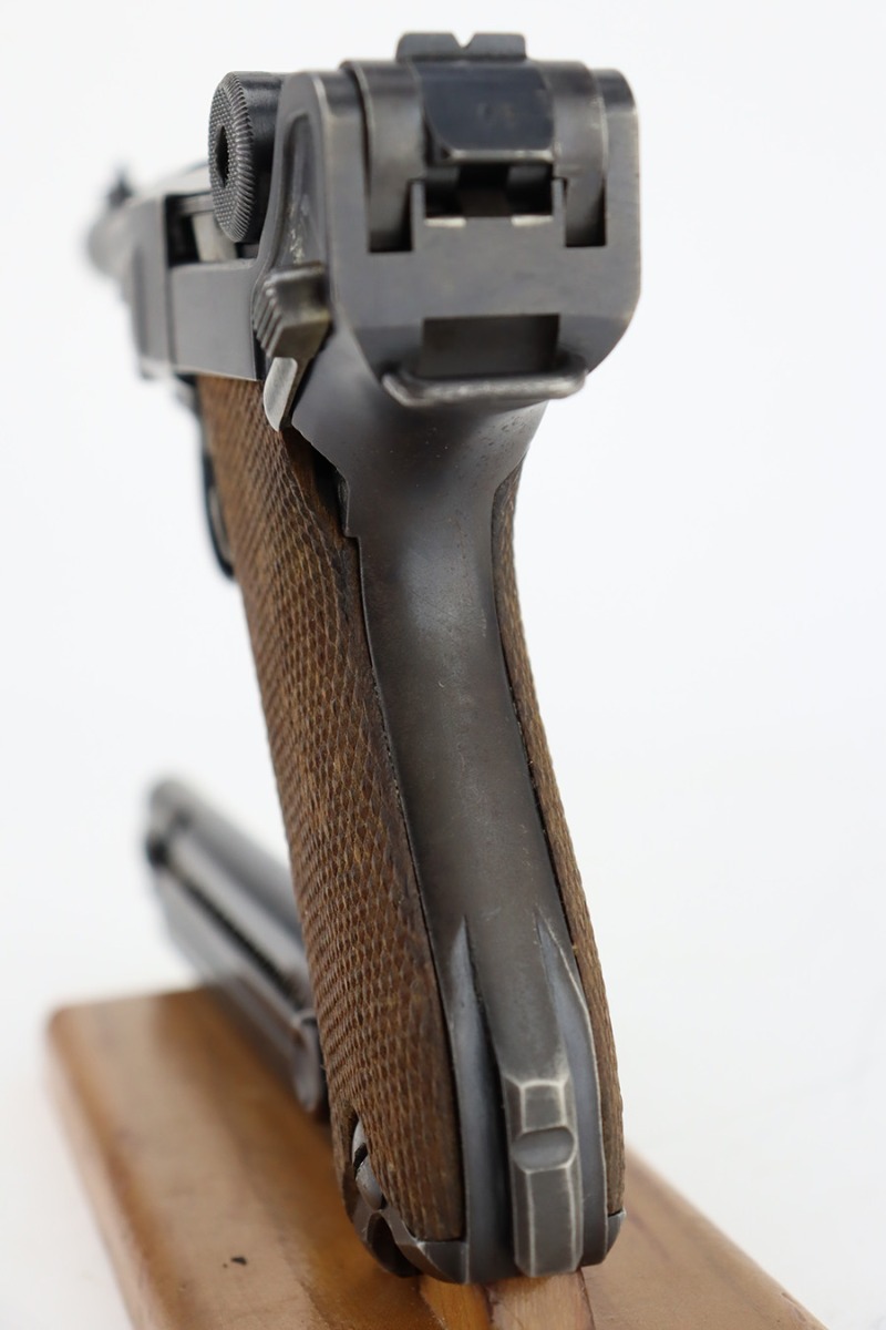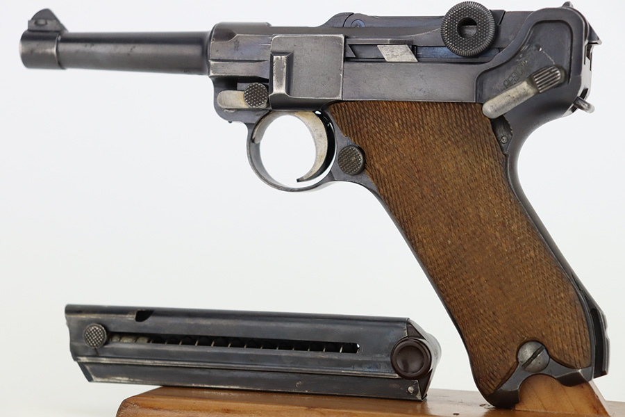 03/18/2024 – For sale is a commercial P08 Luger chambered in .30 Luger. The handgun is clean and retains its original factory bluing. The are some spots of finish wear on the receiver, slide and barrel. This pistol is matching throughout on the frame, Barrel, rear of the toggle, take down lever, and trigger. The wood grips are in good shape but the left grip has some chips around the magazine release and there is a crack on the bottom of the inside. The pistoll comes with an unmarked magazine.