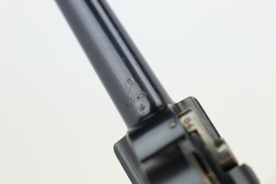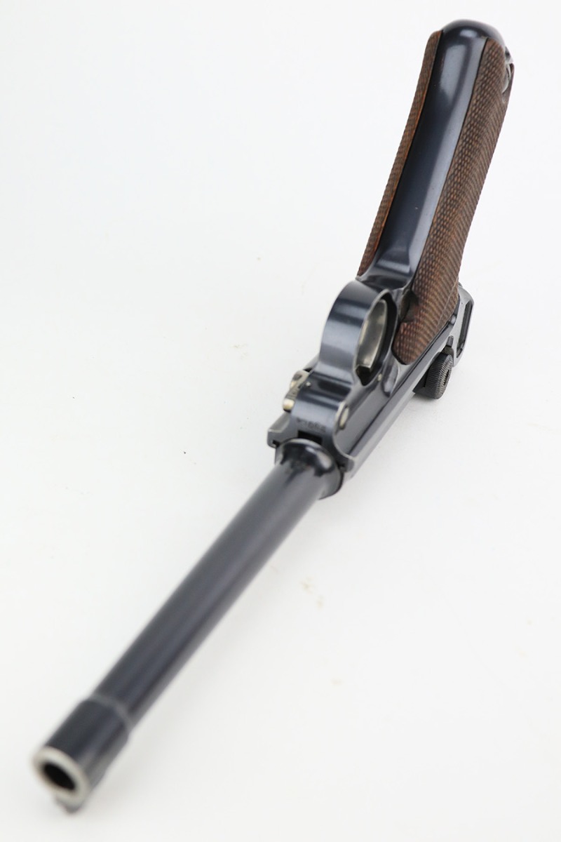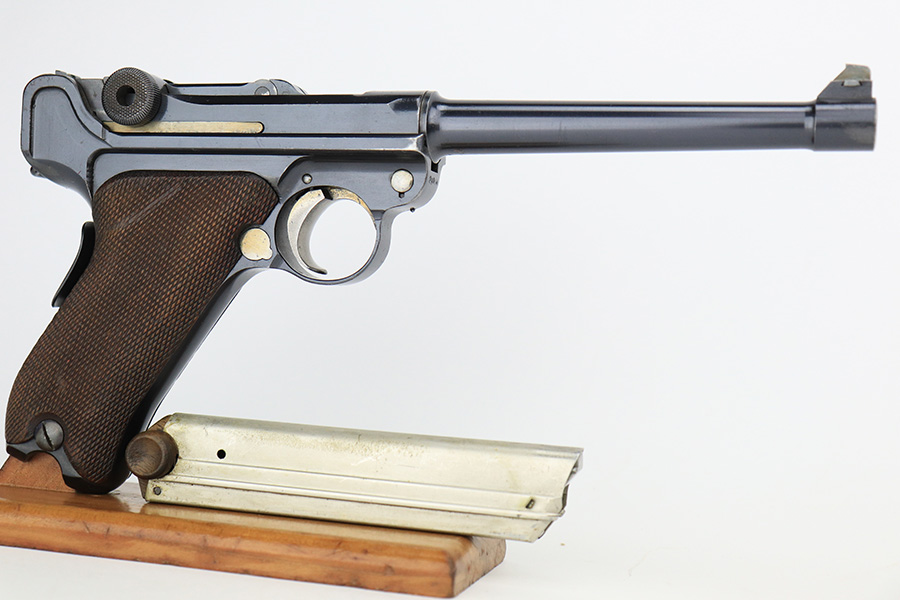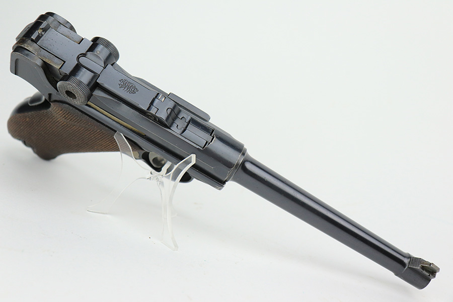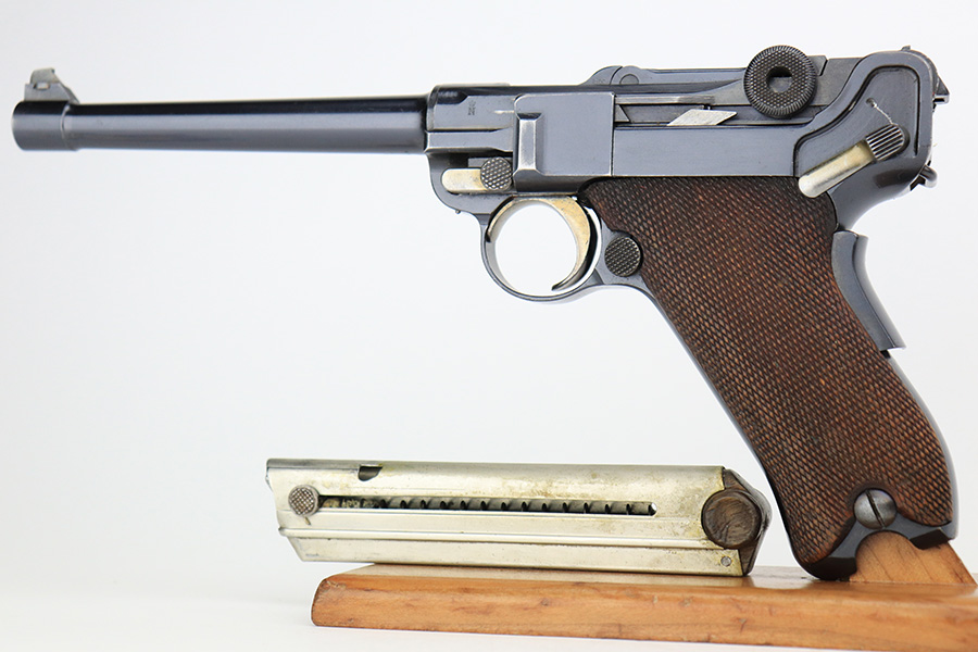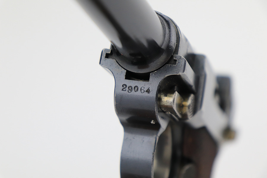 6/5/23 – This is an excellent example of a DWM Model 1906 Luger sold in the commercial market in the early 1900’s. All of the numbered parts are matching, except the barrel. The barrel was replaced with a 6″ Navy-marked barrel. The gun has retained about 97% of its bluing with very minor wear around the muzzle, on the side plate, and on the front edges of the side rails. Fitted with excellent matching-numbered wood grips – some minor bruising on the right side. Comes with a force-matched magazine. Mint bore.
