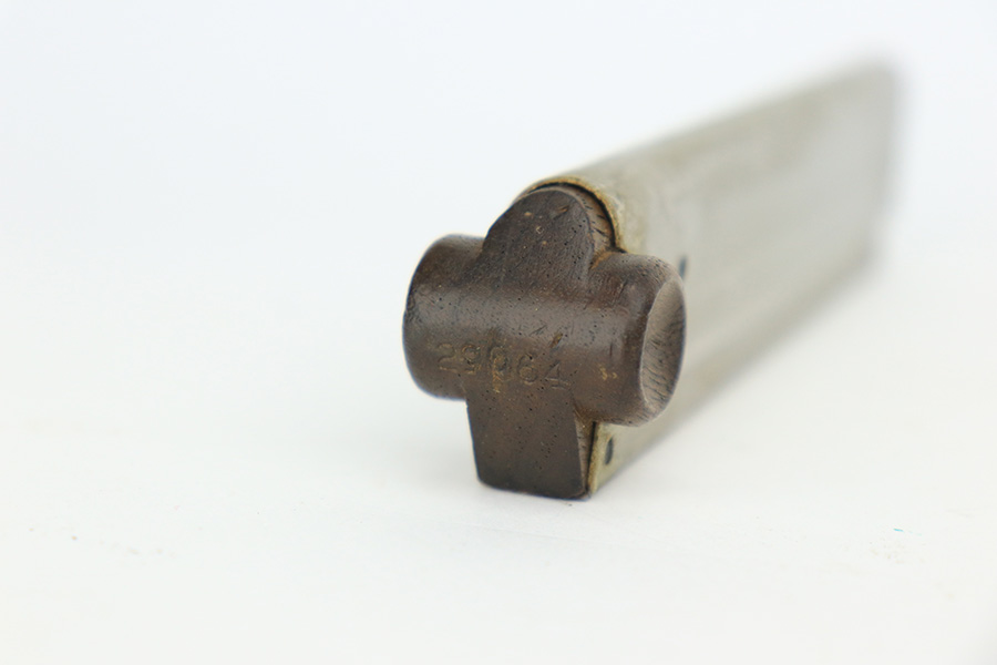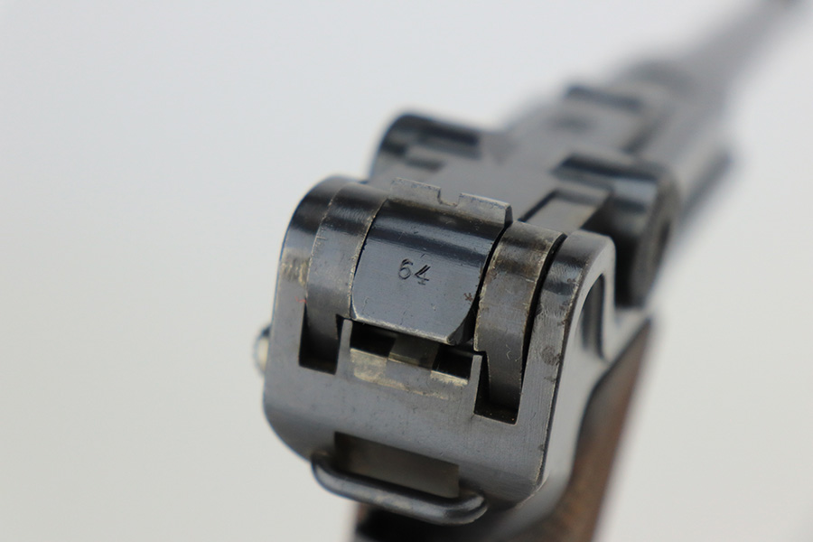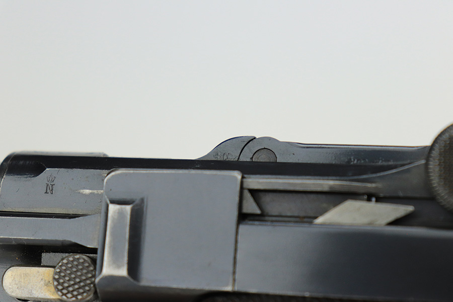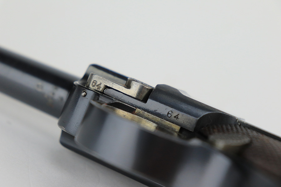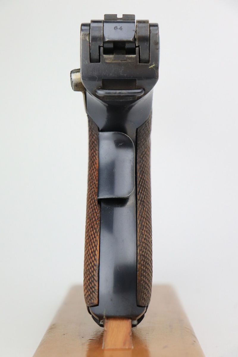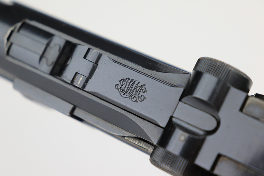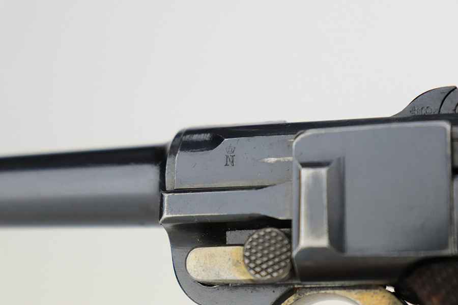 6/5/23 – This is an excellent example of a DWM Model 1906 Luger sold in the commercial market in the early 1900’s. All of the numbered parts are matching, except the barrel. The barrel was replaced with a 6″ Navy-marked barrel. The gun has retained about 97% of its bluing with very minor wear around the muzzle, on the side plate, and on the front edges of the side rails. Fitted with excellent matching-numbered wood grips – some minor bruising on the right side. Comes with a force-matched magazine. Mint bore.