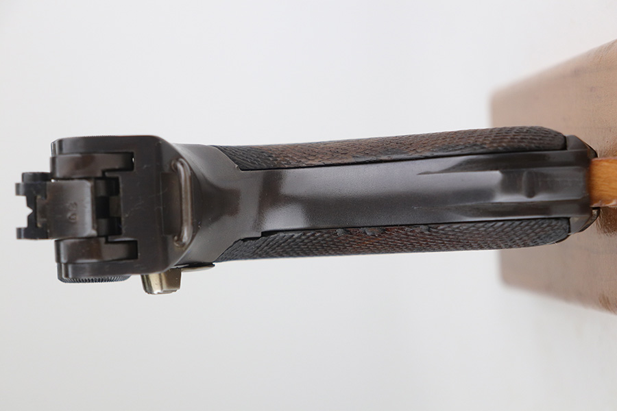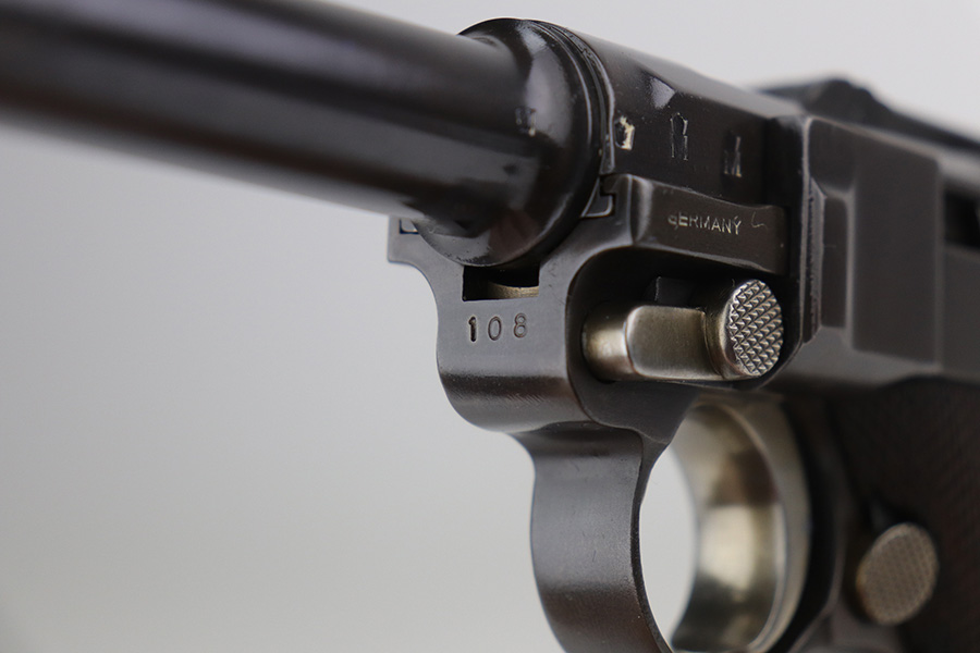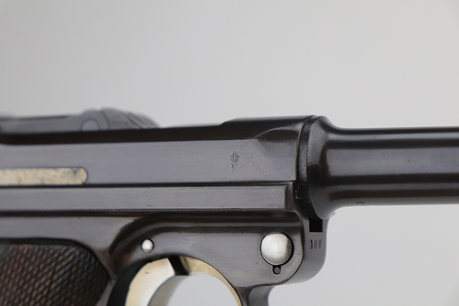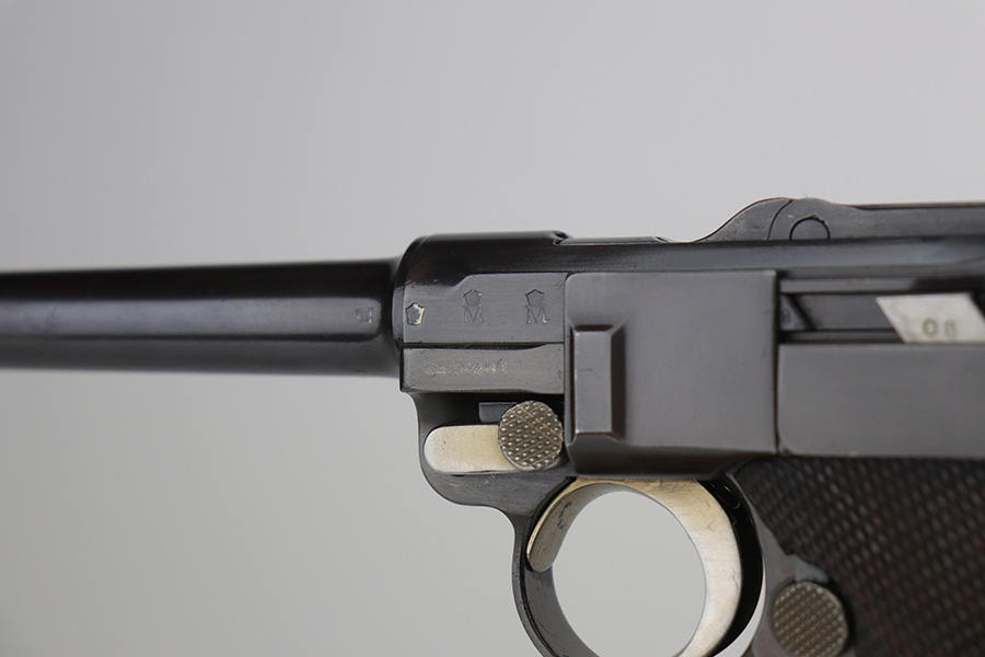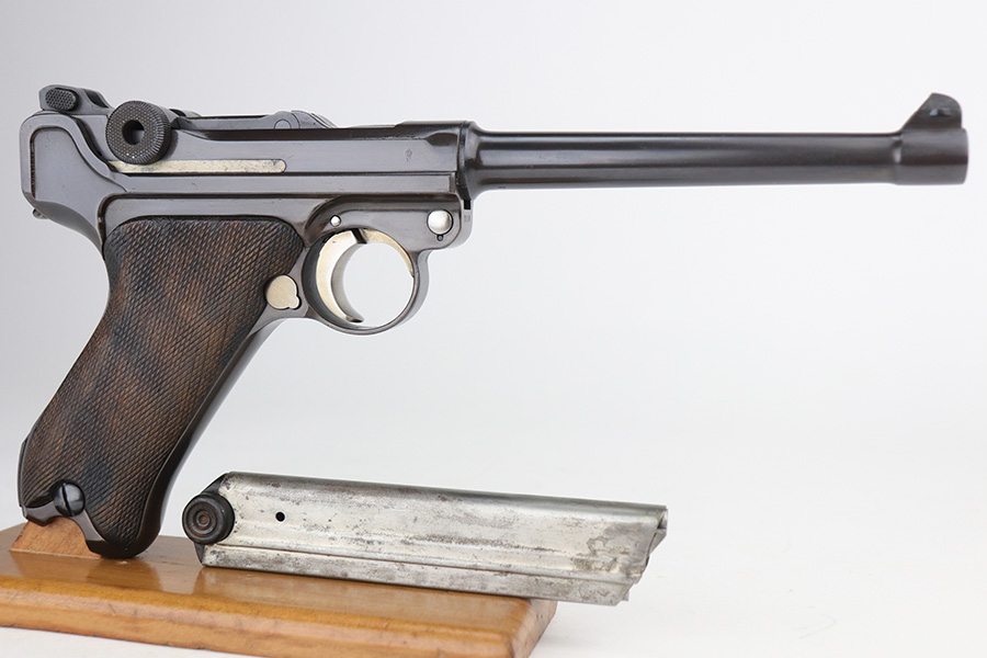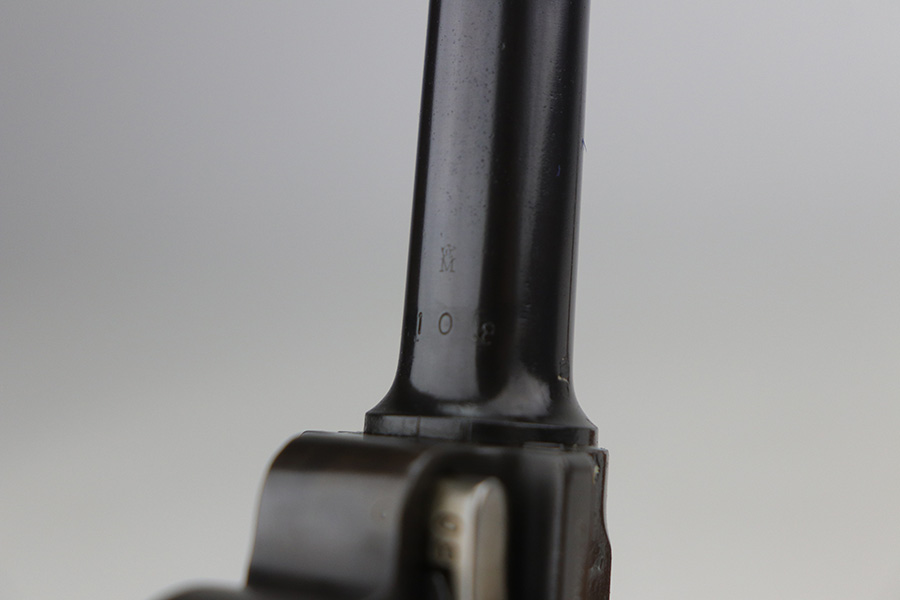 11/3/21 – This is a nice example of a commercial Navy model DWM Luger that was arsenal refinished and export marked for commercial sale in the states. There is no bluing loss overall but it is a refinish and there is some freckling under the blue on the barrel. The Navy proofs are still clear and visible on receiver and barrel. Matching numbers throughout. Comes with rare, original Navy-style magazine with mismatched serial number. The grips show some some smoothing but no cracks or chips, and they are unmarked. Unfortunately, bore shows some pitting and frost throughout.