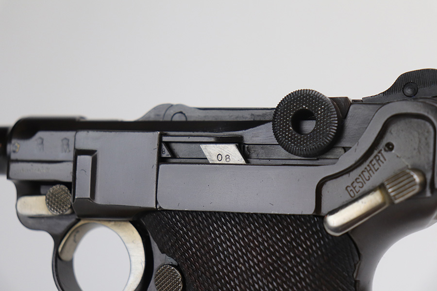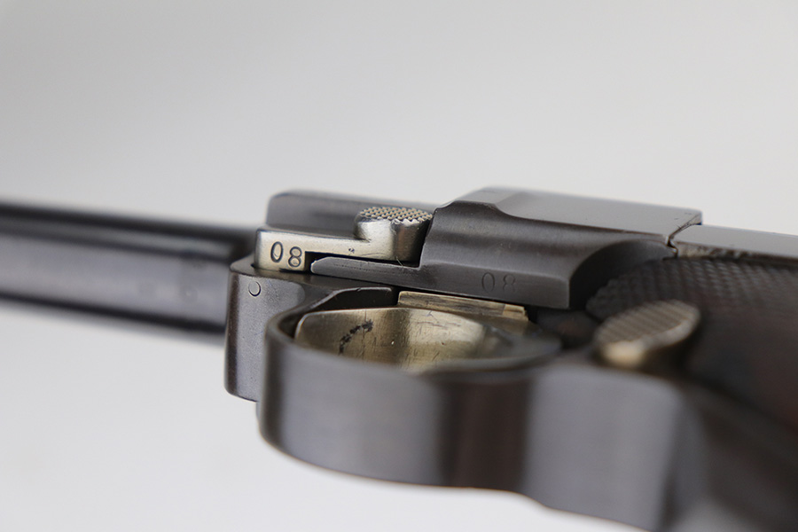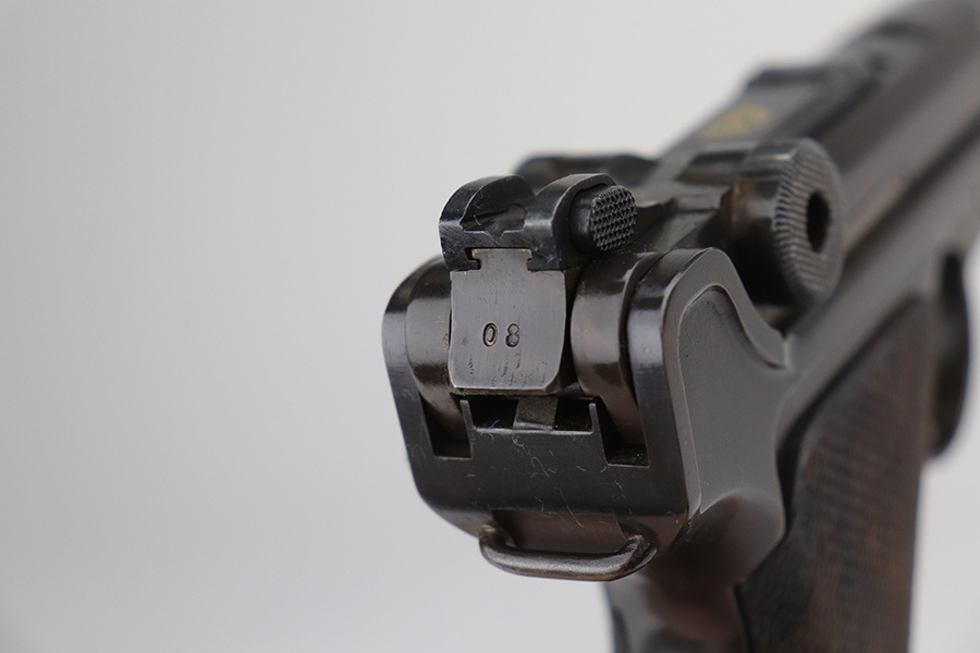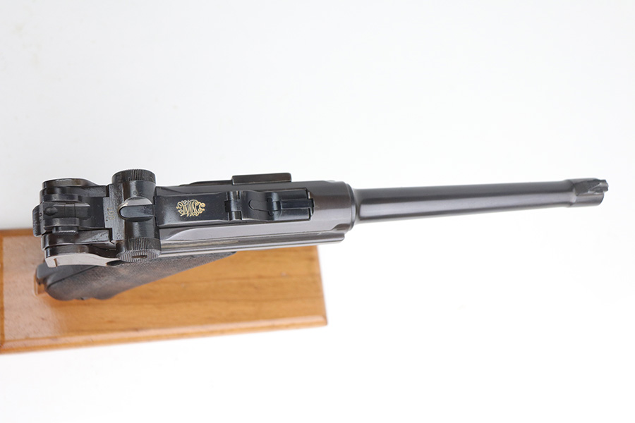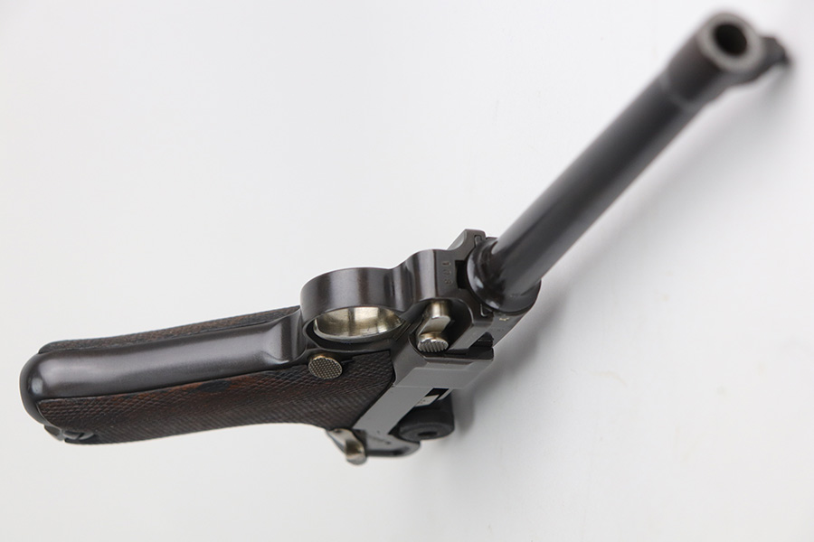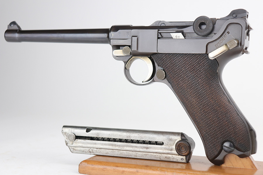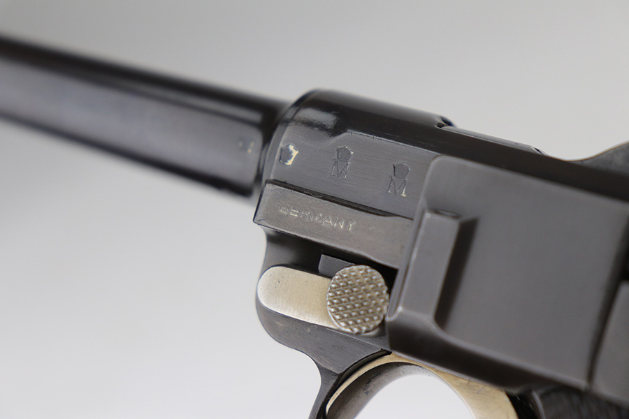11/3/21 – This is a nice example of a commercial Navy model DWM Luger that was arsenal refinished and export marked for commercial sale in the states. There is no bluing loss overall but it is a refinish and there is some freckling under the blue on the barrel. The Navy proofs are still clear and visible on receiver and barrel. Matching numbers throughout. Comes with rare, original Navy-style magazine with mismatched serial number. The grips show some some smoothing but no cracks or chips, and they are unmarked. Unfortunately, bore shows some pitting and frost throughout.