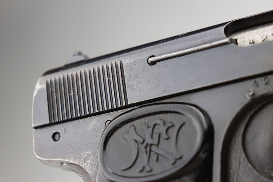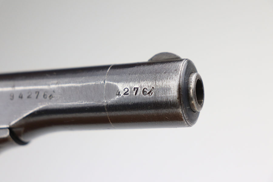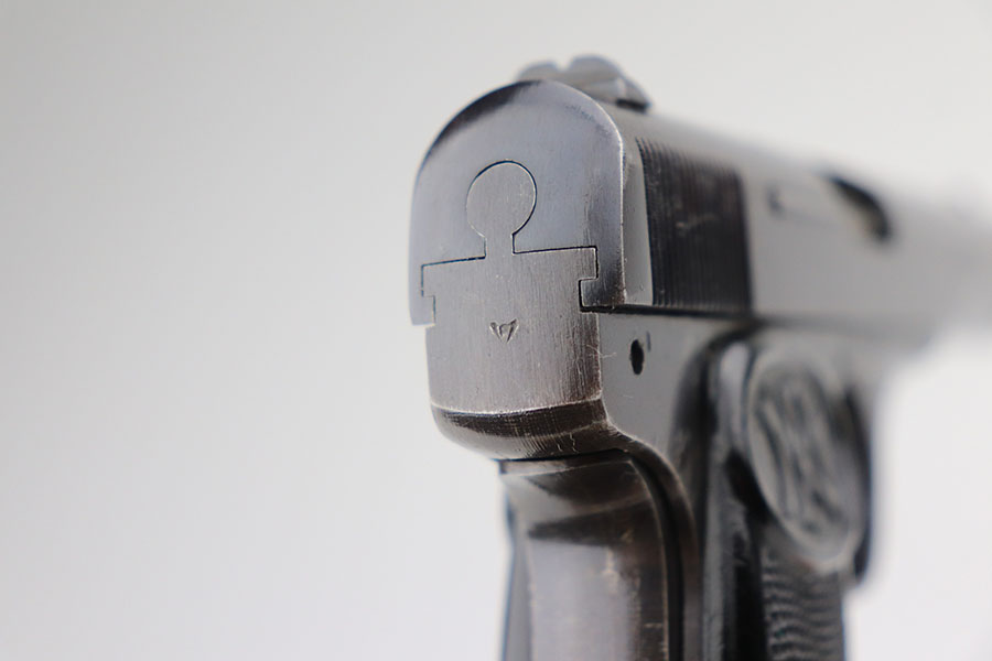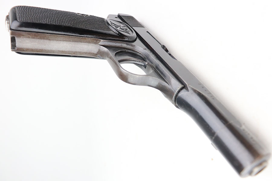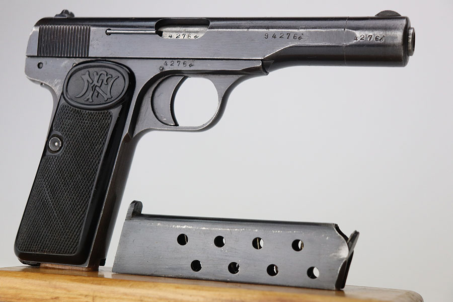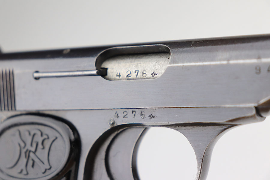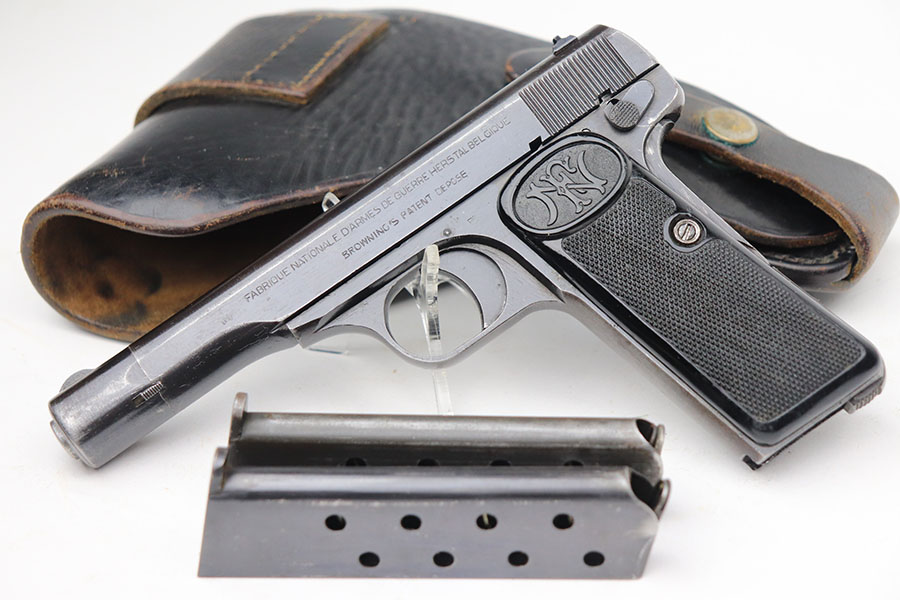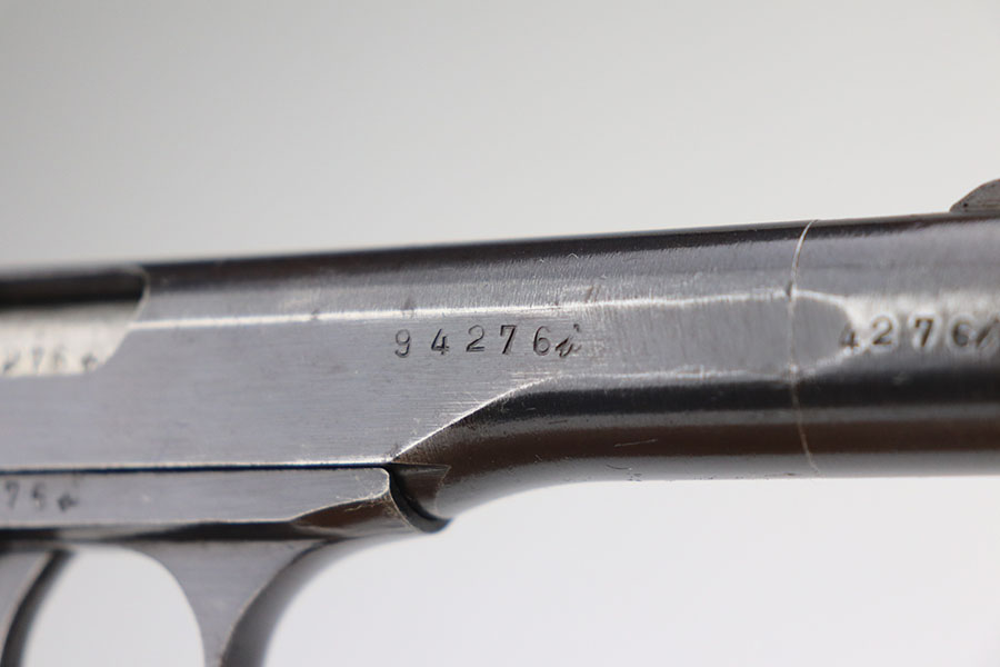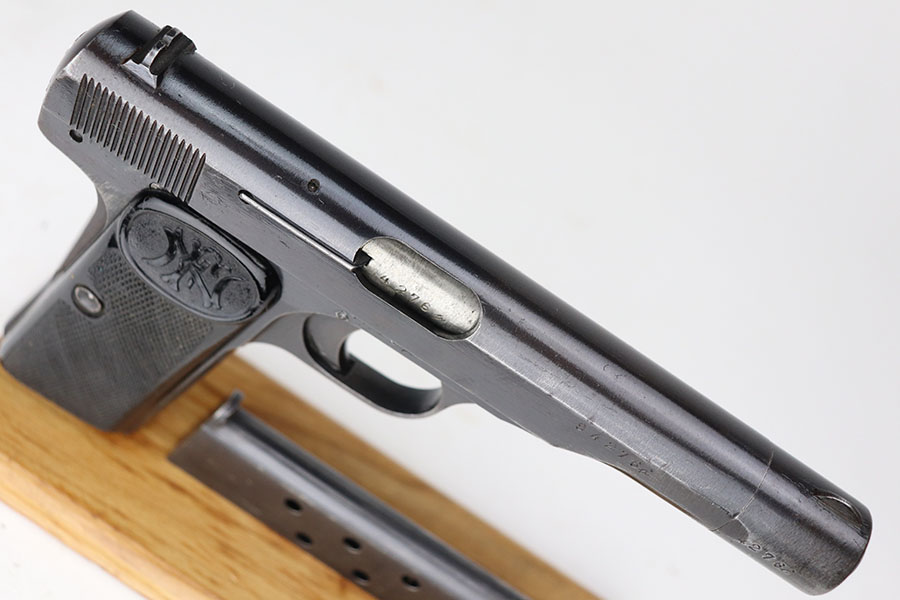 2/8/21 – This is a nice example of an FN Browning Model 1922 rig sold in the commercial market during WW2. It is all matching and has the proper “Eagle N” commercial proofs. The rig comes with a black leather holster and two period-correct magazines. The gun has retained roughly 85% of its original bluing. There is wear around the muzzle, high edges of the slide, and thinning on the straps. There are some handling marks on the right side of the frame near the tang and on the back strap. Comes with excellent black bakelite grips. Excellent bore – shiny with strong rifling.