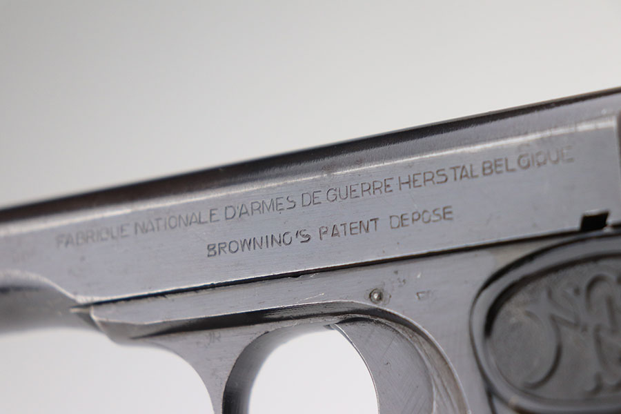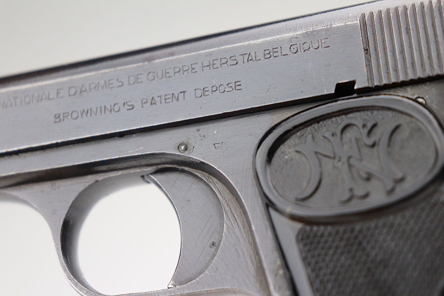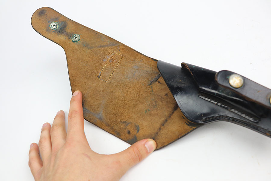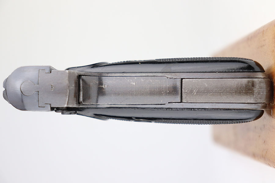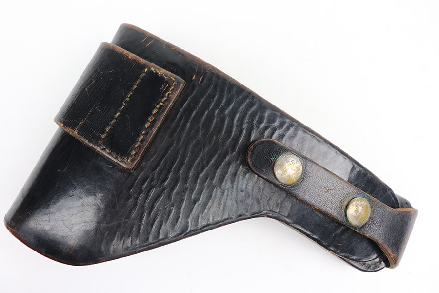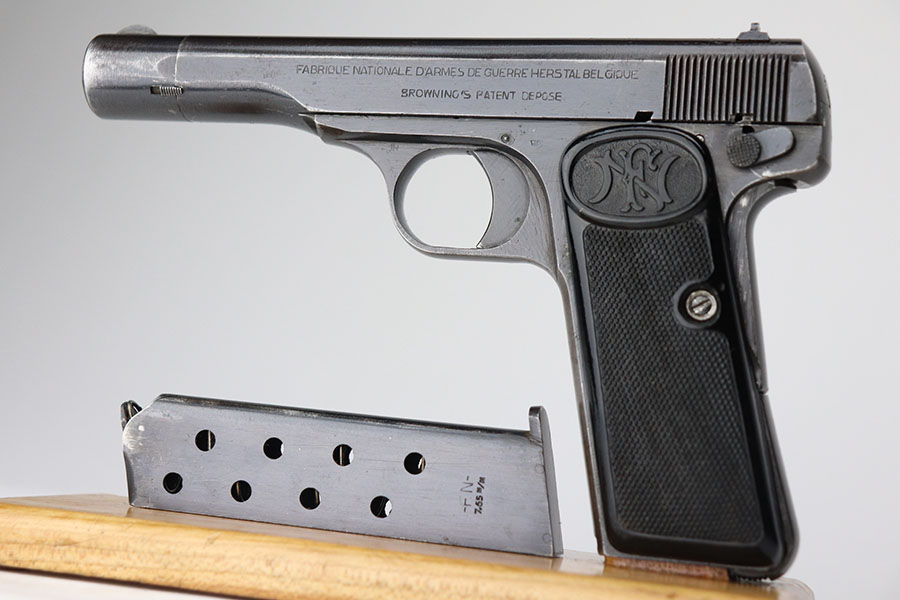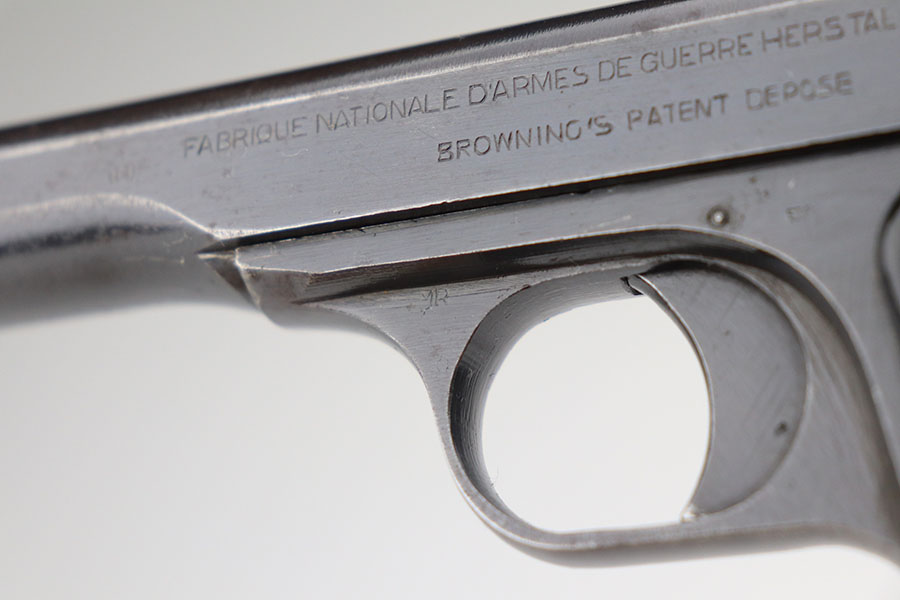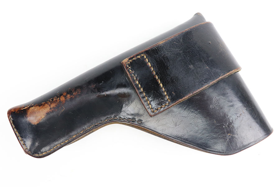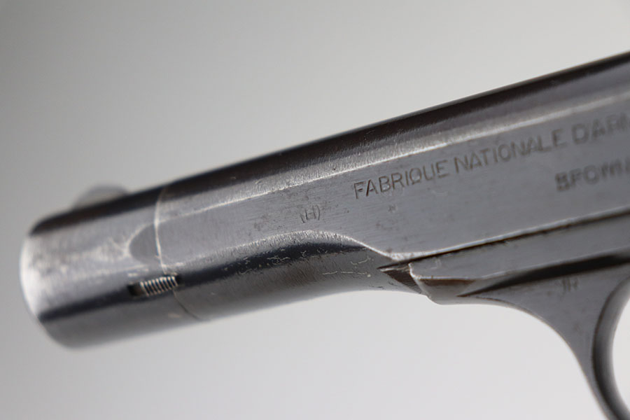 2/8/21 – This is a nice example of an FN Browning Model 1922 rig sold in the commercial market during WW2. It is all matching and has the proper “Eagle N” commercial proofs. The rig comes with a black leather holster and two period-correct magazines. The gun has retained roughly 85% of its original bluing. There is wear around the muzzle, high edges of the slide, and thinning on the straps. There are some handling marks on the right side of the frame near the tang and on the back strap. Comes with excellent black bakelite grips. Excellent bore – shiny with strong rifling.