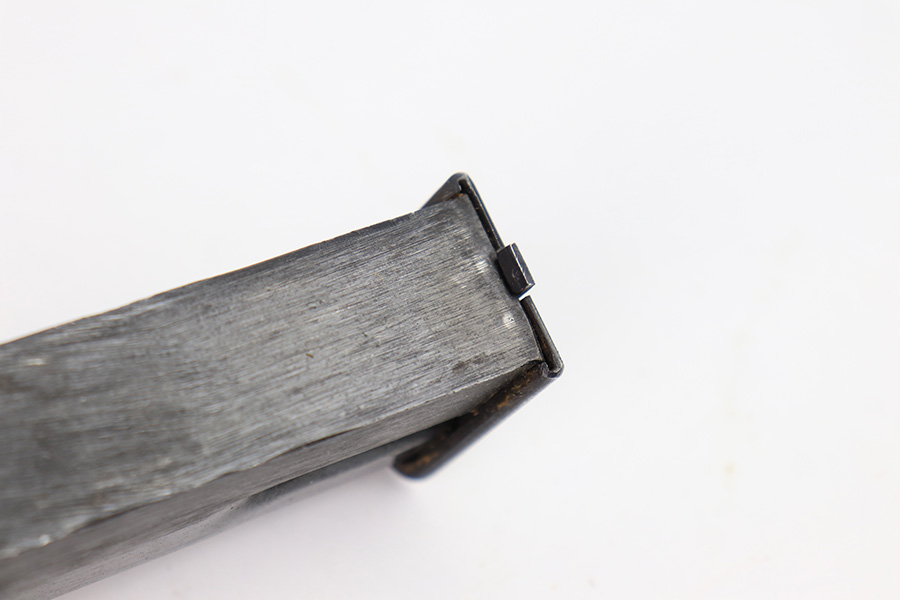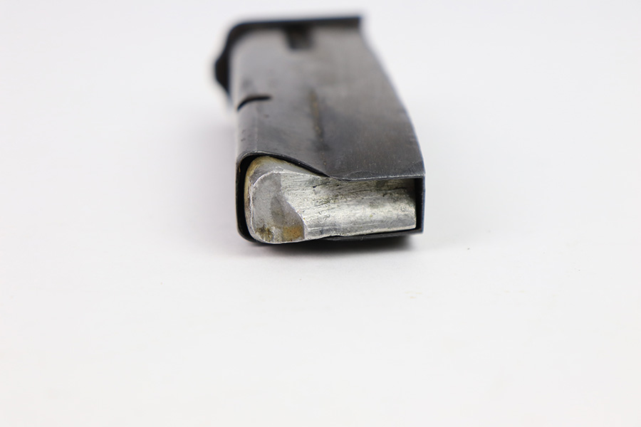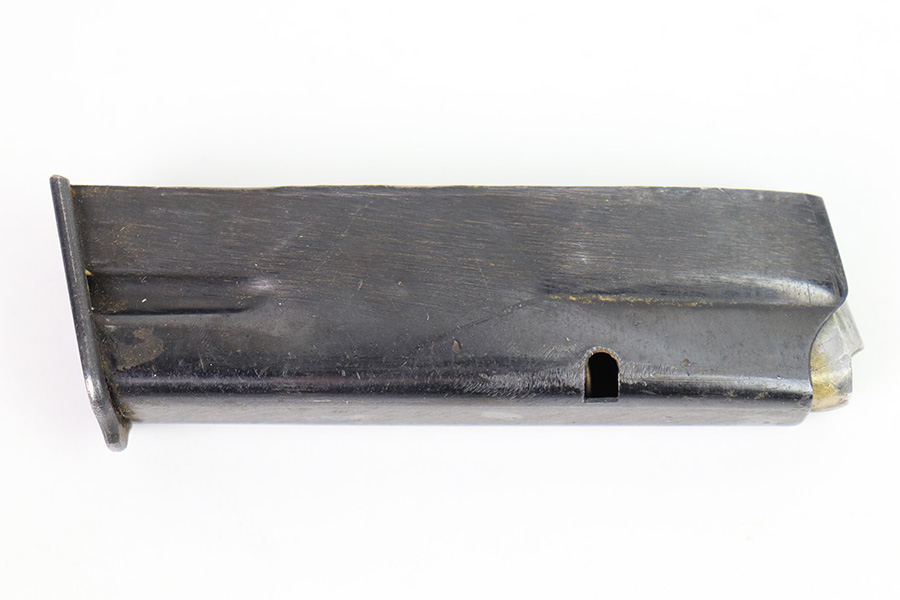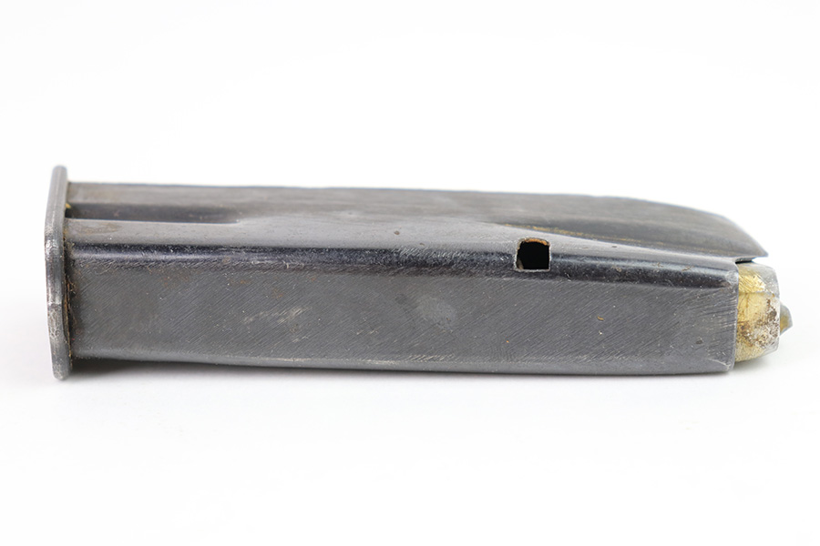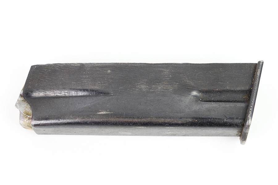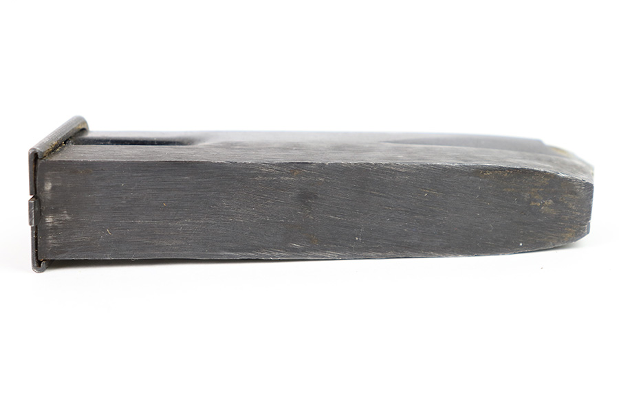 12/27/22 – This is a Commercial High Power magazine from the WW2 era. The magazine shows machine marks on the exterior of the blued finish, and has a WW2 style base. There are no markings or stamps. Holds 15 rounds of 9mm ammunition with a fully functional spring. Great overall condition.