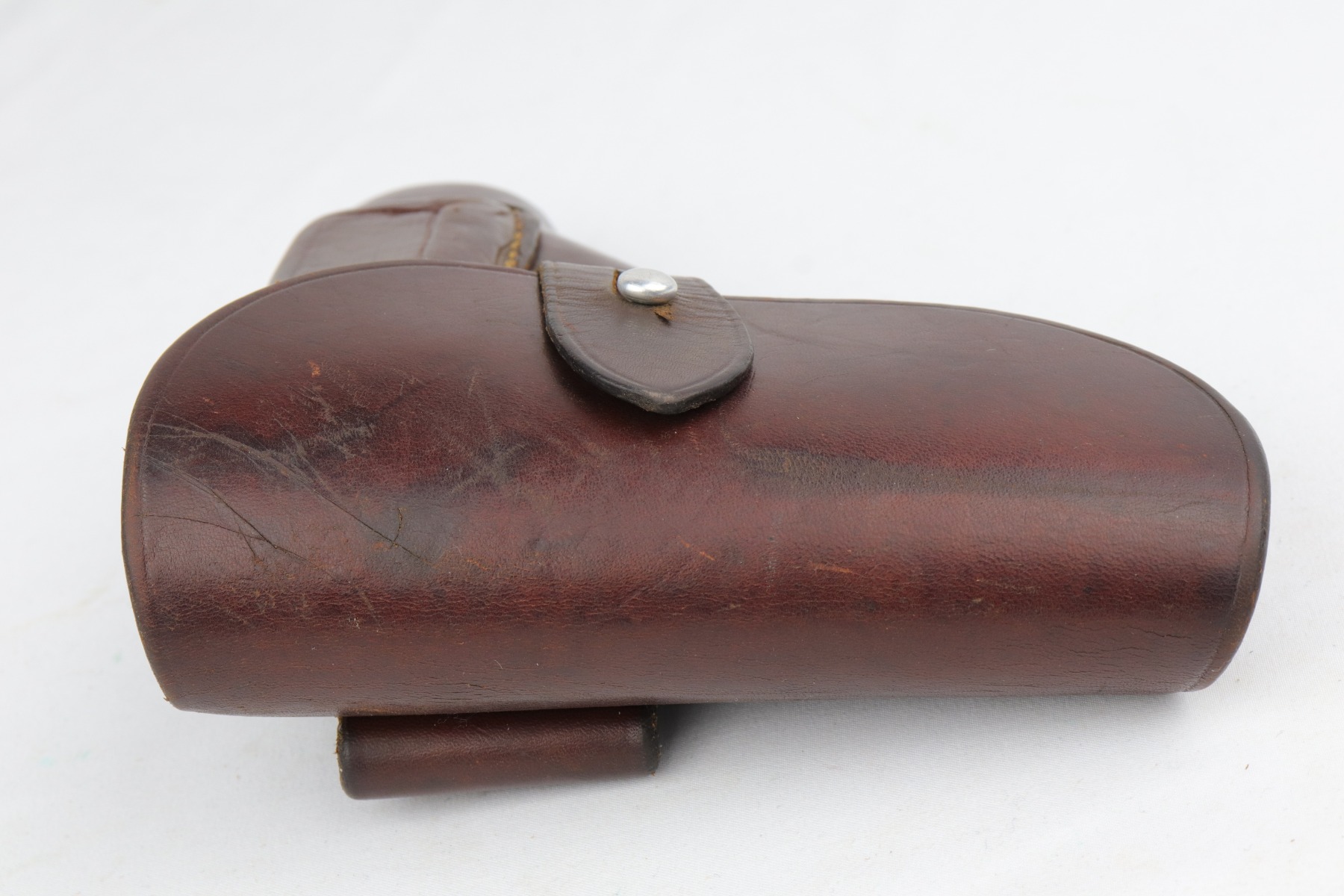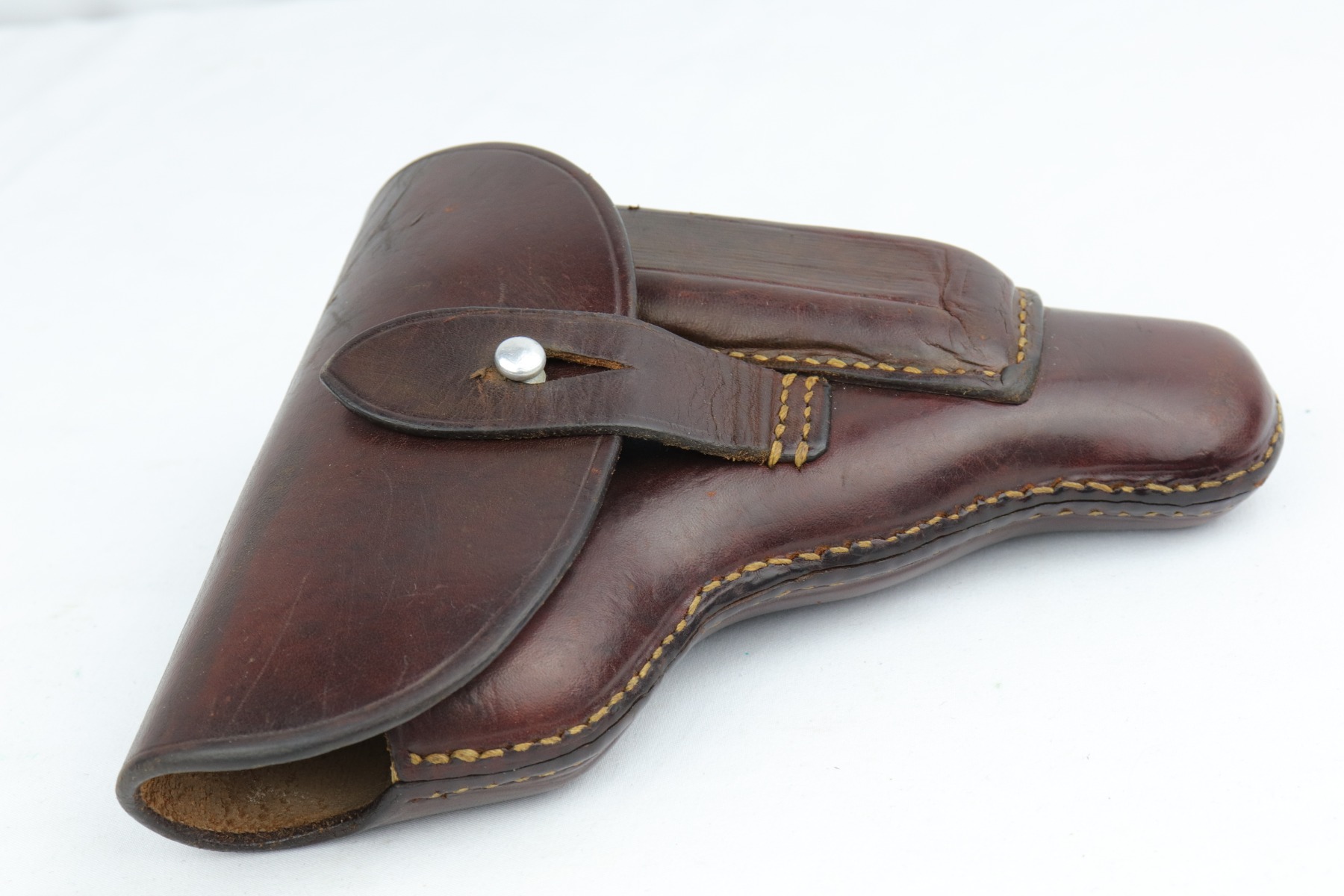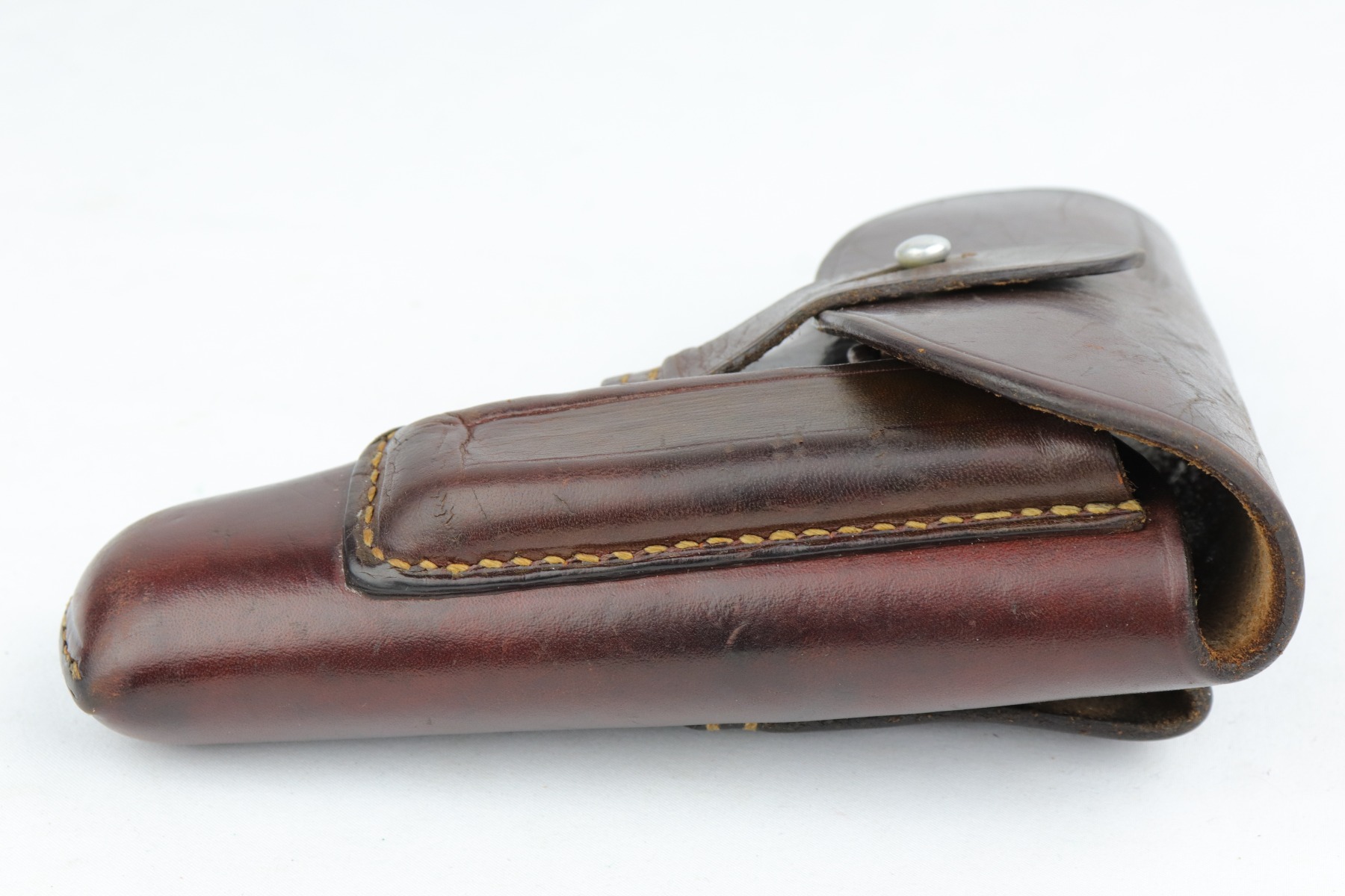 4/10/19 – This is an original hoffman style holster from the WW2 era. The holster has no maker markings or stamps, but the style of leather and stitching indicates late 1930s / early 1940s. The leather is clean and strong with normal pliability. All original stitching is in tact. Fits a Walther PP or any similar sized axis pistol.